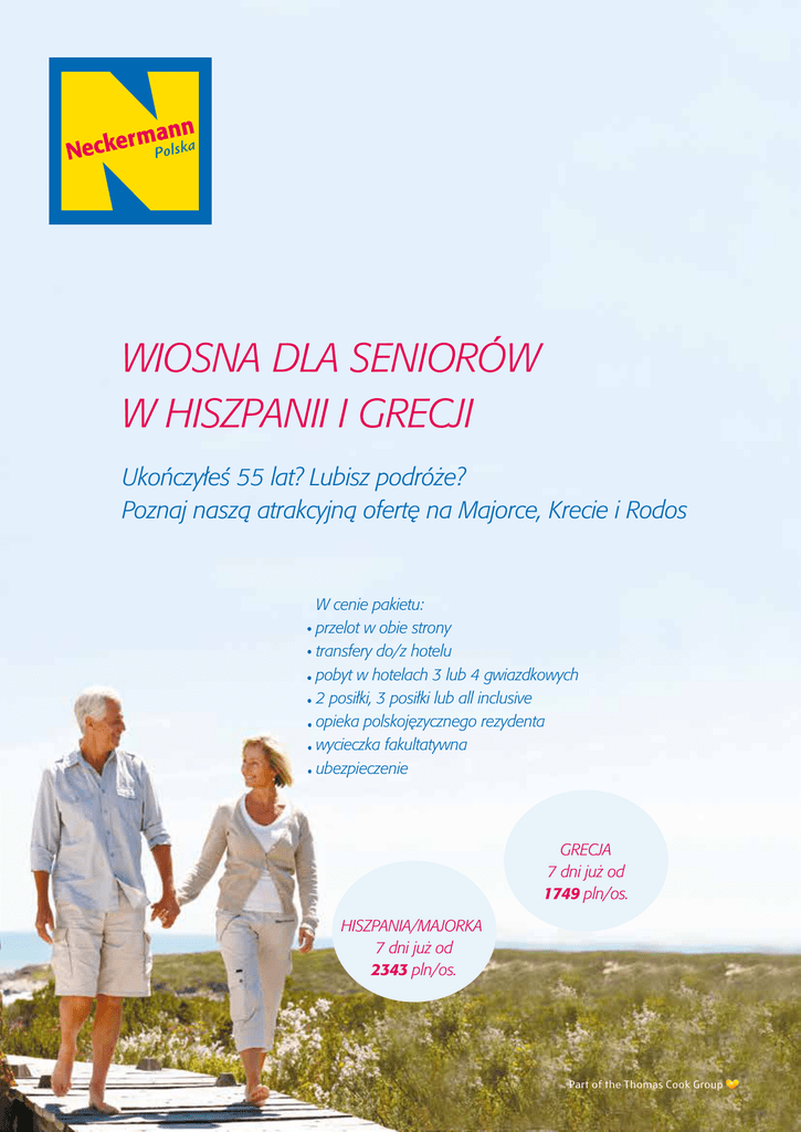 WIOSNA DLA SENIORÓW W HISZPANII I GRECJI Ukończyłeś 55 lat? Lubisz podróże? Poznaj naszą atrakcyjną ofertę na Majorce, Krecie i Rodos W cenie pakietu: przelot w obie strony transfery do/z hotelu pobyt w hotelach 3 lub 4 gwiazdkowych 2 posiłki, 3 posiłki lub all inclusive opieka polskojęzycznego rezydenta wycieczka fakultatywna ubezpieczenie GRECJA 7 dni już od 1749 pln/os. HISZPANIA/MAJORKA 7 dni już od 2343 pln/os. Part of the Thomas Cook Group GRECJA/RODOS Z Warszawy i Katowic: 3.05, 10.05, 17.05, 24.05, 31.05 Hotel Evi NNN+ NPL SENI RHO H52430A/B Położenie: kilka minut pieszo od centrum Faliraki, gdzie znajdują się liczne sklepy, restauracje, bary i punkty rozrywki. Plaża: długa, piaszczysto-żwirowa, publiczna, oddalona ok. 800 m od hotelu. Leżaki, parasole za opłatą. Wyposażenie: 336 pokoi w dziewięciu budynkach. Recepcja, sejfy (za opłatą), winda, kącik wypoczynkowy z TV sat., restauracja główna z tarasem, bar, minimarket. Na zewnątrz znajduje się basen główny ze słodką wodą, 2 baseny przy budynkach bocznych (jeden z mini zjeżdżalniami), tarasy słoneczne, bar przy basenie. Leżaki i parasole słoneczne w cenie. Kategoria grecka: B Zakwaterowanie: Pokoje dwuosobowe (A1-3A): klimatyzacja, lodówka, telefon, balkon lub taras. Wanna lub prysznic, WC. Apartamenty (B2-4A): 1 przestronny pokój, dodatkowo wnęka kuchenna; wyposażone jak pokoje dwuosobowe. Rozrywka: raz na 2 tyg. wieczór grecki. Dostęp do Internetu: kącik internetowy oraz Wi-Fi za opłatą. Sport: tenis stołowy, siatkówka. Za opłatą: bilard, masaże. All inclusive: 3 posiłki: śniadanie, obiad i kolacja w formie bufetu. Lokalne napoje alkoholowe i bezalkoholowe, kawa, herbata w godz. 10-23.00. Kanapki, lody w godz. 11-12.30. Wypieki, ciasto, lody w godz. 16-18.30. d lusive już o 7 dni, all inc 1749,- WYCIECZKA FAKULTATYWNA - WOKÓŁ WYSPY RODOS Malownicze winnice, uśpione wioski, codzienne życie uśmiechniętych i gościnnych mieszkańców – to tylko niektóre elementy greckiego krajobrazu, jakie poznają Państwo podczas wycieczki objazdowej po wyspie. Jadąc wzdłuż oliwnych gajów, cytrynowych sadów, poprzez malownicze osady, dotrą Państwo do Lindos. Wspaniałe Akropolis oraz leżąca u podnóża góry tradycyjna, grecka wioska z pewnością Państwa oczarują. Następnie udadzą się Państwo do miasta Rodos. W trakcie spaceru po starym mieście zobaczą Państwo m.in. Pałac Wielkiego Mistrza, kościoły, meczety, wąskie kamienne uliczki. Na zakończenie wycieczki zobaczą Państwo wzgórze Monte Smith, na którym podziwiać można pozostałości po starożytnym mieście Rodos oraz Port Mandraki, gdzie według legendy stał niegdyś słynny Kolos Rodyjski. Part of the Thomas Cook Group pln/os. GRECJA/RODOS Z Warszawy i Katowic: 3.05, 10.05, 17.05, 24.05, 31.05 Hotel Blue Sky Beach NNNN NPL SENI RHO H52540A Położenie: ok. 10 minut spacerem od centrum oraz starego miasta. Restauracje, bary, sklepy, punkty rozrywki w pobliżu. Plaża: publiczna, piaszczysto-żwirowa, oddzielona tylko ulicą nadbrzeżną od hotelu. Leżaki, parasole słoneczne za opłatą. Wyposażenie: 182 pokoje rozmieszczone na 6 piętrach. Hol powitalny z recepcją, 2 windy, sala TV, bar, restauracja bufetowa, minimarket, sklep z pamiątkami. Na terenie zewnętrznym znajdują się basen ze słodką wodą, taras słoneczny oraz bar z przekąskami. Leżaki, materace i parasole przy basenie w cenie. www.blueskyhotel.gr Kategoria grecka: A. Zakwaterowanie: przyjemnie urządzone Pokoje dwuosobowe (2-3A): klimatyzacja (1.06-30.09), TV sat., radio, sejf (za opłatą), telefon, minibar (za opłatą), balkon. Wanna lub prysznic, WC, suszarka. Z widokiem na morze (2-3B). Pokoje jednoosobowe (1A): bez balkonu, poza tym wyposażone jak pokoje dwuosobowe. Pokoje - wariant ekonomiczny (2S): bez balkonu, poza tym wyposażone jak pokoje dwuosobowe. Pokoje superior z widokiem na morze (2-3C): dodatkowo: odtwarzacz CD/DVD, szlafrok, poza tym wyposażone jak pokoje dwuosobowe. Rozrywka: liczne możliwości rozrywki na pobliskiej starówce. Dostęp do Internetu: kącik internetowy oraz Wi-Fi na terenie hotelu za opłatą Sport: za opłatą: siłownia, sauna, łaźnia parowa, masaże, zabiegi kosmetyczne oraz sporty wodne oferowane przez lokalne agencje na plaży. Z dwoma posiłkami: śniadanie i kolacja w formie bufetu. WCZEŚNIEJ = TANIEJ do 31.01.14 20% ZNIŻKI, 1.02-30.04.14 10% ZNIŻKI DNI GRATIS: 7=6, 14=12 w terminach 17.04-1.06.14 przy rez. w terminach 1.05-31.05.14 osiłki już od 7 dni, dwa p 1913,- WYCIECZKA FAKULTATYWNA - WOKÓŁ WYSPY RODOS Malownicze winnice, uśpione wioski, codzienne życie uśmiechniętych i gościnnych mieszkańców – to tylko niektóre elementy greckiego krajobrazu, jakie poznają Państwo podczas wycieczki objazdowej po wyspie. Jadąc wzdłuż oliwnych gajów, cytrynowych sadów, poprzez malownicze osady, dotrą Państwo do Lindos. Wspaniałe Akropolis oraz leżąca u podnóża góry tradycyjna, grecka wioska z pewnością Państwa oczarują. Następnie udadzą się Państwo do miasta Rodos. W trakcie spaceru po starym mieście zobaczą Państwo m.in. Pałac Wielkiego Mistrza, kościoły, meczety, wąskie kamienne uliczki. Na zakończenie wycieczki zobaczą Państwo wzgórze Monte Smith, na którym podziwiać można pozostałości po starożytnym mieście Rodos oraz Port Mandraki, gdzie według legendy stał niegdyś słynny Kolos Rodyjski. Part of the Thomas Cook Group pln/os. GRECJA/KRETA Z Warszawy: 4.05., 11.05, 18.05., 25.05 Z Katowic: 28.05. Hotel Maravel Land NNN+ NPL SENI HER H53163A Położenie: w strefie turystycznej, w miejscowości Adelianos Kampos. Bary, restauracje i sklepy w pobliżu. Do centrum pięknej starówki w Rethymno ok. 6 km. Obok hotelu znajduje się przystanek autobusowy. Plaża: bezpośrednio przy długiej piaszczysto- żwirowej plaży (zalecane obuwie kąpielowe), leżaki i parasole na plaży za opłatą. Wyposażenie: kameralny, popularny hotel,