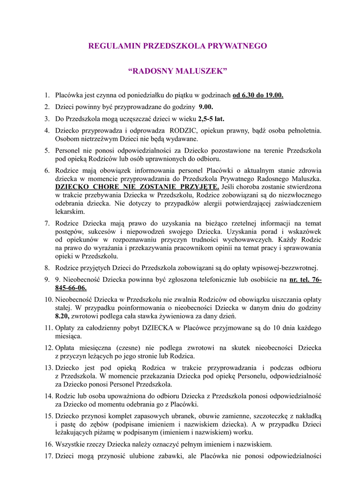 REGULAMIN PRZEDSZKOLA PRYWATNEGO “RADOSNY MALUSZEK” 1. Placówka jest czynna od poniedziałku do piątku w godzinach od 6.30 do 19.00. 2. Dzieci powinny być przyprowadzane do godziny 9.00. 3. Do Przedszkola mogą uczęszczać dzieci w wieku 2,5-5 lat. 4. Dziecko przyprowadza i odprowadza RODZIC, opiekun prawny, bądź osoba pełnoletnia. Osobom nietrzeźwym Dzieci nie będą wydawane. 5. Personel nie ponosi odpowiedzialności za Dziecko pozostawione na terenie Przedszkola pod opieką Rodziców lub osób uprawnionych do odbioru. 6. Rodzice mają obowiązek informowania personel Placówki o aktualnym stanie zdrowia dziecka w momencie przyprowadzania do Przedszkola Prywatnego Radosnego Maluszka. DZIECKO CHORE NIE ZOSTANIE PRZYJĘTE. Jeśli choroba zostanie stwierdzona w trakcie przebywania Dziecka w Przedszkolu, Rodzice zobowiązani są do niezwłocznego odebrania dziecka. Nie dotyczy to przypadków alergii potwierdzającej zaświadczeniem lekarskim. 7. Rodzice Dziecka mają prawo do uzyskania na bieżąco rzetelnej informacji na temat postępów, sukcesów i niepowodzeń swojego Dziecka. Uzyskania porad i wskazówek od opiekunów w rozpoznawaniu przyczyn trudności wychowawczych. Każdy Rodzic na prawo do wyrażania i przekazywania pracownikom opinii na temat pracy i sprawowania opieki w Przedszkolu. 8. Rodzice przyjętych Dzieci do Przedszkola zobowiązani są do opłaty wpisowej-bezzwrotnej. 9. 9. Nieobecność Dziecka powinna być zgłoszona telefonicznie lub osobiście na nr. tel. 76845-66-06. 10. Nieobecność Dziecka w Przedszkolu nie zwalnia Rodziców od obowiązku uiszczania opłaty stałej. W przypadku poinformowania o nieobecności Dziecka w danym dniu do godziny 8.20, zwrotowi podlega cała stawka żywieniowa za dany dzień. 11. Opłaty za całodzienny pobyt DZIECKA w Placówce przyjmowane są do 10 dnia każdego miesiąca. 12. Opłata miesięczna (czesne) nie podlega zwrotowi na skutek nieobecności Dziecka z przyczyn leżących po jego stronie lub Rodzica. 13. Dziecko jest pod opieką Rodzica w trakcie przyprowadzania i podczas odbioru z Przedszkola. W momencie przekazania Dziecka pod opiekę Personelu, odpowiedzialność za Dziecko ponosi Personel Przedszkola. 14. Rodzic lub osoba upoważniona do odbioru Dziecka z Przedszkola ponosi odpowiedzialność za Dziecko od momentu odebrania go z Placówki. 15. Dziecko przynosi komplet zapasowych ubranek, obuwie zamienne, szczoteczkę z nakładką i pastę do zębów (podpisane imieniem i nazwiskiem dziecka). A w przypadku Dzieci leżakujących piżamę w podpisanym (imieniem i nazwiskiem) worku. 16. Wszystkie rzeczy Dziecka należy oznaczyć pełnym imieniem i nazwiskiem. 17. Dzieci mogą przynosić ulubione zabawki, ale Placówka nie ponosi odpowiedzialności za uszkodzenia. 18. Za zabawki lub inne rzeczy, które Dziecko zepsuje w Przedszkolu, koszty ponoszą rodzice. 19. Placówka zapewnia: śniadanie, obiad złożony z dwóch dań, podwieczorek, dowolną ilość napojów w ciągu dnia. 20. Nauczyciel otacza indywidualną opieką, każdego ze swoich Wychowanków i utrzymuje kontakt z ich Rodzicami. 21. Rezygnację z pobytu w Prywatnym Przedszkolu Radosny Maluszek należy zgłosić do końca miesiąca w którym Dziecko przestaje uczęszczać do Placówki. Zgłoszenie rezygnacji po rozpoczęciu następnego miesiąca powoduje naliczanie opłaty za ten miesiąc. 22. Rodzice zobowiązani są do czytania ogłoszeń umieszczanych na tablicy informacyjnej.