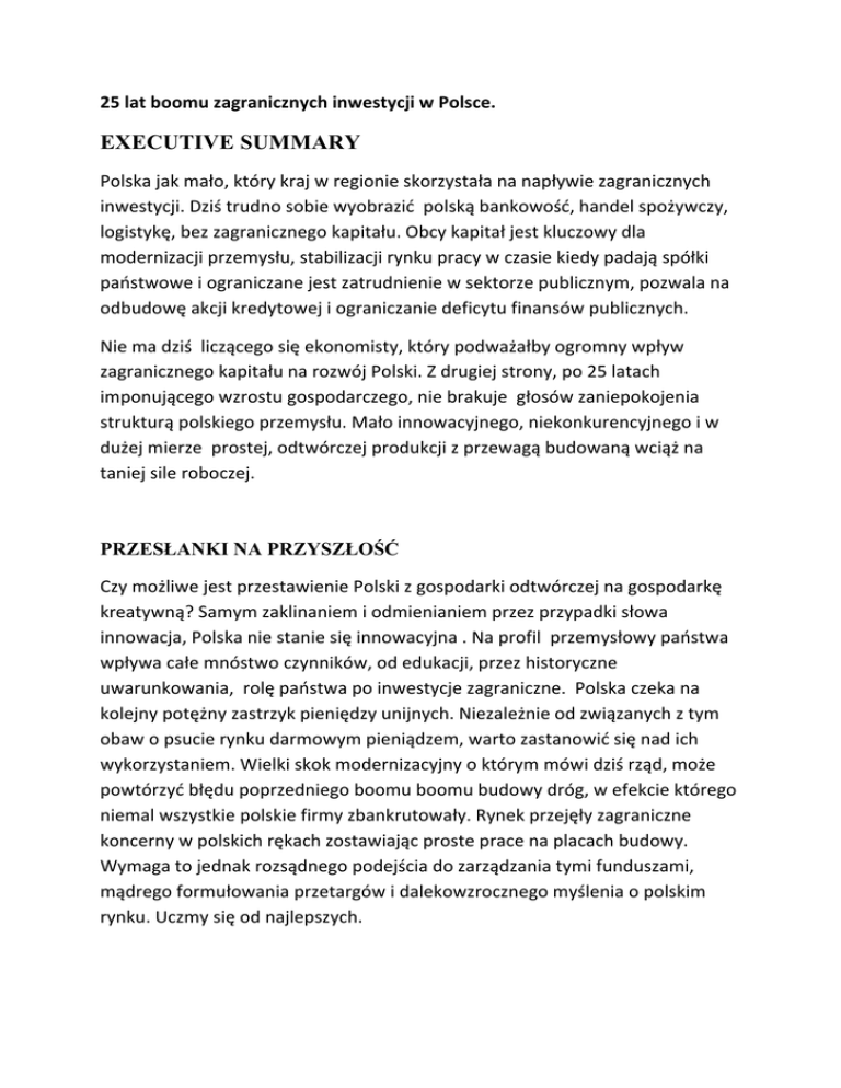 25 lat boomu zagranicznych inwestycji w Polsce. EXECUTIVE SUMMARY Polska jak mało, który kraj w regionie skorzystała na napływie zagranicznych inwestycji. Dziś trudno sobie wyobrazić polską bankowość, handel spożywczy, logistykę, bez zagranicznego kapitału. Obcy kapitał jest kluczowy dla modernizacji przemysłu, stabilizacji rynku pracy w czasie kiedy padają spółki państwowe i ograniczane jest zatrudnienie w sektorze publicznym, pozwala na odbudowę akcji kredytowej i ograniczanie deficytu finansów publicznych. Nie ma dziś liczącego się ekonomisty, który podważałby ogromny wpływ zagranicznego kapitału na rozwój Polski. Z drugiej strony, po 25 latach imponującego wzrostu gospodarczego, nie brakuje głosów zaniepokojenia strukturą polskiego przemysłu. Mało innowacyjnego, niekonkurencyjnego i w dużej mierze prostej, odtwórczej produkcji z przewagą budowaną wciąż na taniej sile roboczej. PRZESŁANKI NA PRZYSZŁOŚĆ Czy możliwe jest przestawienie Polski z gospodarki odtwórczej na gospodarkę kreatywną? Samym zaklinaniem i odmienianiem przez przypadki słowa innowacja, Polska nie stanie się innowacyjna . Na profil przemysłowy państwa wpływa całe mnóstwo czynników, od edukacji, przez historyczne uwarunkowania, rolę państwa po inwestycje zagraniczne. Polska czeka na kolejny potężny zastrzyk pieniędzy unijnych. Niezależnie od związanych z tym obaw o psucie rynku darmowym pieniądzem, warto zastanowić się nad ich wykorzystaniem. Wielki skok modernizacyjny o którym mówi dziś rząd, może powtórzyć błędu poprzedniego boomu boomu budowy dróg, w efekcie którego niemal wszystkie polskie firmy zbankrutowały. Rynek przejęły zagraniczne koncerny w polskich rękach zostawiając proste prace na placach budowy. Wymaga to jednak rozsądnego podejścia do zarządzania tymi funduszami, mądrego formułowania przetargów i dalekowzrocznego myślenia o polskim rynku. Uczmy się od najlepszych. MIĘDZYNARODOWE DOŚWIADCZENIA Stany Zjednoczone , czempion wolnorynkowej retoryki, jak wiele innych najpotężniejszych gospodarek świata, stosują cały szereg restrykcji względem zagraniczne inwestorów. Wybitny brytyjski ekonomista Ha-‐Joon Chang w głośnej ostatnio książce – „Mity Wolnego Handlu i Tajna historia Kapitalizmu” dowodzi tezy, że większość dzisiejszych potęg gospodarczych zawdzięcza swoją obecną pozycję całej restryktywnej i planowej politycy inwestycyjnej. Chang przeprowadził dogłębną analizę rynku azjatyckiego. Porównując Azjatyckie tygrysy do państw, które zostały z jakichś względów z tyłu za Koreą czy Japonią. Okazuje się, że najwyżej rozwinięte państwa Azji przez wiele lat były jednymi z najbardziej restrykcyjnych obszarów inwestycyjnych. Japonia, Korea, Taiwan jeszcze do niedawna wpuszczały na swój rynek niemal jedynie kapitał, który pozwalał im na przechwytywanie technologii, budowę przewagi konkurencyjnej w wybranych przez siebie branżach. Przestroga Wietnamu Po drugiej stronie azjatyckiego rynku mamy takie kraje jak Wietnam i przez wiele lat Indie, które bez większych ograniczeń wpuszczały każdy obcy kapitał inwestycyjny. Wietnam jest klasycznym przypadkiem, który dzięki polityce otwartości, w krótkim czasie dokonał ogromnych postępów. Szybko podniósł poziom życia i ograniczył ubóstwo. Rósł, rósł i stanął w miejscu. Ekonomiści zwracają uwagę, że Wietnam nie wypracował sobie wyraźnej przewagi konkurencyjnej, poza niską ceną pracy. Inwestycje lokowane były wyłącznie w największych ośrodkach miejskich, burząc strukturę demograficzną państwa i zwiększając dysproporcje między regionami. W miarę jak ceny siły roboczej zaczęły rosnąć, szybko ubywało też zagranicznych inwestycji. W 1999 zagraniczne koncerny zostawiły w Wietnamie 179 mld w 10 lat później było to już zaledwie 143 mld i dziś stopa inwestycyjna spada, podczas gdy w Korei, w miarę usuwania niektórych restrykcji handlowych i otwierania rynku, inwestycje w czasie rosną a nie maleją. Przestroga Nigerii Nie doszukując się nawet zbyt wielu paraleli między Polską a innymi państwami, należy z większą ostrożnością patrzeć na politykę pełnej otwartości. Nie, żeby wolny rynek sam w sobie stanowił zagrożenie, ale wolny rynek w powiązaniu z ograniczenia mi w innych państwach może spowodować, napływ „kapitału oportunistycznego „ – jak go nazwało dwóch innych amerykańskich ekonomistów badających inwestycje zagraniczne w Afryce. Michael Paul Todaro i Stephen Smith, autorzy książki „Ekonomia Rozwoju” . Opisali fenomen ekspansji gospodarczej w oparciu o napływ inwestycji ucieczkowych. Chodzi o ucieczkę od np. sztywnych regulacji środowiskowych i ograniczeń własnościowych w innych krajach w regionie. W Nigerii łatwy dostęp do ziemi ściągnął wielkie międzynarodowe tuczarnie obchodzące wyśrubowane normy ekologiczne w innych państwach. Znacząca część inwestycji to farmy eksperymentujące z najróżniejszymi odmianami hodowli i upraw modyfikowanych. Nie tylko tworzą zagrożenie środowiskowe, ale również ograniczają rozwój lokalnego rolnictwa. Kolejny, „szkodliwe” inwestycje – to inwestycje pasywne. Kraje nie stawiające większych ograniczeń inwestorom, przyciągają sporo kapitału nastawionego na prostą produkcję, czy eksploatację surowców. Zjawisko doskonale zostało opisane na przykładzie Nigerii, ale z podobnym fenomenem mamy do czynienia w Wietnamie w Meksyku czy na Węgrzech i nawet w Rosji. 40 lat aktywności inwestycyjnych w Nigerii, podobnie jak w Meksyku, zamiast do wyraźnego wzrostu dobrobytu, doprowadziło do zwiększonego rozwarstwienia. Gdzie obok wąskiej ale silnej, klasy multi-‐milionerów, mamy duże obszary ubóstwa i embrionalną klasę średnią. Przypadek węgierski Węgry w 2010, spośród wszystkich państw dawnego obozu radzieckiego, były państwem z największym udziałem kapi