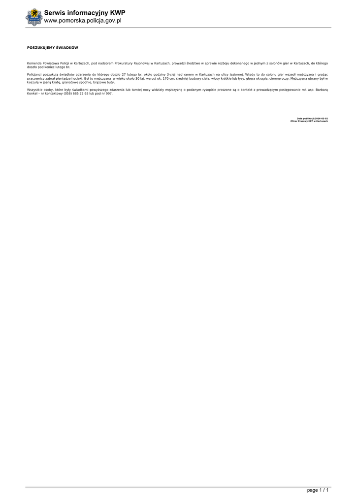 Serwis informacyjny KWP www.pomorska.policja.gov.pl POSZUKUJEMY ŚWIADKÓW Komenda Powiatowa Policji w Kartuzach, pod nadzorem Prokuratury Rejonowej w Kartuzach, prowadzi śledztwo w sprawie rozboju dokonanego w jednym z salonów gier w Kartuzach, do którego doszło pod koniec lutego br. Policjanci poszukują świadków zdarzenia do którego doszło 27 lutego br. około godziny 3-ciej nad ranem w Kartuzach na ulicy Jeziornej. Wtedy to do salonu gier wszedł mężczyzna i grożąc pracownicy zabrał pieniądze i uciekł. Był to mężczyzna w wieku około 30 lat, wzrost ok. 170 cm, średniej budowy ciała, włosy krótkie lub łysy, głowa okrągła, ciemne oczy. Mężczyzna ubrany był w koszulę w jasną kratę, granatowe spodnie, brązowe buty. Wszystkie osoby, które były świadkami powyższego zdarzenia lub tamtej nocy widziały mężczyznę o podanym rysopisie proszone są o kontakt z prowadzącym postępowanie mł. asp. Barbarą Konkel – nr kontaktowy (058) 685 22 63 lub pod nr 997. Data publikacji:2016-03-02 Oficer Prasowy KPP w Kartuzach page 1 / 1 Powered by TCPDF (www.tcpdf.org)