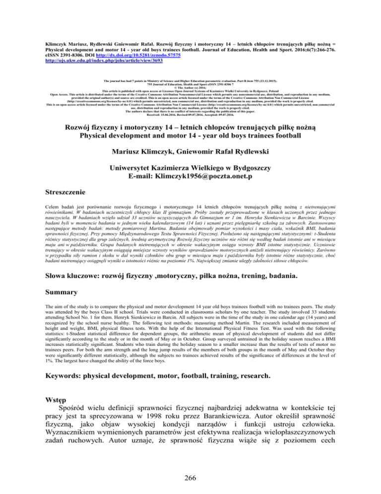 Klimczyk Mariusz, Rydlewski Gniewomir Rafał. Rozwój fizyczny i motoryczny 14 – letnich chłopców trenujących piłkę nożną = Physical development and motor 14 - year old boys trainees football. Journal of Education, Health and Sport. 2016;6(7):266-276. eISSN 2391-8306. DOI http://dx.doi.org/10.5281/zenodo.57575 http://ojs.ukw.edu.pl/index.php/johs/article/view/3693 The journal has had 7 points in Ministry of Science and Higher Education parametric evaluation. Part B item 755 (23.12.2015). 755 Journal of Education, Health and Sport eISSN 2391-8306 7 © The Author (s) 2016; This article is published with open access at Licensee Open Journal Systems of Kazimierz Wielki University in Bydgoszcz, Poland Open Access. This article is distributed under the terms of the Creative Commons Attribution Noncommercial License which permits any noncommercial use, distribution, and reproduction in any medium, provided the original author(s) and source are credited. This is an open access article licensed under the terms of the Creative Commons Attribution Non Commercial License (http://creativecommons.org/licenses/by-nc/4.0/) which permits unrestricted, non commercial use, distribution and reproduction in any medium, provided the work is properly cited. This is an open access article licensed under the terms of the Creative Commons Attribution Non Commercial License (http://creativecommons.org/licenses/by-nc/4.0/) which permits unrestricted, non commercial use, distribution and reproduction in any medium, provided the work is properly cited. The authors declare that there is no conflict of interests regarding the publication of this paper. Received: 15.06.2016. Revised 09.07.2016. Accepted: 09.07.2016. Rozwój fizyczny i motoryczny 14 – letnich chłopców trenujących piłkę nożną Physical development and motor 14 - year old boys trainees football Mariusz Klimczyk, Gniewomir Rafał Rydlewski Uniwersytet Kazimierza Wielkiego w Bydgoszczy E-mail: [email protected] Streszczenie Celem badań jest porównanie rozwoju fizycznego i motorycznego 14 letnich chłopców trenujących piłkę nożną z nietrenującymi rówieśnikami. W badaniach uczestniczyli chłopcy klas II gimnazjum. Próby zostały przeprowadzone w klasach uczonych przez jednego nauczyciela. W badaniach wzięło udział 33 uczniów uczęszczających do Gimnazjum nr 1 im. Henryka Sienkiewicza w Barcinie. Wszyscy badani byli w momencie badania w jednym wieku kalendarzowym (14 lat) i uznani przez pielęgniarkę szkolną za zdrowych. Zastosowano następujące metody badań: metody pomiarowej Martina. Badania obejmowały pomiar wysokości i masy ciała, wskaźnik BMI, badania sprawności fizycznej. Przy pomocy Międzynarodowego Testu Sprawności Fizycznej. Posłużono się następującymi statystycznymi: t-Studenta różnicy statystycznej dla grup zależnych, średnią arytmetyczną Rozwój fizyczny uczniów nie różni się według badań istotnie ani w miesiącu maju ani w październiku. Grupa badanych nietrenujących w okresie wakacyjnym osiąga wzrosty BMI istotne statystycznie. Uczniowie trenujący w okresie wakacyjnym osiągają mniejsze wzrosty wyników sprawdzianów motorycznych aniżeli nietrenujący rówieśnicy. Zarówno w przypadku siły ramion i skoku w dal wyniki członków obu grup w miesiącu maju i październiku były istotnie różne statystycznie, choć badani nietrenujący osiągnęli wyniki o istotności różnic na poziomie 1%. Największej zmianie uległy zdolności siłowe chłopców. Słowa kluczowe: rozwój fizyczny ,motoryczny, piłka nożna, trening, badania. Summary The aim of the study is to compare the physical and motor development 14 year old boys trainees football with no trainees peers. The study was attended by the boys Class II school. Trials were conducted in classrooms scholars by one teacher. The study involved 33 students attending School No. 1 for them. Henryk Sienkiewicz in Barcin. All subjects were in the time of the study in one calendar age (14 years) and recognized by the school nurse healthy. The following test methods: measuring method Martin. The research included measurement of height and weight, BMI, physical fitness tests. With the help of the International Physical Fitness Test. Was used with the following statistics: t-Student statistical difference for dependent groups, the arithmetic mean of physical development of students did not differ significantly according to the study or in the month of May or in October. Group surveyed untrained in the holiday season reaches a BMI increases statistically significant. Students who train during the holiday season to a smaller increase than the results of tests of motor no trainees peers. For both the arm strength and the long jump results of the members of both groups in the month of May and October they were significantly different statistically, although the subjects no trainees achieved results of the significance of differences at the level of 1%. The largest have changed the ability of the force boys. Keywords: physical development, motor, football, training, research. Wstęp Spośród wielu definicji sprawności fizycznej najbardziej adekwatna w kontekście tej pracy jest ta sprecyzowana w 1998 roku przez Barankiewicza. Autor określił sprawność fizyczną, jako objaw wysokiej kondycji narządów i funkcji ustroju człowieka. Wyznacznikiem wymienionych parametrów jest efektywna realizacja wielopłaszczyznowych zadań ruchowych. Autor uznaje, że sprawność fizyczna wiąże się z poziomem cech 266 motorycznych człowieka (Barankiewicz, 1998). Powiązanie rozwoju fizycznego oraz sprawności fizycznej z udziałem uczniów w treningach piłki nożnej stało się ciekawym problemem i jednocześnie przyczynkiem badań niniejszej pracy. Jednym z obszarów badania jest poziom zmian parametrów kondycji fizycznej spowodowanych treningiem. Niezbędnym w tym momencie wydaje się uzasadnienie potrzeby badania wspomnianej zależności. Trening sp