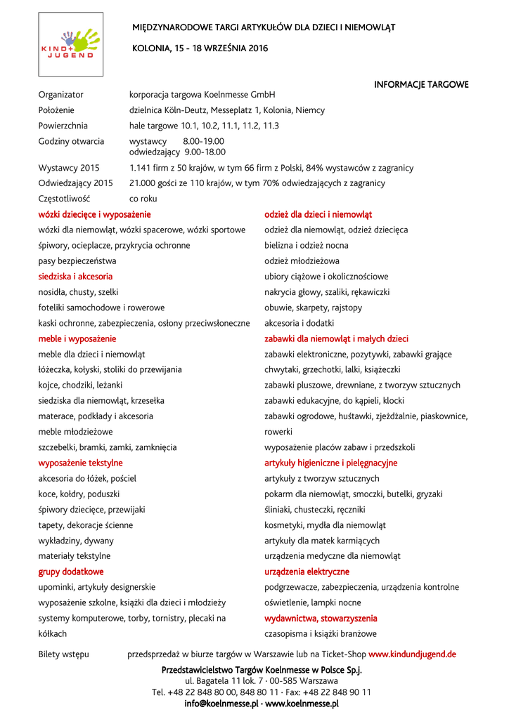 MIĘDZYNARODOWE MIĘDZYNARODOWE TARGI ARTYKUŁÓW DLA DZIECI I NIEMOWLĄT KOLONIA, 15 15 - 18 WRZEŚNIA 2016 2016 INFORMACJE TARGOWE Organizator korporacja targowa Koelnmesse GmbH Położenie dzielnica Köln-Deutz, Messeplatz 1, Kolonia, Niemcy Powierzchnia hale targowe 10.1, 10.2, 11.1, 11.2, 11.3 Godziny otwarcia wystawcy 8.00-19.00 odwiedzający 9.00-18.00 Wystawcy 2015 1.141 firm z 50 krajów, w tym 66 firm z Polski, 84% wystawców z zagranicy Odwiedzający 2015 21.000 gości ze 110 krajów, w tym 70% odwiedzających z zagranicy Częstotliwość co roku wózki dziecięce dziecięce i wyposażenie odzież dla dzieci i niemowląt wózki dla niemowląt, wózki spacerowe, wózki sportowe odzież dla niemowląt, odzież dziecięca śpiwory, ocieplacze, przykrycia ochronne bielizna i odzież nocna pasy bezpieczeństwa odzież młodzieżowa siedziska i akcesoria ubiory ciążowe i okolicznościowe nosidła, chusty, szelki nakrycia głowy, szaliki, rękawiczki foteliki samochodowe i rowerowe obuwie, skarpety, rajstopy kaski ochronne, zabezpieczenia, osłony przeciwsłoneczne akcesoria i dodatki meble i wyposażenie zabawki dla niemowląt i małych dzieci meble dla dzieci i niemowląt zabawki elektroniczne, pozytywki, zabawki grające łóżeczka, kołyski, stoliki do przewijania chwytaki, grzechotki, lalki, książeczki kojce, chodziki, leżanki zabawki pluszowe, drewniane, z tworzyw sztucznych siedziska dla niemowląt, krzesełka zabawki edukacyjne, do kąpieli, klocki materace, podkłady i akcesoria zabawki ogrodowe, huśtawki, zjeżdżalnie, piaskownice, meble młodzieżowe rowerki szczebelki, bramki, zamki, zamknięcia wyposażenie placów zabaw i przedszkoli wyposażenie wyposażenie tekstylne artykuły higieniczne i pielęgnacyjne akcesoria do łóżek, pościel artykuły z tworzyw sztucznych koce, kołdry, poduszki pokarm dla niemowląt, smoczki, butelki, gryzaki śpiwory dziecięce, przewijaki śliniaki, chusteczki, ręczniki tapety, dekoracje ścienne kosmetyki, mydła dla niemowląt wykładziny, dywany artykuły dla matek karmiących materiały tekstylne urządzenia medyczne dla niemowląt grupy dodatkowe urządzenia elektryczne upominki, artykuły designerskie podgrzewacze, zabezpieczenia, urządzenia kontrolne wyposażenie szkolne, książki dla dzieci i młodzieży oświetlenie, lampki nocne systemy komputerowe, torby, tornistry, plecaki na wydawnictwa, stowarzyszenia kółkach czasopisma i książki branżowe Bilety wstępu przedsprzedaż w biurze targów w Warszawie lub na Ticket-Shop www.kindundjugend.de Przedstawicielstwo Targów Koelnmesse w Polsce Sp.j. ul. Bagatela 11 lok. 7 · 00-585 Warszawa Tel. +48 22 848 80 00, 848 80 11 · Fax: +48 22 848 90 11 [email protected] · www.koelnmesse.pl