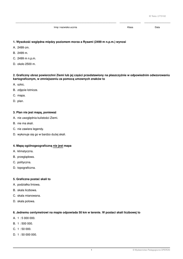 ID Testu: LY731X2 ______________________________________________________________ _____________ ________________ Imie˛ i nazwisko ucznia Klasa Data 1. Wysokość wzgledna ˛ miedzy ˛ poziomem morza a Rysami (2499 m n.p.m.) wynosi A. 2499 cm. B. 2499 m. C. 2499 m n.p.m. D. około 2500 m. 2. Graficzny obraz powierzchni Ziemi lub jej cze˛ ści przedstawiony na płaszczyźnie w odpowiednim odwzorowaniu kartograficznym, w zmniejszeniu za pomoca˛ umownych znaków to A. szkic. B. zdjecie ˛ lotnicze. C. mapa. D. plan. 3. Plan nie jest mapa, ˛ ponieważ A. nie uwzglednia ˛ kulistości Ziemi. B. nie ma skali. C. nie zawiera legendy. D. wykonuje sie˛ go w bardzo dużej skali. 4. Mapa˛ ogólnogeograficzna˛ nie jest mapa A. klimatyczna. B. przegladowa. ˛ C. polityczna. D. topograficzna. 5. Graficzna postać skali to A. podziałka liniowa. B. skala liczbowa. C. skala mianowana. D. skala polowa. 6. Jednemu centymetrowi na mapie odpowiada 50 km w terenie. W postaci skali liczbowej to A. 1 : 5 000 000. B. 1 : 500 000. C. 1 : 50 000. D. 1 : 50 000 000. 1 © Wydawnictwo Pedagogiczne OPERON 7. W skali 1 : 100 000 jednemu centymetrowi na mapie odpowiada A. 100 000 milimetrów w terenie. B. 1 kilometr w terenie. C. 100 kilometrów w terenie. D. 100 centymetrów w terenie. 8. Klasa I A wybrała sie˛ na wycieczke˛ i przeszła 5 kilometrów. Na mapie w skali 1:200 000 odcinek ten wynosi A. 5,5 centymetrów. B. 10 centymetrów. C. 2,5 centymetra. D. 2 centymetry. 9. Klasa I B planuje spacer po Krakowie. Na mapie w skali 1:75 000 odcinek, który zamierza przejść, jest równy 10 cm. Wskaż, jaka˛ odległość pokonaja˛ uczniowie. A. 75 km B. 7500 m C. 750 m D. 0,75 km 10. Skala mianowana 1 cm – 150 km w postaci liczbowej to A. 1 : 150 000. B. 1 : 1 500 000. C. 1 : 150 000 000. D. 1 : 15 000 000. 11. Ze wzgledu ˛ na skale˛ mapy dzielimy na: topograficzne, przegladowo-topograficzne ˛ i przegladowe. ˛ Wskaż, w której z podanych skal jest wykonana mapa topograficzna. A. 1 : 500 000 B. 1 : 20 000 000 C. 1 : 750 000 D. 1 : 25 000 12. Z mapy hipsometrycznej można odczytać A. wysokość n.p.m. i budowe˛ geologiczna. ˛ B. ukształtowanie powierzchni i rodzaje gleb. C. głebokość ˛ oceanów i kierunki wiatrów. D. wysokość n.p.m. i ukształtowanie powierzchni. 2 © Wydawnictwo Pedagogiczne OPERON 13. W legendzie mapy wystepuj ˛ a˛ znaki umowne, czyli znaki topograficzne. Do znaków topograficznych nie należa˛ A. znaki liniowe. B. znaki powierzchniowe. C. znaki komunikacyjne. D. znaki punktowe. 14. Przed każdym użyciem mapy w terenie należy ja˛ zorientować, czyli ułożyć tak, aby A. kierunki na mapie odpowiadały kierunkom w terenie. B. kierunek południowy znajdował sie˛ na górze mapy. C. kierunki na mapie odpowiadały kierunkowi marszu. D. kierunki na mapie odpowiadały położeniu Słońca. 15. Turyście wyruszajacemu ˛ na wycieczke˛ jest niezbedna ˛ mapa turystyczna. Mapa ta powstaje na podstawie A. fotomapy. B. mapy pogladowo-topograficznej. ˛ C. mapy pogladowej. ˛ D. mapy topograficznej. 16. Depresja to teren na ladzie ˛ położony poniżej poziomu morza. Najgłebsza ˛ depresja na Ziemi znajduje sie˛ w rejonie A. Morza Marmara. B. Morza Kaspijskiego. C. Morza Martwego. D. Morza Bałtyckiego. 17. Góry na mapie hipsometrycznej przedstawia sie˛ za pomoca˛ barw od pomarańczowej do A. ciemnozielonej. B. ciemnobrazowej. ˛ C. błekitnej. ˛ D. szarej. 18. Jak nazywamy tereny położone ponad poziomem morza, siegaj ˛ ace ˛ do około 300 m n.p.m.? A. Sa˛ to niziny. B. Sa˛ to depresje. C. Sa˛ to wyżyny. D. Sa˛ to góry. 3 © Wydawnictwo Pedagogiczne OPERON 19. Do wklesłych ˛ form ukształtowania terenu zalicza sie˛ A. kotliny i niziny. B. niziny i doliny. C. doliny i kotliny. D. wyżyny i depresje. 20. Korzystajac ˛ z diagramu kołowego przedstawiajacego ˛ procentowy udział powierzchni ladów, ˛ oblicz, ile procent powierzchni ladów ˛ przypada na Ameryke˛ Północna. ˛ A. 16,3% B. 12,0% C. 13,6% D. 28,3% 21. Korzystajac ˛ z diagramu strukturalnego przedstawiajacego ˛ procentowy udział powierzchni ladów, ˛ oblicz, ile procent powierzchni Ziemi zajmuja˛ razem Afryka i Ameryka Północna. A. 36,6% B. 20,3% C. 32,3% D. 12,0% 4 © Wydawnictwo Pedagogiczne OPERON 22. Ile procent wód wszechoceanu zajmuje Ocean Indyjski? A. 49,8% B. 21,7% C. 20,7% D. 25,1% 23. Do prezentacji niektórych zjawisk na mapach używa sie˛ metody izolinii. W tej metodzie stosuje sie˛ A. linie łacz ˛ ace ˛ na mapie punkty o takiej samej wartości. B. linie łacz ˛ ace ˛ miasta w Polsce. C. odpowiednio umiejscowione na mapie sygnatury. D. tylko barwne plamy. 24. Z miasta A do miasta B w linii prostej jest 5 cm na mapie w skali 1:200 000. Wskaż, ile ta odległość wynosi w rzeczywistości. A. 5 km B. 1 000 m C. 20 km D. 10 000 m 25. Skala w postaci mianowanej wynosi 1 cm – 0,5 km. W postaci liczbowej bedzie ˛ to skala A. 1 : 5 000 000. B. 1 : 5 000. C. 1 : 50 000. D. 1 : 500 000. 26. Matematyczny stosunek odległości na mapie do odpowiadajacej ˛ jej odległości w terenie to A. skala polowa. B. odcinek. C. skala. D. odległość. 5 © Wydawnictwo Pedagogiczne OPERON 27. Dwa centymetry na mapie w skali 1 : 20 000 000 to w terenie A. 200 kilometrów. B. 40 kilometrów. C. 400 kilometrów. D. 40 000 metrów. 28. Z Nowej Soli do Poznania w linii prostej jest 12 cm na mapie w skali 1:1000 000. Wskaż, ile ta odległość wynosi w rzeczywistości. A. 200 km B. 12 km C. 120 km D. 100 km 29. Wysokość wzgledna ˛ miedzy ˛ Rysami (2499 m n.p.m.) a Raczkami Elblaskimi ˛ (1,8 m p.p.m.) wynosi A. 2470 m. B. 2500,8 m n.p.m. C. 2497,2 m. D. 2500,8 m. 30. Wysokość bezwzgledna ˛ to wysokość mierzona od A. najbliższego wzgórza. B. poziomu morza. C. najniższego punktu. D. najwyższego miejsca na Ziemi. 31. Linia na mapie łacz ˛ aca ˛ punkty o takiej samej wysokości n.p.m. to A. izobara. B. linia graniczna. C. poziomica. D. izoterma. 32. Teren na ladzie ˛ znajdujacy ˛ 