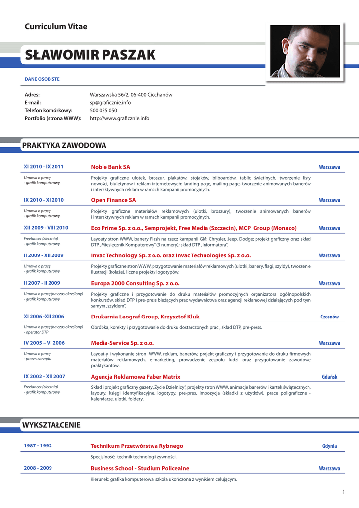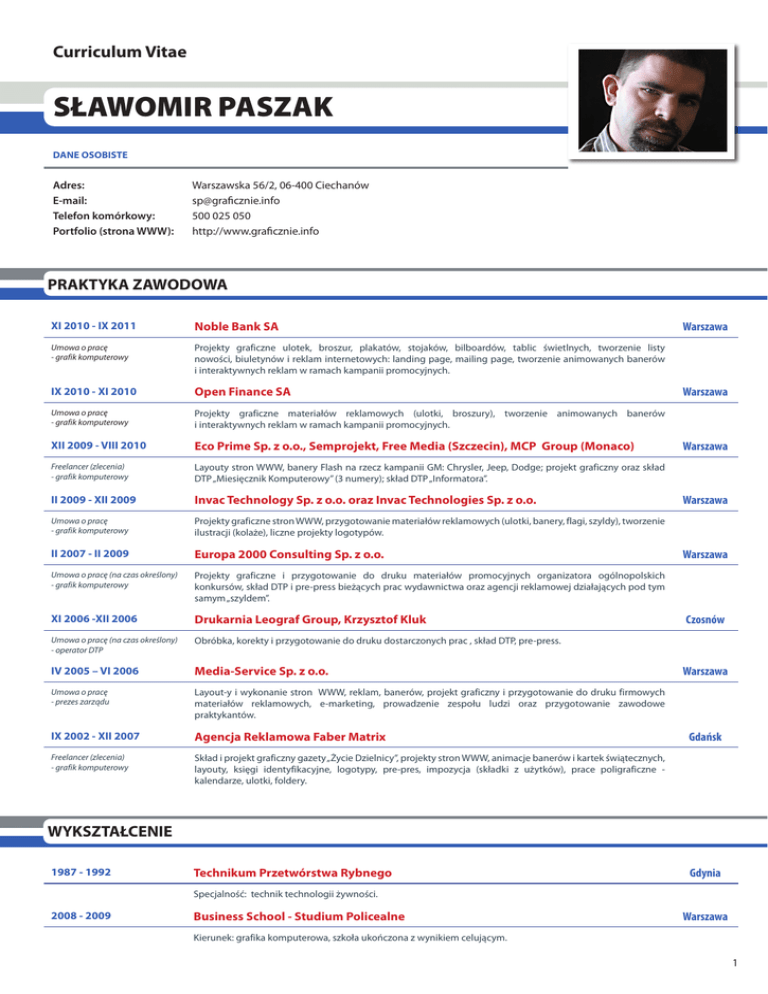 Curriculum Vitae SŁAWOMIR PASZAK DANE OSOBISTE Adres: Warszawska 56/2, 06-400 Ciechanów E-mail:[email protected] Telefon komórkowy: 500 025 050 Portfolio (strona WWW):http://www.graficznie.info PRAKTYKA ZAWODOWA XI 2010 - IX 2011 Noble Bank SA Umowa o pracę - grafik komputerowy Projekty graficzne ulotek, broszur, plakatów, stojaków, bilboardów, tablic świetlnych, tworzenie listy nowości, biuletynów i reklam internetowych: landing page, mailing page, tworzenie animowanych banerów i interaktywnych reklam w ramach kampanii promocyjnych. IX 2010 - XI 2010 Open Finance SA Umowa o pracę - grafik komputerowy Projekty graficzne materiałów reklamowych (ulotki, broszury), tworzenie animowanych banerów i interaktywnych reklam w ramach kampanii promocyjnych. XII 2009 - VIII 2010 Eco Prime Sp. z o.o., Semprojekt, Free Media (Szczecin), MCP Group (Monaco) Freelancer (zlecenia) - grafik komputerowy Layouty stron WWW, banery Flash na rzecz kampanii GM: Chrysler, Jeep, Dodge; projekt graficzny oraz skład DTP „Miesięcznik Komputerowy” (3 numery); skład DTP „Informatora”. II 2009 - XII 2009 Invac Technology Sp. z o.o. oraz Invac Technologies Sp. z o.o. Umowa o pracę - grafik komputerowy Projekty graficzne stron WWW, przygotowanie materiałów reklamowych (ulotki, banery, flagi, szyldy), tworzenie ilustracji (kolaże), liczne projekty logotypów. II 2007 - II 2009 Europa 2000 Consulting Sp. z o.o. Umowa o pracę (na czas określony) - grafik komputerowy Projekty graficzne i przygotowanie do druku materiałów promocyjnych organizatora ogólnopolskich konkursów, skład DTP i pre-press bieżących prac wydawnictwa oraz agencji reklamowej działających pod tym samym „szyldem”. XI 2006 -XII 2006 Drukarnia Leograf Group, Krzysztof Kluk Umowa o pracę (na czas określony) - operator DTP Obróbka, korekty i przygotowanie do druku dostarczonych prac , skład DTP, pre-press. IV 2005 – VI 2006 Media-Service Sp. z o.o. Umowa o pracę - prezes zarządu Layout-y i wykonanie stron WWW, reklam, banerów, projekt graficzny i przygotowanie do druku firmowych materiałów reklamowych, e-marketing, prowadzenie zespołu ludzi oraz przygotowanie zawodowe praktykantów. IX 2002 - XII 2007 Agencja Reklamowa Faber Matrix Freelancer (zlecenia) - grafik komputerowy Skład i projekt graficzny gazety „Życie Dzielnicy”, projekty stron WWW, animacje banerów i kartek świątecznych, layouty, księgi identyfikacyjne, logotypy, pre-pres, impozycja (składki z użytków), prace poligraficzne kalendarze, ulotki, foldery. Warszawa Warszawa Warszawa Warszawa Warszawa Czosnów Warszawa Gdańsk WYKSZTAŁCENIE 1987 - 1992 Technikum Przetwórstwa Rybnego Gdynia Specjalność: technik technologii żywności. 2008 - 2009 Business School - Studium Policealne Warszawa Kierunek: grafika komputerowa, szkoła ukończona z wynikiem celującym. 1 CERTYFIKATY 2006 Egzamin i uzyskanie certyfikatu “Operatora DTP” Warszawa Wydany przez Apple IMC Poland Sad Sp. z o.o. SZKOLENIA 1992 - 1993 Young Men’s Christian Association (Polska YMCA) Kurs Kurs rysunku i grafiki. V 2006 Apple IMC Poland Sad Sp. z o.o. Kurs Skład DTP + elementy prepress - Adobe Photoshop CS, Adobe Illustrator, CS Adobe InDesign, QuarkXPress 6.5. Gdynia Warszawa UMIEJĘTNOŚCI Znajomość programów: • biegła: Adobe Photoshop, Adobe Illustrator, Adobe InDesign (wersja CS-CS5); • bardzo dobra: Adobe Flash (wersja CS-CS5), Corel Draw, pakiet MS Office 1997-2007, Open Office; • dobra: Adobe Fireworks, Adobe Dreamweaver (wersja CS-CS5); • edytory tekstowe PHP I HTML; • system operacyjny Windows 98, XP, Vista, 7; • system operacyjny Mac OS X (2 lata doświadczenia). Specjalizacja: • Internet - projekty graficzne stron WWW (layouty); - tworzenie stron WWW (Drupal, Wordpress, własne skrypty); - animacje Flash (nagłówki, prezentacje, banery, intra); - HTML, CSS, XHTML, PHP (podstawy), JavaScript (modyfikacje). • Poligrafia - projekty graficzne, skład DTP, prepress (przygotowanie do druku); - offset: czasopisma, katalogi, ulotki, materiały promocyjne, opakowania; - sitodruk: nadruki na materiały takie jak tkaniny, plastik; - druk solwentowy: banery, rollupy, flagi, folie siatkowe. ZAINTERESOWANIA Fotografia (www.yops.digart.pl www.yops.info), jazda na rowerze (www.kolarstwo.info), gra na instrumentach perkusyjnych, gotowanie: kuchnia chińska, meksykańska, włoska. Wyrażam zgodę na przetwarzanie moich danych osobowych zawartych w tym CV dla potrzeb niezbędnych do realizacji procesu rekrutacji (zgodnie z Ustawą z dn.29.08.1997 r. o Ochronie Danych Osobowych Dz. U. Nr 133 poz. 883). 2