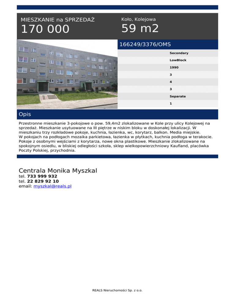 MIESZKANIE na SPRZEDAŻ 170 000 Koło, Kolejowa 59 m2 166249/3376/OMS Secondary LowBlock 1990 3 4 3 Separate 1 Opis Przestronne mieszkanie 3-pokojowe o pow. 59,4m2 zlokalizowane w Kole przy ulicy Kolejowej na sprzedaż. Mieszkanie usytuowane na III piętrze w niskim bloku w doskonałej lokalizacji. W mieszkaniu trzy rozkładowe pokoje, kuchnia, łazienka, wc, korytarz, balkon. Media miejskie. W pokojach na podłogach mozaika parkietowa, łazienka w płytkach, kuchnia podłoga w terakocie. Pokoje z osobnymi wejściami z korytarza, nowe okna plastikowe. Mieszkanie zlokalizowane na spokojnym osiedlu, w bliskiej odległości szkoła, sklep wielkopowierzchniowy Kaufland, placówka Poczty Polskiej, przychodnia. Centrala Monika Myszkal tel. 733 999 932 tel. 22 829 92 10 email: [email protected] REALS Nieruchomości Sp. z o.o. Powered by TCPDF (www.tcpdf.org)