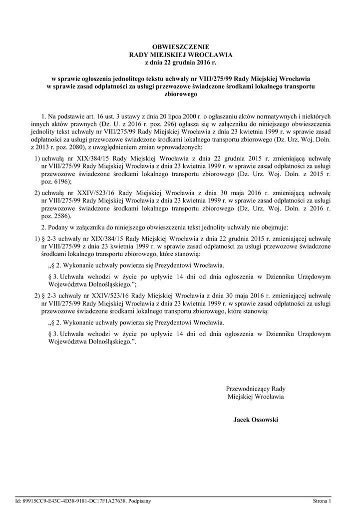 OBWIESZCZENIE RADY MIEJSKIEJ WROCŁAWIA z dnia 22 grudnia 2016 r. w sprawie ogłoszenia jednolitego tekstu uchwały nr VIII/275/99 Rady Miejskiej Wrocławia w sprawie zasad odpłatności za usługi przewozowe świadczone środkami lokalnego transportu zbiorowego 1. Na podstawie art. 16 ust. 3 ustawy z dnia 20 lipca 2000 r. o ogłaszaniu aktów normatywnych i niektórych innych aktów prawnych (Dz. U. z 2016 r. poz. 296) ogłasza się w załączniku do niniejszego obwieszczenia jednolity tekst uchwały nr VIII/275/99 Rady Miejskiej Wrocławia z dnia 23 kwietnia 1999 r. w sprawie zasad odpłatności za usługi przewozowe świadczone środkami lokalnego transportu zbiorowego (Dz. Urz. Woj. Doln. z 2013 r. poz. 2080), z uwzględnieniem zmian wprowadzonych: 1) uchwałą nr XIX/384/15 Rady Miejskiej Wrocławia z dnia 22 grudnia 2015 r. zmieniającą uchwałę nr VIII/275/99 Rady Miejskiej Wrocławia z dnia 23 kwietnia 1999 r. w sprawie zasad odpłatności za usługi przewozowe świadczone środkami lokalnego transportu zbiorowego (Dz. Urz. Woj. Doln. z 2015 r. poz. 6196); 2) uchwałą nr XXIV/523/16 Rady Miejskiej Wrocławia z dnia 30 maja 2016 r. zmieniającą uchwałę nr VIII/275/99 Rady Miejskiej Wrocławia z dnia 23 kwietnia 1999 r. w sprawie zasad odpłatności za usługi przewozowe świadczone środkami lokalnego transportu zbiorowego (Dz. Urz. Woj. Doln. z 2016 r. poz. 2586). 2. Podany w załączniku do niniejszego obwieszczenia tekst jednolity uchwały nie obejmuje: 1) § 2-3 uchwały nr XIX/384/15 Rady Miejskiej Wrocławia z dnia 22 grudnia 2015 r. zmieniającej uchwałę nr VIII/275/99 z dnia 23 kwietnia 1999 r. w sprawie zasad odpłatności za usługi przewozowe świadczone środkami lokalnego transportu zbiorowego, które stanowią: „§ 2. Wykonanie uchwały powierza się Prezydentowi Wrocławia. § 3. Uchwała wchodzi w życie po upływie 14 dni od dnia ogłoszenia w Dzienniku Urzędowym Województwa Dolnośląskiego.”; 2) § 2-3 uchwały nr XXIV/523/16 Rady Miejskiej Wrocławia z dnia 30 maja 2016 r. zmieniającej uchwałę nr VIII/275/99 Rady Miejskiej Wrocławia z dnia 23 kwietnia 1999 r. w sprawie zasad odpłatności za usługi przewozowe świadczone środkami lokalnego transportu zbiorowego, które stanowią: „§ 2. Wykonanie uchwały powierza się Prezydentowi Wrocławia. § 3. Uchwała wchodzi w życie po upływie 14 dni od dnia ogłoszenia w Dzienniku Urzędowym Województwa Dolnośląskiego.”. Przewodniczący Rady Miejskiej Wrocławia Jacek Ossowski Id: 89915CC9-E43C-4D38-9181-DC17F1A27638. Podpisany Strona 1 Załącznik do Obwieszczenia Rady Miejskiej Wrocławia z dnia 22 grudnia 2016 r. UCHWAŁA NR VIII/275/99 RADY MIEJSKIEJ WROCŁAWIA z dnia 23 kwietnia 1999 r. w sprawie zasad odpłatności za usługi przewozowe świadczone środkami lokalnego transportu zbiorowego Na podstawie art. 18 ust. 2 pkt 15 ustawy z dnia 8 marca 1990 r. o samorządzie gminnym (Dz. U. z 2016 r. poz. 446 i 1579) w związku z art. 15 ust. 5 oraz art. 34 a ust. 2 ustawy z dnia 15 listopada 1984 r. – Prawo przewozowe (Dz. U. z 2015 r. poz. 915), Rada Miejska Wrocławia uchwala, co następuje: § 1. W celu zaspokojenia potrzeb mieszkańców Wrocławia, w zakresie lokalnego transportu zbiorowego, Gmina Wrocław organizuje miejską komunikację zbiorową opartą na usługach przewozowych świadczonych przez uprawnionych przewoźników. § 2. 1. Zasady odpłatności za przejazdy środkami komunikacji zbiorowej organizowanej przez Gminę Wrocław określa załącznik do uchwały. 2. Wysokość opłat określa odrębna uchwała lub umowa. § 3. Kontrola uiszczania opłat za przejazdy jest prowadzona według zasad określonych w Prawie przewozowym. § 4. Wykonanie uchwały powierza się Zarządowi Miasta. § 5. Uchwała wchodzi w życie z dniem 1 lipca 1999 r. i podlega ogłoszeniu. Id: 89915CC9-E43C-4D38-9181-DC17F1A27638. Podpisany Strona 2 Załącznik do uchwały nr VIII/275/99 Rady Miejskiej Wrocławia z dnia 23 kwietnia 1999 r. § 1. 1. Gmina Wrocław organizuje przewozy w miejskiej komunikacji zbiorowej we własnym zakresie poprzez działanie spółki należącej do Gminy oraz poprzez zawarcie umów z przewoźnikami na świadczenie usług przewozowych. 2. Przewoźnicy wykonują powyższe usługi taborem tramwajowym lub autobusowym na liniach typu: 1) normalne; 2) pospieszne; 3) nocne; 4) podmiejskie; 5) inne. 2a. Gmina emituje bilety obowiązujące przy przewozach środkami miejskiej komunikacji zbiorowej. 3. Na liniach zorganizowanych przez Gminę Wrocław na podstawie porozumień międzygminnych obowiązują rodzaje biletów wskazane w tych porozumieniach. § 2. 1. Rodzaje biletów stosowanych w komunikacji miejskiej w granicach miasta Wrocławia oraz poza granicami miasta Wrocławia: 1) jednorazowe - uprawniające do jednokrotnego przejazdu na następujących typach linii: a) normalnych oraz podmiejskich, b) pospiesznych oraz nocnych; 2) okresowe - uprawniające do wielokrotnych przejazdów, w tym: a) czasowe: - 30 - minutowe - uprawniające posiadacza biletu do korzystania z nieograniczonej liczby przejazdów na wszystkich typach linii do 30 minut liczonych od godziny skasowania biletu, - 60 - minutowe - uprawniające posiadacza biletu do korzystania z nieograniczonej liczby przejazdów na wszystkich typach linii do 60 minut liczonych od godziny skasowania biletu, - 90 - minutowe - uprawniające posiadacza biletu do korzystania z nieograniczonej liczby przejazdów na wszystkich typach linii do 90 minut liczonych od godziny skasowania biletu, - 24 - godzinne - uprawniające posiadacza biletu do korzystania z nieograniczonej liczby przejazdów na wszystkich typach linii przez 24 godziny liczone od godziny skasowania biletu, - 48 - godzinne - uprawniające posiadacza biletu do korzystania z nieograniczonej liczby przejazdów na wszystkich typach linii przez 48 godzin liczonych od godziny skasowania biletu, - 72 - godzinne - uprawniające posiadacza biletu do korzystania z nieograniczonej