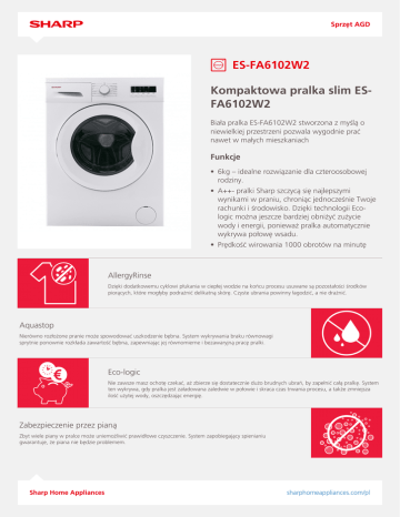 Sprzęt AGD ES-FA6102W2 Kompaktowa pralka slim ESFA6102W2 Biała pralka ES-FA6102W2 stworzona z myślą o niewielkiej przestrzeni pozwala wygodnie prać nawet w małych mieszkaniach Funkcje 6kg – idealne rozwiązanie dla czteroosobowej rodziny. A++- pralki Sharp szczycą się najlepszymi wynikami w praniu, chroniąc jednocześnie Twoje rachunki i środowisko. Dzięki technologii Ecologic można jeszcze bardziej obniżyć zużycie wody i energii, ponieważ pralka automatycznie wykrywa połowę wsadu. Prędkość wirowania 1000 obrotów na minutę AllergyRinse Dzięki dodatkowemu cyklowi płukania w ciepłej wodzie na końcu procesu usuwane są pozostałości środków piorących, które mogłyby podrażnić delikatną skórę. Czyste ubrania powinny łagodzić, a nie drażnić. Aquastop Nierówno rozłożone pranie może spowodować uszkodzenie bębna. System wykrywania braku równowagi sprytnie ponownie rozkłada zawartość bębna, zapewniając jej równomierne i bezawaryjną pracę pralki. Eco-logic Nie zawsze masz ochotę czekać, aż zbierze się dostatecznie dużo brudnych ubrań, by zapełnić całą pralkę. System ten wykrywa, gdy pralka jest załadowana zaledwie w połowie i skraca czas trwania procesu, a także zmniejsza ilość użytej wody, oszczędzając energię. Zabezpieczenie przez pianą Zbyt wiele piany w pralce może uniemożliwić prawidłowe czyszczenie. System zapobiegający spienianiu gwarantuje, że piana nie będzie problemem. Sharp Home Appliances sharphomeappliances.com/pl Sprzęt AGD Kluczowe cechy Szybkość wirowania (obr./min) 1200 Thermojet Nie Start z opóźnieniem Tak Czas najkrótszego prania (min) 15 Sprawność energetyczna A+++ Bęben o dużej pojemności i duże drzwi Nie Wydajność prania A Liczba programów 15 Wydajność wirowania C Kolor Biały Gwarancja (w latach) Dwa lata na części i robociznę Zabezpieczenie przed przepełnieniem Tak System wykrywania usterek Tak Wskaźnik cyklu prania Tak Wlot wody Zimna Dodatkowe płukanie Tak Namaczanie Nie Łatwe prasowanie Tak Szeroko otwierane drzwi Tak Regulowane nóżki Tak Wskazówki dotyczące dozowania Nie Maksymalny wsad do prania (kg) 6 Doublejet Nie Inne funkcje Typ wyświetlacza Wskaźnik elektroniczny Zmienna szybkość wirowania Nie Zmienna temperatura Tak Objętość bębna 41 System Eco-Logic Tak NightWash Nie Stainmaster Nie Zabezpieczenie przed dziećmi Tak Zabezpieczenie przez pianą Tak System wykrywania braku równowagi Sharp Home Appliances Tak sharphomeappliances.com/pl Sprzęt AGD Inne funkcje nieprzerwany Start/pauza Tak Poziom szumów podczas prania (dBA) 58 Poziom szumów podczas wirowania (dBA) 77 Masa produktu z opakowaniem (kg) 62 Masa produktu bez opakowania (kg) 60.5 Roczne zużycie energii (kWh/rok) 171 Roczne zużycie wody (w litrach) 9900 Wymiary i waga Wysokość (cm) 84.5 Szerokość (cm) 59.7 Głębokość (cm) 41.6 Mocy, zużycia i napięcia Prąd elektryczny (A) 10 Napięcie (V) / częstotliwość (Hz) 220-240V / 50Hz Moc (W) 10 European article number Kod EAN Sharp Home Appliances Powered by TCPDF (www.tcpdf.org) – sharphomeappliances.com/pl