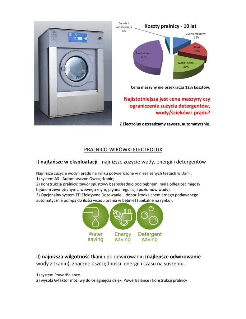 Cena maszyny nie przekracza 12% kosztów. Najistotniejsza jest cena maszyny czy ograniczenie zużycia detergentów, wody/ścieków i prądu? Z Electrolux oszczędzamy zawsze, automatycznie. PRALNICO-WIRÓWKI ELECTROLUX I) najtańsze w eksploatacji - najniższe zużycie wody, energii i detergentów Najniższe zużycie wody i prądu na rynku potwierdzone w niezależnych testach w Danii: 1) system AS - Automatyczne Oszczędzanie; 2) Konstrukcja pralnicy: zawór spustowy bezpośrednio pod bębnem, mała odległość między bębnem zewnętrznym a wewnętrznym, płynna regulacja poziomów wody). 3) Opcjonalny system ED Efektywne Dozowanie – dobór środka chemicznego podawanego automatycznie pompą do ilości wsadu prania w bębnie! (unikalne na rynku). II) najniższa wilgotność tkanin po odwirowaniu (najlepsze odwirowanie wody z tkanin), znaczne oszczędności energii i czasu na suszeniu. 1) system PowerBalance 2) wysoki G-faktor możliwy do osiągnięcia dzięki PowerBalance i konstrukcji pralnicy I) Ekonomika (oszczędność) jest określona w broszurach: 1. AS – automatyczne oszczędzanie: Urządzenie waży wsad i odpowiednio dostosowuje ilość potrzebnej wody oraz energii. Prowadzi to do poważnych oszczędności przy niepełnym wsadzie. Ok. 60-70% pralnic jest niedoładowanych, tracąc wodę, detergenty i energię. Dlatego Electrolux wymyślił i opatentował system AS Automatyczne Oszczędzanie , unikalną cechę która automatycznie dobiera zużycie wody do wsadu w bębnie. Łącząc to z systemem Electrolux-a ED Efektywne Dozowanie, który dobiera ilość środka chemicznego do ilości wsadu i wody w bębnie, zapewnione są natychmiastowe oszczędności i najlepsze rezultaty prania oraz żywotność tkanin – zawsze, automatycznie 2. Bardzo niskie zużycie wody i energii – zob. poniżej PEŁNY WSAD 27 KG: WODA: 167 litrów wody zimnej i 42 litry wody ciepłej (7,74 litry/kg) i jest to normalny program 60C a nie jakiś specjalny. Konkurenci mają 5 litrów więcej wody na kg przy normalnych programach! ENERGIA: 0,6 kW na silnik i 3,85 kW na podgrzew POŁOWA WSADU 13,5 KG (Maszyna sama dobiera mniejszą ilość wody i prądu - OPATENTOWANE) WODA: 81 litrów wody zimnej i 22 litry wody ciepłej (7,62 litry/kg) na normalnym programie. Konkurenci nie dobierają automatycznie ilości wody do wsadu i zużywają wodę jakby pralka była załadowana w pełni. Np. na 13,5 kg wyjdzie ok. 24 litry wody/kg, co przy połowie wsadu wynosi 3 razy więcej niż Electrolux! Zawór spustowy ulokowany przy bębnie zapobiega nadmiernemu gromadzeniu się wody w rurach, gdzie woda i detergent nie są wykorzystywana w praniu i niepotrzebnie zużywane. Electrolux Konkurenci Ponadto przy zaniku zasilania zawór spustowy otworzy się, gdyż jest sterowany elektrycznie, tracąc wodę, detergenty i czas. W Electrolux w maszynach W4400H-W41100H zawór jest sterowany pnaumatycznie. Dodatkowo przecieki wody zniszczą silnik zaworu sterowanego elektrycznie. W Electrolux w masyznach W555H-W5300H zawór jest sterowany ciśnieniem wody (bez elektryczności). Poziomy wody są ustawiane płynnie oszczędzając wodę i zapewniając optymalny roztwór detergentu. Ponadto bęben posiada optymalne otwory z szybkim odprowadzaniem wody oraz zabieraki perforowane nawilżające wodą tkaniny przy płukaniu i praniu umożliwiające rozpoczęcie prania i płukania wcześniej. 3. Możliwość doinstalowania Systemu ED – automatycznie dobiera ilość detergentu do realnego wsadu pralnico-wirówki Electrolux. Realny wsad jest mierzony na początku programu dzięki funkcji Automatycznego Oszczędzania w pralnico-wirówkach. Kiedy waga jest zmierzona, woda i poziom detergentów są dostosowywane na każdym programie aby osiągnąć najlepsze rezultaty. Najlepsza jakość tkanin dzięki odpowiednim dawkom Oszczędności do 20% na detergentach Oszczędność czasu - całkowicie automatyczny proces Większe bezpieczeństwo środowiska pracy Ekologia – mniejsze zanieczyszczenia ścieków Statystyki łatwo dostępne W ciągu 10 lat pracy maszyny cena maszyny nie przekroczy 12% kosztów. Najistotniejsze jest ograniczenie zużycia detergentów, wody i ścieków oraz prądu. Z Electrolux oszczędzamy, zawsze przy każdym cyklu, automatycznie. II. Najniższa wilgoć tkanin po odwirowaniu 1. PowerBalance: (wyjątkowa opatentowana cecha) – Maksymalizacja siły wirowania – Mniejsze obciążenia urządzenia – Zmniejszenie wibracji System PowerBalance od Electrolux gwarantuje najlepsze odwirowanie niezależnie od warunków wsadu i niewyważenia. Maszyna jest zdolna do podniesienia obrotów wirowania jeśli było niewyważenie i obroty zostały zredukowane na skutek drgań. Konkurencji tego nie potrafią i pralka wiruje z niska siłą, np. 50% nominalnych obrotów! W Electrolux zawsze odwiruje z maksymalną możliwą szybkością bo pralnica sama podniesie obroty. https://www.youtube.com/watch?v=wgQeqXJnC68 Minimalizuje nacisk na maszynę zapewniając bezproblemową pracę i długa żywotność. 2. Odwirowane. G-faktor 450G (1005 obrotów/minutę). Biorąc pod uwagę system SuperBalance – ta siła wirowania jest zawsze użyta kiedy tylko można. U konkurencji jest np. 400G (980 obrotów/minutę) ale przy niewyważeniu wirowanie się zmniejsza np. do 200G (690 obrotów/minutę) i już nie wzrasta jak w Electrolux. Tkaniny trzeba kilka minut dłużej suszyć a to są olbrzymie straty na prądzie lub gazie w suszarce, która generuje największe koszty energii. INNE ZALETY: Programator mikroprocesorowy Compass Pro® oferuje: – Duży wyświetlacz oraz jedno pokrętło umożliwia łatwy wybór programu – Możliwość wyboru języka menu – Przyciski szybkiego wyboru do obsługi najczęściej stosowanych programów oraz opcji prania – Zestawy programów prania zoptymalizowane pod względem ekonomii, skuteczności i czasu. (Dostępne dla programów ogólnych) Możliwość podłączenia do systemy monitoringu: - statystyki (iloś
