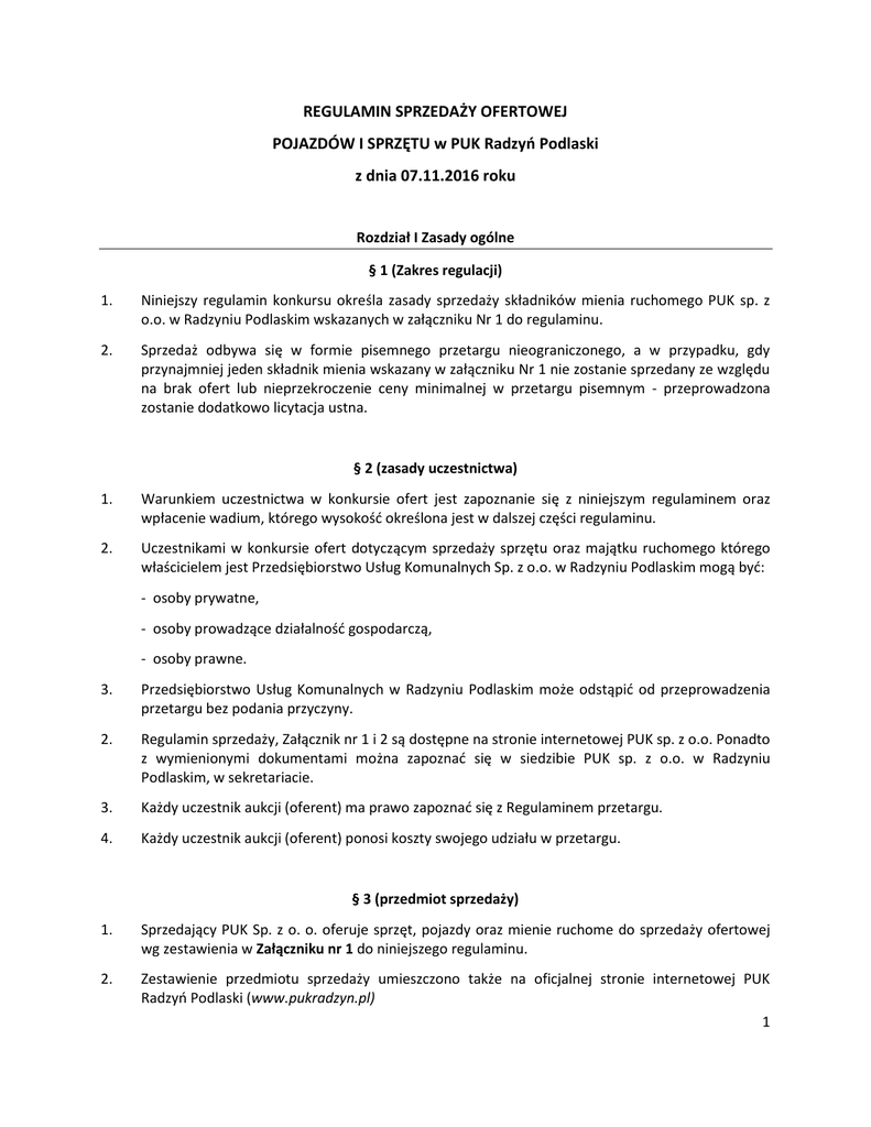 REGULAMIN SPRZEDAŻY OFERTOWEJ POJAZDÓW I SPRZĘTU w PUK Radzyń Podlaski z dnia 07.11.2016 roku Rozdział I Zasady ogólne § 1 (Zakres regulacji) 1. Niniejszy regulamin konkursu określa zasady sprzedaży składników mienia ruchomego PUK sp. z o.o. w Radzyniu Podlaskim wskazanych w załączniku Nr 1 do regulaminu. 2. Sprzedaż odbywa się w formie pisemnego przetargu nieograniczonego, a w przypadku, gdy przynajmniej jeden składnik mienia wskazany w załączniku Nr 1 nie zostanie sprzedany ze względu na brak ofert lub nieprzekroczenie ceny minimalnej w przetargu pisemnym - przeprowadzona zostanie dodatkowo licytacja ustna. § 2 (zasady uczestnictwa) 1. Warunkiem uczestnictwa w konkursie ofert jest zapoznanie się z niniejszym regulaminem oraz wpłacenie wadium, którego wysokość określona jest w dalszej części regulaminu. 2. Uczestnikami w konkursie ofert dotyczącym sprzedaży sprzętu oraz majątku ruchomego którego właścicielem jest Przedsiębiorstwo Usług Komunalnych Sp. z o.o. w Radzyniu Podlaskim mogą być: - osoby prywatne, - osoby prowadzące działalność gospodarczą, - osoby prawne. 3. Przedsiębiorstwo Usług Komunalnych w Radzyniu Podlaskim może odstąpić od przeprowadzenia przetargu bez podania przyczyny. 2. Regulamin sprzedaży, Załącznik nr 1 i 2 są dostępne na stronie internetowej PUK sp. z o.o. Ponadto z wymienionymi dokumentami można zapoznać się w siedzibie PUK sp. z o.o. w Radzyniu Podlaskim, w sekretariacie. 3. Każdy uczestnik aukcji (oferent) ma prawo zapoznać się z Regulaminem przetargu. 4. Każdy uczestnik aukcji (oferent) ponosi koszty swojego udziału w przetargu. § 3 (przedmiot sprzedaży) 1. Sprzedający PUK Sp. z o. o. oferuje sprzęt, pojazdy oraz mienie ruchome do sprzedaży ofertowej wg zestawienia w Załączniku nr 1 do niniejszego regulaminu. 2. Zestawienie przedmiotu sprzedaży umieszczono także na oficjalnej stronie internetowej PUK Radzyń Podlaski (www.pukradzyn.pl) 1 3. W zestawieniu podano informacje dotyczącymi nazwy, roku produkcji, przeznaczenia oraz wysokości wadium, a także ceny minimalnej. 4. Przedmioty z Załączniku nr 1 można obejrzeć pod adresem: ul. Zaródki 7-9 (wjazd od ulicy Kockiej 25 – Oczyszczalnia ścieków) w Radzyniu Podlaskim na Bazie Transportowej PUK, po wcześniejszym ustaleniu terminu oględzin z pracownikiem Dyspozytorni w dni robocze w godzinach 09.00 - 15.00. Kontakt telefoniczny: stacjonarny 83 3526103, komórkowy 600356996 Rozdział II Przetarg pisemny § 4 (oferta) 1. Oferenci mogą składać oferty na dowolną ilość przedmiotów wskazanych w załączniku Nr 1. 2. Ofertę składa się pod rygorem jej odrzucenia w formie pisemnej (opatrzonej własnoręcznym podpisem) osobiście, poprzez operatora pocztowego lub kurierem (nie dopuszcza się formy faksu lub poczty elektronicznej). 3. Oferta musi być podpisana przez osobę uprawnioną do reprezentowania kupującego. 4. W ofercie podaję się cenę brutto. 5. Ofertę składa się w zaklejonej kopercie wg formularza ofertowego stanowiącego Załącznik Nr 2 do niniejszego regulaminu. 6. Odrzuceniu podlega oferta, która: - nie ma formy pisemnej; - podpisana została przez osobę nieupoważnioną do reprezentowania kupującego; - została złożona po terminie; - jest nieważna na podstawie odrębnych przepisów; - jest niezgodna z niniejszym regulaminem. 7. Oferent może wycofać lub zmienić ofertę nie później niż na 3 dni przed terminem otwarcia ofert. § 5 (wadium) 1. Do każdej oferty kupujący załącza dowód uiszczenia wadium w kwocie zamieszczonej w Załączniku nr 1 do każdego sprzedawanego przedmiotu. 2. Wadia wnosi się w formie pieniężnej (nie dopuszcza się wadiów w innych formach w tym w gwarancjach ubezpieczeniowych lub bankowych). 3. Wadium wnosi się przelewem na rachunek bankowy (poniżej) lub poprzez wpłatę w kasie PUK. Bank Spółdzielczy w Radzyniu Podl., konto nr: 26 80460002 2001 0000 0215 0001 Bank PKO BP S.A., konto nr: 08 1020 3206 0000 8102 0038 4396 2 4. Wadium uważa się za wniesione, jeżeli zostało wpłacone przed upływem wyznaczonego terminu składania ofert lub przed terminem rozpoczęcia licytacji, zaksięgowane na koncie PUK lub jest w kasie PUK. 5. Niewniesienie wadium w wyznaczonym terminie będzie skutkowało odrzuceniem oferty. 6. Zwrot wpłaconego wadium dla oferentów, którzy nie wygrali przetargu nastąpi w ciągu 7 dni od dnia rozstrzygnięcia przetargu, na wskazane konto bankowe oferenta lub wypłacone zostanie w gotówce w kasie PUK Sp. z o.o., ul. Lubelska 5, 21-300 Radzyń Podlaski (parter) - nie dotyczy zwycięzców konkursu ofert lub licytacji. 7. Wadium wykonawcy wygrywającego przetarg zostanie mu zaliczone na poczet ceny. 8. Oferent (kupujący), który zaproponował najwyższą ofertę kupna, utraci wpłacone wadium, jeżeli nie zdecyduje się na sfinalizowanie transakcji, a sprzedający może zaproponować sprzedaż przedmiotu innemu uczestnikowi konkursu ofert lub licytacji, który zaproponował kolejną najwyższą cenę. § 6 (terminy) 1. Miejsce składania i otwarcia ofert: Przedsiębiorstwo Usług Komunalnych Sp. z o.o. w Radzyniu Podlaskim ul. Lubelska 5, 21-300 Radzyń Podlaski 2. Termin składania ofert: 28 listopada 2016 roku / godz. 12.00 3. Termin otwarcia ofert: 28 listopada 2016 roku / godz. 12.30 4. Miejsce ogłoszenia wyników konkursu ofert: 30 listopada 2016 roku / godz. 12.00 na stronie oficjalnej stronie PUK sp. z o.o. lub do wglądu w sekretariacie w siedziby PUK sp. z o.o. (ul. Lubelska 5 w Radzyniu Podlaskim). § 7 (ocena ofert i wybór oferty najkorzystniejszej) 1. Komisja weryfikująca złożone oferty, składająca się z przedstawicieli sprzedającego (komisja trzy osobowa), przedstawi kierownictwu PUK ofertę z najwyższą ceną, jeżeli w/w oferta przekroczy wartość minimalną. 2. Wynik przetargu oraz dane kupującego, umieszczone zostaną na stronie internetowej PUK. Wyniki konkursu ofert będą dostępne również w sekretariacie (pok. 