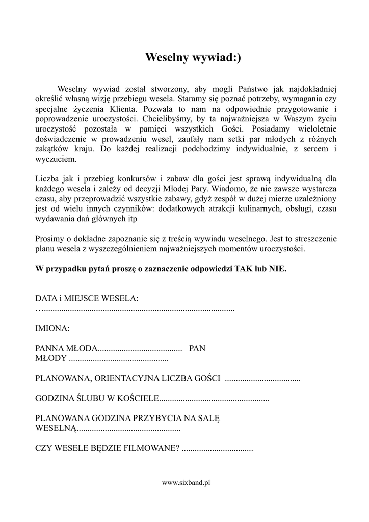 Weselny wywiad:) Weselny wywiad został stworzony, aby mogli Państwo jak najdokładniej określić własną wizję przebiegu wesela. Staramy się poznać potrzeby, wymagania czy specjalne życzenia Klienta. Pozwala to nam na odpowiednie przygotowanie i poprowadzenie uroczystości. Chcielibyśmy, by ta najważniejsza w Waszym życiu uroczystość pozostała w pamięci wszystkich Gości. Posiadamy wieloletnie doświadczenie w prowadzeniu wesel, zaufały nam setki par młodych z różnych zakątków kraju. Do każdej realizacji podchodzimy indywidualnie, z sercem i wyczuciem. Liczba jak i przebieg konkursów i zabaw dla gości jest sprawą indywidualną dla każdego wesela i zależy od decyzji Młodej Pary. Wiadomo, że nie zawsze wystarcza czasu, aby przeprowadzić wszystkie zabawy, gdyż zespół w dużej mierze uzależniony jest od wielu innych czynników: dodatkowych atrakcji kulinarnych, obsługi, czasu wydawania dań głównych itp Prosimy o dokładne zapoznanie się z treścią wywiadu weselnego. Jest to streszczenie planu wesela z wyszczególnieniem najważniejszych momentów uroczystości. W przypadku pytań proszę o zaznaczenie odpowiedzi TAK lub NIE. DATA i MIEJSCE WESELA: …........................................................................................ IMIONA: PANNA MŁODA....................................... PAN MŁODY .............................................. PLANOWANA, ORIENTACYJNA LICZBA GOŚCI ................................... GODZINA ŚLUBU W KOŚCIELE................................................... PLANOWANA GODZINA PRZYBYCIA NA SALĘ WESELNĄ................................................ CZY WESELE BĘDZIE FILMOWANE? ................................. www.sixband.pl CZY RODZICE PARY MŁODEJ BĘDĄ OBECNI NA WESELU? (taka informacja jest istotna, żeby podczas uroczystości nie zdarzyły się przykre sytuacje) PANNA MŁODA TAK NIE PAN MŁODY TAK NIE Zaczynamy wesele! Witamy wchodzących gości tradycyjnym, biesiadnym marszem, lub innym utworem instrumentalnym. Młoda Para staje na środku sali a wchodzących Gości zapraszamy do składania życzeń (podczas składania życzeń gramy spokojne utwory instrumentalne) Następnie witamy wszystkich przybyłych gości, wznosimy toast za Młodą Parę, śpiewamy tradycyjne „Sto lat”. Po wypiciu szampana Nowożeńcy rzucają swoje kieliszki za siebie, oczywiście na szczęście. Czy Para Młoda będzie wspólnie sprzątać stłuczone szkło? (pierwsza, wspólna małżeńska praca) TAK / NIE Zapraszamy Gości na obiad. Po obiedzie (ok. 30 – 40 min.) gdy wszyscy skończą posiłek zapraszamy Młodą Parę do pierwszego tańca. Tutaj macie Państwo możliwość wyboru „swojej” piosenki. Jest możliwość odtworzenia Państwa ulubionego utworu, np. w wersji do której został przygotowany układ taneczny, w tym celu prosimy odpowiednio wcześniej przesłać do nas plik w formacie mp3. Prosimy o wpisanie tytułu i wykonawcy poniżej. Jeśli nie wiecie jaki utwór wybrać proponujemy: 1. Złote obrączki 2. Wielka miłość 3. Przetańczyć z Tobą chce całą noc 4. Magiczne słowa (Ziyo) 5. Zabiorę Cię właśnie tam 6. Chce tu zostać (Farba) 7. Kochać (Szczepanik) 8. Bo jesteś Ty 9. Im więcej ciebie tym mniej 10.Z kimś takim jak Ty - Kindla www.sixband.pl 11.Pozwolił nam los 12.The power of love 13.Tylko w Twoich dłoniach 14.Ktoś mnie pokochał 15.Zawsze gdzieś czeka ktoś 16.Od dziś – Paulla 17.Złoty krążek 18.Szczęścia chwile – Vexel Czy mamy poprosić gości o utworzenie koła, a Wy tańczycie w środku? TAK / NIE Po pierwszym tańcu zapraszamy wszystkich gości do wspólnej zabawy. Kiedy gramy, wykonujemy bloki utworów złożone z 5 lub 6 piosenek, a jeśli zabawa trwa na całego, to przedłużamy blok o kolejne hity. Gdy na twarzach tańczących zaczyna być widoczne zmęczenie, biesiadną piosenką "A teraz idziemy na jednego" zapraszamy wszystkich na krótki odpoczynek, przerwa zazwyczaj trwa ok. 10 -15 minut. Wyjątkiem są dłuższe pauzy w momencie serwowania posiłków przez obsługę lokalu ( kolacja, ciasto itd.). W przerwach serwujemy nastrojową, spokojną muzykę, przy której przyjemnie się rozmawia oraz degustuje weselne pyszności. TORT WESELNY Z reguły podawany jest ok. godz. 23.00. Jeśli planujecie inną porę prosimy o poinformowanie nas o tym. ………………………………………………………………………………………… PODZIĘKOWANIE DLA RODZICÓW TAK NIE Może odbyć się po podaniu tortu lub w ramach oczepin. Decyzja należy do Was: (proszę wpisać odpowiednio PO TORCIE bądź OCZEPINY) ………………………………………………………………………………………… Zapraszamy Rodziców Pary Młodej na środek parkietu. Istnieje możliwość osobistego podziękowania przez mikrofon bądź zrobienia tego za naszym pośrednictwem. www.sixband.pl Śpiewamy „Sto lat” Rodzicom. Zaczynamy grać wybrany przez Was utwór. Z naszej strony polecamy następujące utwory: • • • • • • Cudownych rodziców mam Najmilsza na świecie jest mi mama To dzięki Wam Dzięki Wam Kochani rodzice Walc dla rodziców W tym momencie Para Młoda wręcza Rodzicom kwiaty. Następnie chwytając się za ręce tworzy z Rodzicami koło – tańcząc powoli w rytm piosenki. Jest to jeden z najbardziej wzruszających momentów każdego Wesela. Natomiast pozostali gości robią jeszcze większe koło i również poruszają się w rytm muzyki. Istnieje możliwość osobistego złożenia podziękowań przez mikrofon bądź zrobienia tego za naszym pośrednictwem. Czy w trakcie podziękowań będzie wyświetlany film z Waszymi wspomnieniami? Prosimy o tym fakcie napisać, pozwoli nam to odpowiednio wcześniej przygotować odpowiednie okablowanie itp. Czy oprócz podziękowań dla rodziców mają być podziękowania np. dla babci, chrzestnych itp.? Jeśli tak prosimy wypisać dla kogo: …........................................