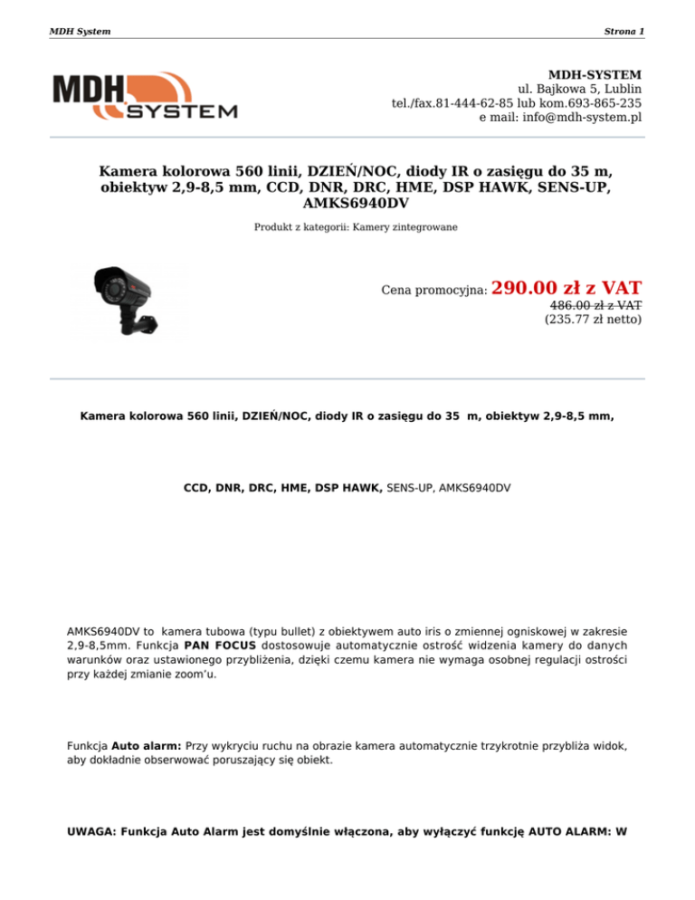 MDH System Strona 1 MDH-SYSTEM ul. Bajkowa 5, Lublin tel./fax.81-444-62-85 lub kom.693-865-235 e mail: [email protected] Kamera kolorowa 560 linii, DZIEŃ/NOC, diody IR o zasięgu do 35 m, obiektyw 2,9-8,5 mm, CCD, DNR, DRC, HME, DSP HAWK, SENS-UP, AMKS6940DV Produkt z kategorii: Kamery zintegrowane Cena promocyjna: 290.00 zł z VAT 486.00 zł z VAT (235.77 zł netto) Kamera kolorowa 560 linii, DZIEŃ/NOC, diody IR o zasięgu do 35 m, obiektyw 2,9-8,5 mm, CCD, DNR, DRC, HME, DSP HAWK, SENS-UP, AMKS6940DV AMKS6940DV to kamera tubowa (typu bullet) z obiektywem auto iris o zmiennej ogniskowej w zakresie 2,9-8,5mm. Funkcja PAN FOCUS dostosowuje automatycznie ostrość widzenia kamery do danych warunków oraz ustawionego przybliżenia, dzięki czemu kamera nie wymaga osobnej regulacji ostrości przy każdej zmianie zoom’u. Funkcja Auto alarm: Przy wykryciu ruchu na obrazie kamera automatycznie trzykrotnie przybliża widok, aby dokładnie obserwować poruszający się obiekt. UWAGA: Funkcja Auto Alarm jest domyślnie włączona, aby wyłączyć funkcję AUTO ALARM: W MDH System Strona 2 menu MOTION należy ustawić funkcję AREA DISPLAY na OFF i zapisać zmiany. W kamerze zastosowano procesor DSP HAWK firmy Nextchip i przetwornik nowej generacji1/3 Sony Super HAD II CCD,umożliwia to osiągnięcie bardzo wysokiej rozdzielczości 560TVL z zachowaniem bardzo wysokiej czułości. Dzięki funkcji DRC kamera zapewnia dobrą widoczność nawet przy słabych warunkach oświetleniowych lub zbyt silnym źródle światła. Kamera wyposażona jest w funkcję HME czyli kompensację silnego światła np. reflektorów samochodowych w celu odczytania numerów rejestracyjnych. Funkcja Dzień/Noc pozwala na automatyczną zmianę trybu pracy kamery z kolorowego na czarno-biały (lub odwrotnie) zależnie od pory dnia. Cyfrowa redukcja szumów DNR 3D umożliwia eliminację szumów powstających w obrazie przy bardzo słabym oświetleniu.Kamera oferuje zaawansowane funkcje takie jak :funkcja Mirror (odwrócenie w pionie i poziomie), strefy prywatności, AGC, BLC, wykrywanie ruchu. Wszystkie funkcje mogą być kontrolowane w prosty sposób za pomocą OSD MENU. Kamera wyposażona jest w 36 diód z czujnikiem zmierzchowym, co pozwala na lepszą widoczność w nocy na dystansie nawet 35m. Dane techniczne: MDH System Strona 3 Model AMKS6940DV Przetwornik 1/3” Sony Super HAD CCD Procesor ICX639 DSP Next NVP2170 HAWK PAL Total Pixels 795(H)x596(V) PAL Effective Pixels 752(H)x582(V) 440K Scanning System 2:1 Synchronizacja Wewnętrzna Częstotliwość (H): 15.625 KHz, (V) 50,00Hz Rozdzielczość pozioma Kolor: 560TVL Współczynnik Sygnału do szumu S/N 50dB(AGC off) Minimalna czułość przy włączonym sens-up (for 30 IRE) 0,0001lux/F1.2 Minimalna czułość przy włączonym sens-up (for 30 IRE) 0,14Lux/F1.2 (kolor) ,0.1Lux/F1.2(B/W) Obiektyw 2.9-8.5mm lens Jasność obiektywu (F) F1.9 Kąt widzenia w poziomie 94.7°~33.3° Kąt widzenia w pionie 70.3°~25.0° Prędkość migawki (Electronic shutter speed) 1/50-1/100000sec DAY/NIGHT Day & Night Software Ilość diod 36 Średnica diod 5mm Zasięg oświetlacza 35m Menu TAK DRC Digital Dynamic Range Compensation MDH System Strona 4 Sens-up poziomy regulacji 1-256X DNR 3D DNR BLC Off / BLC / HME AGC Off / LOW / MIDDLE / HIGH Balans Bieli ATW /AWC/INDOOR/OUTDOOR / MANUAL / PUSH LOCK Strefy prywatności 7 stref Strefy detekcji ruchu 4 strefy IRIS Control Obiektyw sterowany DC H-REV MIRROR OFF / MIRROR / ROTATE V-REV FLIP OFF / V-FLIP / ROTATE FREEZE On/Off Ostrość 0~31 regulowana Funkcja PAN FOCUS Automatyczne dopasowanie ostrości DIGITAL ZOOM 1-32x Gamma correction 0.45 (0~1 regulacja) Temperatura pracy -10+50° Wilgotność pracy 30-90%RH Wyjścia video VBS 1.0 Vp-p (75 ohm Load) Wymiary kamery średnica 7cm ; długość 11,5cm Prąd pracy diody włączone/diody wyłączone 470mA/150mA Napięcie zasilania 12V Waga netto 0,750kg Zapraszamy do naszego sklepu internetowego www.mdh-system.pl MDH System Strona 5 Dokument wygenerowany 2017-03-02 o godzinie 02:00
