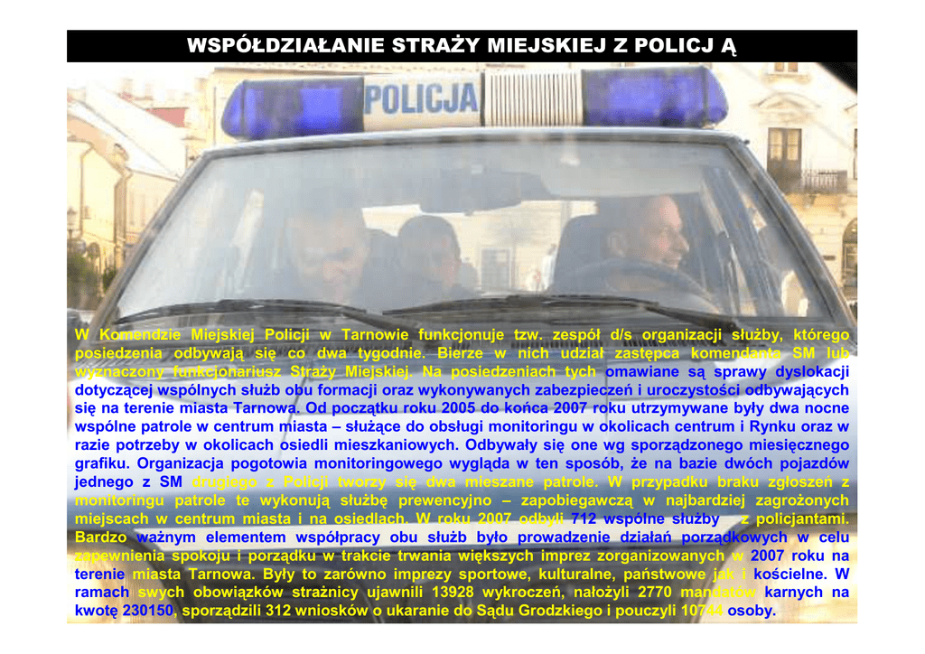 WSPÓŁDZIAŁANIE STRAśY MIEJSKIEJ Z POLICJ Ą W Komendzie Miejskiej Policji w Tarnowie funkcjonuje tzw. zespół d/s organizacji słuŜby, którego posiedzenia odbywają się co dwa tygodnie. Bierze w nich udział zastępca komendanta SM lub wyznaczony funkcjonariusz StraŜy Miejskiej. Na posiedzeniach tych omawiane są sprawy dyslokacji dotyczącej wspólnych słuŜb obu formacji oraz wykonywanych zabezpieczeń i uroczystości odbywających się na terenie miasta Tarnowa. Od początku roku 2005 do końca 2007 roku utrzymywane były dwa nocne wspólne patrole w centrum miasta – słuŜące do obsługi monitoringu w okolicach centrum i Rynku oraz w razie potrzeby w okolicach osiedli mieszkaniowych. Odbywały się one wg sporządzonego miesięcznego grafiku. Organizacja pogotowia monitoringowego wygląda w ten sposób, Ŝe na bazie dwóch pojazdów jednego z SM drugiego z Policji tworzy się dwa mieszane patrole. W przypadku braku zgłoszeń z monitoringu patrole te wykonują słuŜbę prewencyjno – zapobiegawczą w najbardziej zagroŜonych miejscach w centrum miasta i na osiedlach. W roku 2007 odbyli 712 wspólne słuŜby z policjantami. Bardzo waŜnym elementem współpracy obu słuŜb było prowadzenie działań porządkowych w celu zapewnienia spokoju i porządku w trakcie trwania większych imprez zorganizowanych w 2007 roku na terenie miasta Tarnowa. Były to zarówno imprezy sportowe, kulturalne, państwowe jak i kościelne. W ramach swych obowiązków straŜnicy ujawnili 13928 wykroczeń, nałoŜyli 2770 mandatów karnych na kwotę 230150, sporządzili 312 wniosków o ukaranie do Sądu Grodzkiego i pouczyli 10744 osoby. WSPÓ WSPÓŁPRACA STRAś STRAśY MIEJKIEJ Z INNYMI INSTYTYCJAMI I OSOBAMI PRYWATNYMI WZYWANO LUB PRZEKAZANO SPRAWY DO: 101 – POGOTOWIE RATUNKOWE 24 - STRAś POśARNA 312 – AZYL DLA ZWIERZĄT LUB WETERYNARZ 21 – POGOTWIE ENERGETYCZNE 17 - POGOTWIE WODOCIĄGOWE 149 – T.Z.D.M. 98 – M.P.G.K. TRANSFORMERS I INNE FIRMY SPRZĄTAJĄCE 46 – J.M.T. – FIRMA ODPOWIEDZIALNA ZA ZNAKI DROGOWE, SYGNALIZACJĘ ŚWIETLNĄ ORAZ ZA PRAWIDŁOWE OZNAKOWANIE DRÓG 76 – U.M.T. – RÓśNE WYDZIAŁY 239 – ADMINSTRATORZY, SPÓŁDZIELNIE MIESZKNIOWE, WŁAŚCICIELE NIERUCHOMOŚCI 5 – P.K.S. 1 – SAPERZY 89 – INNNE INSTYTUCJE LUB OSOBY WYPADEK – ULICA KRAKOWSKA MANITORING krótka historia - data powstania: 12 grudnia 2001 roku, - na początku działa 8 kamer, - obecnie – 33 kamery, - centrum miasta obejmuje 16 kamer – wykroczenia i przestępstwa w tym miejscu spadły o około 60%, - 17 kamer na osiedlach – pierwszy w Polsce monitoring osiedlowy, - do wszystkich kamer wspólne studio w Komendzie StraŜy Miejskiej, - obsługiwany 24 godziny na dobę w niedziele i święta równieŜ, - zapis wykorzystywany zarówno przez SM jak i Policję, Prokuraturę i Sądy (np.: morderstwo przy ulicy Krakowskiej, morderstwo małej dziewczynki przy ulicy Westerplatte) - wykorzystywany równieŜ w zwalczaniu wykroczeń (wybryki chuligańskie, bójki, nieobyczajne wybryki, zakłócanie porządku, wykroczenia drogowe,) MONITORING - INTERWENCJE Przeprowadzone interwencje dotyczyły: - 2 awantur rodzinnych, - 23 awarii oświetlenia, sygnalizacji i innych, - 28 bójek, - 122 wykroczeń drogowych, - 1 graffiti, - 6 kradzieŜy, - 86 nieobyczajnych wybryków, - 3 umieszczenia plakatów w miejscach niedozwolonych, - 3 porządku, - 6 psów puszczanych bez smyczy i kagańca w miejscu publicznym, - 46 spoŜywania alkoholu w miejscu publicznym, - 11 uszkodzenia mienia, - 46 wybryków chuligańskich i zakłócania spokoju publicznego, - 3 niszczenia zieleni, - 6 Ŝebrania, - 2 pomocy mieszkańcom – wezwano pogotowie ratunkowe, - 1 pobicia policjanta - 1 włamania - 1 poŜaru kamienicy - 148 razy udzielono podglądu obrazu policji, prokuraturze i sądom
