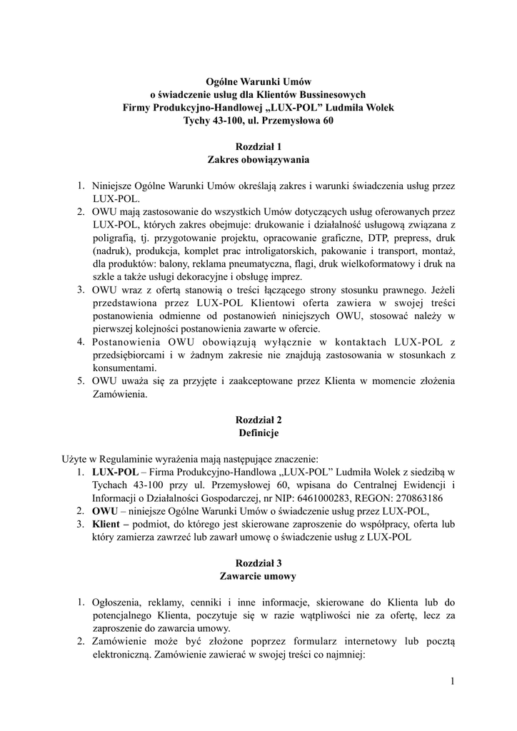 Ogólne Warunki Umów o świadczenie usług dla Klientów Bussinesowych Firmy Produkcyjno-Handlowej „LUX-POL” Ludmiła Wolek Tychy 43-100, ul. Przemysłowa 60 Rozdział 1 Zakres obowiązywania 1. Niniejsze Ogólne Warunki Umów określają zakres i warunki świadczenia usług przez LUX-POL. 2. OWU mają zastosowanie do wszystkich Umów dotyczących usług oferowanych przez LUX-POL, których zakres obejmuje: drukowanie i działalność usługową związana z poligrafią, tj. przygotowanie projektu, opracowanie graficzne, DTP, prepress, druk (nadruk), produkcja, komplet prac introligatorskich, pakowanie i transport, montaż, dla produktów: balony, reklama pneumatyczna, flagi, druk wielkoformatowy i druk na szkle a także usługi dekoracyjne i obsługę imprez. 3. OWU wraz z ofertą stanowią o treści łączącego strony stosunku prawnego. Jeżeli przedstawiona przez LUX-POL Klientowi oferta zawiera w swojej treści postanowienia odmienne od postanowień niniejszych OWU, stosować należy w pierwszej kolejności postanowienia zawarte w ofercie. 4. Postanowienia OWU obowiązują wyłącznie w kontaktach LUX-POL z przedsiębiorcami i w żadnym zakresie nie znajdują zastosowania w stosunkach z konsumentami. 5. OWU uważa się za przyjęte i zaakceptowane przez Klienta w momencie złożenia Zamówienia. Rozdział 2 Definicje Użyte w Regulaminie wyrażenia mają następujące znaczenie: 1. LUX-POL – Firma Produkcyjno-Handlowa „LUX-POL” Ludmiła Wolek z siedzibą w Tychach 43-100 przy ul. Przemysłowej 60, wpisana do Centralnej Ewidencji i Informacji o Działalności Gospodarczej, nr NIP: 6461000283, REGON: 270863186 2. OWU – niniejsze Ogólne Warunki Umów o świadczenie usług przez LUX-POL, 3. Klient – podmiot, do którego jest skierowane zaproszenie do współpracy, oferta lub który zamierza zawrzeć lub zawarł umowę o świadczenie usług z LUX-POL Rozdział 3 Zawarcie umowy 1. Ogłoszenia, reklamy, cenniki i inne informacje, skierowane do Klienta lub do potencjalnego Klienta, poczytuje się w razie wątpliwości nie za ofertę, lecz za zaproszenie do zawarcia umowy. 2. Zamówienie może być złożone poprzez formularz internetowy lub pocztą elektroniczną. Zamówienie zawierać w swojej treści co najmniej: (1 3. 4. 5. 6. - oświadczenie Klienta o zapoznaniu się z OWU, - dane Klienta niezbędne do wystawienia faktury, - rodzaj usług, ich ilość, rozmiar i inne niezbędne dane – wskazane w formularzu internetowym zamówienia - wartość usługi ustalona w oparciu o ofertę, z uwzględnieniem ustaleń dokonanych z pracownikiem LUX-POL, - sugerowany przez Klienta termin realizacji, z uwzględnieniem ustaleń dokonanych z pracownikiem LUX-POL. Dodatkowo zamówienie może określać osobę uprawnioną do odbioru produktu i podpisywania faktur VAT i innych dokumentów. LUX-POL po sporządzeniu projektu produktu (wizualizacji), przedstawia go Klientowi do akceptacji. Klient zobowiązany jest do dokonania akceptacji lub zgłoszenia uwag w najkrótszym możliwym terminie. Za datę zlecenia danej usługi uważa się datę akceptacji wizualizacji oraz wpływu zaliczki w wypadkach gdy jest ona wymagana, przy czym jeżeli wpływ środków lub akceptacja nastąpiły po godzinie 15.00 w dni robocze, tj. od poniedziałku do piątku, zlecenie uważa się za złożone następnego dnia roboczego. Jeżeli treść złożonego zamówienia zawiera postanowienie sprzeczne z OWU lub ofertą, to obowiązują one LUX-POL tylko w wypadku gdy pisemnie, wyraźnie zaakceptuje on jego warunki. W innym przypadku w miejsce tego postanowienia stosuje się odpowiedni zapis OWU bądź oferty. Dla balonów - LUXPOL dobiera kolory nadruku z tabeli Panton od zamówień powyżej 1000 sztuk, poniżej tej ilości drukowane są kolory podstawowe. Rozdział 4 Wynagrodzenie i płatność 1. Wynagrodzenie LUX-POL zostanie określone w oparciu o stawki wynagrodzenia zawarte w ofercie, chyba że strony określą wynagrodzenie LUX-POL w inny sposób. 2. Jeżeli nic innego nie stanowi oferta podane ceny nie zawierają kosztów montażu, transportu oraz innych kosztów dodatkowych. 3. Jeżeli nic innego nie stanowi oferta zapłata następuje na podstawie wystawionej przez LUX-POL faktury VAT, w terminie wskazanym na fakturze. Wszystkie podane ceny są cenami netto (bez podatku VAT). Wynagrodzenie zostanie powiększone o należny podatek VAT. 4. W wypadku zamówień: a) dotyczących druku na balonach powyżej 5 tysięcy sztuk; b) reklamy pneumatycznej oraz wykonania usługi powyżej 5000 zł wartości brutto wymagana jest zaliczka w wysokości 40% wartości zamówienia brutto. 5. Płatność dokonywana będzie przelewem na wskazany na fakturze VAT rachunek bankowy LUX-POL. Za datę zapłaty uważa się termin uznania należności w pełnej kwocie na rachunku bankowym LUX-POL. 6. W przypadku niedokonania lub nieterminowego dokonania wpłat, LUX-POL jest upoważniony do wstrzymania prac i nie ponosi odpowiedzialności za niedotrzymanie terminów realizacji zamówień Klienta pozostającego w opóźnieniu z płatnościami. (2 7. W razie opóźnienia w zapłacie, Klient zobowiązany jest bez odrębnego wezwania do zapłaty odsetek ustawowych. Rozdział 5 Zasady współpracy 1. Klient na wniosek LUX-POL zobowiązany jest do przekazania LUX-POL w zakreślonym terminie informacji, oraz materiałów niezbędnych dla realizacji usługi świadczonej przez LUX-POL na rzecz Klienta. 2. Wymagane parametry techniczne dla: a) druku balonów - krzywe wektorowe bądż pdf b) druku wielkoformatowego i UV - pliki spłaszczone bez warstw w skali 1;1 - 100 dpi; w większym formacie w skali 1;10 - 300 dpi - kolorystyka CMYK - profil kolorystyczny iso coated 2/fogra 39 - kompresja LZW - nazwy plików opisane wymiarem docelowym 3. Dostarczone materiały nie mogą naruszać obowiązujących przepisów prawa ani też praw osób trzecich, a pełną odpowiedzialność za skutki ich publikacji ponosi Klient. W szczególności Klient oświadcza 
