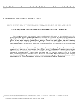 A R C Volume 52 H I V E S O F M E T A L L U R G Y A N D M A T E R I 2007 A L S Issue 1 K. WIERZBANOWSKI∗ , A. BACZMAŃSKI∗ , P. LIPIŃSKI∗∗ , A. LODINI∗∗∗ ELASTO-PLASTIC MODELS OF POLYCRYSTALLINE MATERIAL DEFORMATION AND THEIR APPLICATIONS MODELE SPRĘŻYSTO-PLASTYCZNE ODKSZTAŁCENIA POLIKRYSZTAŁU I ICH ZASTOSOWANIA Then elasto-plastic models, used for analysis of polycrystalline material deformation are presented and discussed. Two models are presented in details: the Leffers-Wierzbanowski model and the elasto-plastic self-consistent model, developed by Lipinski, Berveiller and Zaoui. The crystallographic mechanisms of plastic deformation, being the basis of the models, are evoked. The both models have many common elements, they differ, however, in the type of assumed grain-matrix interaction. Some current applications of the decribed models are shown. They are e.g.: prediction of deformation textures, stress-strain curves and distribution of the stored energy as well as the interpretation of residual stress measurement by diffraction technique. W pracy przedstawiono podstawowe modele typu sprężysto-plastycznego, używane do opisu odkształcenia materiałów polikrystalicznych. Omówiono w szczegółach dwa modele: model Leffersa-Wierzbanowskiego oraz sprężysto-plastyczny model samo-uzgodniony, opracowany przez Lipińskiego, Berveillera i Zaoui. Scharakteryzowano mechanizmy krystalograficzne odkształcenia plastycznego, leżące u podstaw modeli. Oba modele maja wiele wspólnych elementów, różnią się one jednak typem założonego oddziaływania pomiędzy ziarnem i otaczającym go materiałem. Pokazano kilka najczęstszych zastosowań omówionych modeli. Są nimi np.: przewidywanie tekstur odkształcenia, makroskopowych krzywych umocnienia oraz rozkładu energii zgromadzonej w materiale jak również interpretacja dyfrakcyjnych badań naprężeń wewnętrznych. ∗ ∗∗ FACULTY OF PHYSICS AND APPLIED COMPUTER SCIENCE, AGH UNIVERSITY OF SCIENCE AND TECHNOLOGY, 30-059 KRAKÓW, AL. MICKIEWICZA 30, POLAND ∗∗∗ ECOLE NATIONALE D’INGENIEURS DE METZ, LFM, ILE DU SAULCY, 57045 METZ, FRANCE UNIVERSITE DE REIMS CHAMPAGNE ARDENNE, LACM, 9, BD. DE LA PAIX, 51100 REIMS, FRANCE