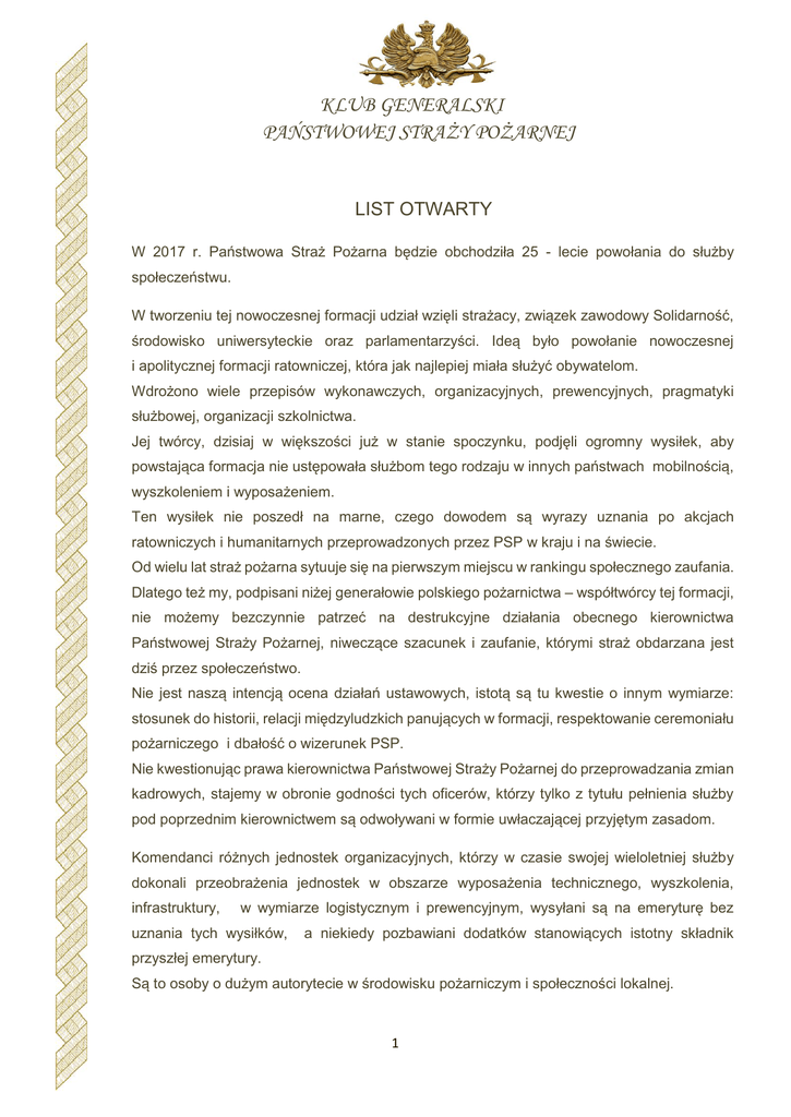 KLUB GENERALSKI PAŃSTWOWEJ STRAŻY POŻARNEJ LIST OTWARTY W 2017 r. Państwowa Straż Pożarna będzie obchodziła 25 - lecie powołania do służby społeczeństwu. W tworzeniu tej nowoczesnej formacji udział wzięli strażacy, związek zawodowy Solidarność, środowisko uniwersyteckie oraz parlamentarzyści. Ideą było powołanie nowoczesnej i apolitycznej formacji ratowniczej, która jak najlepiej miała służyć obywatelom. Wdrożono wiele przepisów wykonawczych, organizacyjnych, prewencyjnych, pragmatyki służbowej, organizacji szkolnictwa. Jej twórcy, dzisiaj w większości już w stanie spoczynku, podjęli ogromny wysiłek, aby powstająca formacja nie ustępowała służbom tego rodzaju w innych państwach mobilnością, wyszkoleniem i wyposażeniem. Ten wysiłek nie poszedł na marne, czego dowodem są wyrazy uznania po akcjach ratowniczych i humanitarnych przeprowadzonych przez PSP w kraju i na świecie. Od wielu lat straż pożarna sytuuje się na pierwszym miejscu w rankingu społecznego zaufania. Dlatego też my, podpisani niżej generałowie polskiego pożarnictwa – współtwórcy tej formacji, nie możemy bezczynnie patrzeć na destrukcyjne działania obecnego kierownictwa Państwowej Straży Pożarnej, niweczące szacunek i zaufanie, którymi straż obdarzana jest dziś przez społeczeństwo. Nie jest naszą intencją ocena działań ustawowych, istotą są tu kwestie o innym wymiarze: stosunek do historii, relacji międzyludzkich panujących w formacji, respektowanie ceremoniału pożarniczego i dbałość o wizerunek PSP. Nie kwestionując prawa kierownictwa Państwowej Straży Pożarnej do przeprowadzania zmian kadrowych, stajemy w obronie godności tych oficerów, którzy tylko z tytułu pełnienia służby pod poprzednim kierownictwem są odwoływani w formie uwłaczającej przyjętym zasadom. Komendanci różnych jednostek organizacyjnych, którzy w czasie swojej wieloletniej służby dokonali przeobrażenia jednostek w obszarze wyposażenia technicznego, wyszkolenia, infrastruktury, w wymiarze logistycznym i prewencyjnym, wysyłani są na emeryturę bez uznania tych wysiłków, a niekiedy pozbawiani dodatków stanowiących istotny składnik przyszłej emerytury. Są to osoby o dużym autorytecie w środowisku pożarniczym i społeczności lokalnej. 1 Odwołuje się oficerów z wybitnymi kwalifikacjami, którzy tworzyli system ratownictwa technicznego i pomocy humanitarnej, profesjonalistów uznanych w kraju i na świecie, przenosząc ich do innych jednostek, niekiedy na niższe stanowiska. Oficerów o znikomym lub wręcz nie posiadających żadnego doświadczenia w kierowaniu dużymi organizacjami powołuje się na stanowiska komendantów wojewódzkich, by po upływie kilku miesięcy awansować ich o dwa stopnie bez zachowania wymaganego 9-letniego okresu dzielącego kolejne nominacje. Podobne sytuacje występują i w innych jednostkach organizacyjnych PSP. Decyzje personalne powodują duże obawy o odpowiedzialność przełożonych za te nominacje. Powstaje zatem pytanie: jaki mogą mieć szacunek strażacy do tak nadawanych stopni służbowych i kadry awansowanej bez poszanowania obowiązujących norm a w konsekwencji o wpływ tych działań na bezpieczeństwo naszych obywateli? Ceremoniał pożarniczy, stanowiący swoisty kodeks moralny straży pożarnej, jest deprecjonowany. To ceremoniał określa zasady obejmowania i zdawania stanowisk kierowniczych i dowódczych w jednostkach organizacyjnych PSP. Ceremoniał ten wymaga, aby odchodzący oficerowie pożegnali się ze sztandarem przed frontem pododdziałów. Tymczasem uniemożliwia się oficerom godne odejście z jednostek, a ten sposób upokarzania ich stał się wręcz normą. Trudno zresztą wymagać od podwładnych, by pielęgnowali tradycje zapisane w ceremoniale, skoro sam komendant główny PSP nie przywitał się ze sztandarem, obejmując najwyższe w tej formacji dowództwo. Obecne kierownictwo Komendy Głównej wydaje podległym jednostkom dyspozycje zrywania kontaktów z poprzednią kadrą, zabraniając jakichkolwiek kontaktów. Zakazuje się także kontaktów z organizacjami społecznymi, w tym organizacjami pożytku publicznego, zarzucając im dążenie do osiągnięcia korzyści majątkowych kosztem PSP – mimo że organizacje te nigdy nie korzystały z jakiegokolwiek dofinansowania ze środków państwowych (również z PSP). Bardzo wyrazistym przykładem jest stosunek do Fundacji Edukacja i Technika Ratownictwa EDURA. Fundacja ta w okresie swojej 15-letniej działalności pozyskała dla straży pożarnej ponad 8,5 mln zł, m.in. na zakupy sprzętu ratowniczego i ochronnego, pomoc dla osób poszkodowanych w akcjach i ich rodzin. Dyspozycja komendanta głównego PSP wywołuje wzburzenie w środowisku pożarniczym – co nie dziwi, gdyż jest ewidentnym naruszeniem przepisów ustawy o Państwowej Straży Pożarnej, stanowiących, że do obowiązków komendanta głównego należy wspieranie inicjatyw społecznych w zakresie ochrony przeciwpożarowej i ratownictwa. 2 Ogromny niepokój budzi fakt, że dotyczy wielu różnych organizacji społecznych niosących pomoc i zaangażowanych w ratownictwo a zwłaszcza naszych braci strażaków ochotników, którym zmiany strukturalne w finansowaniu zakupów sprzętu ograniczają ufność do władz. Niedawna decyzja komendanta głównego PSP o ogłoszeniu konkursu na projekt graficzny nowego znaku – logotypu Państwowej Straży Pożarnej niestety również wpisuje się w ciąg wydarzeń mających zdyskredytować dotychczasowe osiągnięcia tej formacji, zafałszować jej dokonania i zapewne doprowadzić do ogłoszenia „powstania nowej formacji”. Należy przypomnieć, że znak ten został ustanowiony w następstwie zmian – gdy polski parlament uchwalił 24 sierpnia 1991 r. ustawę o ochronie przeciwpożarowej oraz ustawę o Państwowej Straży Pożarnej. Od tego dnia rozpoczął się długotrwały proces tworzenia i rozwoju nowoczesnej formac