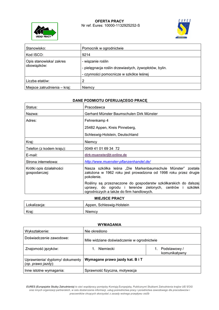 OFERTA PRACY Nr ref. Eures: 10000-1132925252-S Stanowisko: Pomocnik w ogrodnictwie Kod ISCO: 9214 Opis stanowiska/ zakres obowiązków: - wiązanie roślin - pielęgnacja roślin drzewiastych, żywopłotów, bylin. - czynności pomocnicze w szkółce leśnej Liczba etatów: 2 Miejsce zatrudnienia – kraj: Niemcy DANE PODMIOTU OFERUJĄCEGO PRACĘ Status: Pracodawca Nazwa: Gerhard Münster Baumschulen Dirk Münster Adres: Fehrenkamp 4 25482 Appen, Kreis Pinneberg, Schleswig-Holstein, Deutschland Kraj: Niemcy Telefon (z kodem kraju): 0049 41 01 69 34 72 E-mail: [email protected] Strona internetowa: http://www.muenster-pflanzenhandel.de/ Krótki opis działalności gospodarczej: Nasza szkółka leśna „Die Markenbaumschule Münster” została założona w 1962 roku jest prowadzona od 1998 roku przez drugie pokolenie. Rośliny są przeznaczone do gospodarstw szkółkarskich do dalszej uprawy, do ogrodu i terenów zielonych, centrów i szkółek ogrodniczych a także do firm handlowych. MIEJSCE PRACY Lokalizacja: Appen, Schleswig-Holstein Kraj: Niemcy WYMAGANIA Wykształcenie: Doświadczenie zawodowe: Znajomość języków: Nie określono Mile widziane doświadczenie w ogrodnictwie 1. Niemiecki Uprawnienia/ dyplomy/ dokumenty (np. prawo jazdy): Wymagane prawo jazdy kat. B i T Inne istotne wymagania: Sprawność fizyczna, motywacja 1. Podstawowy / komunikatywny EURES (Europejskie Służby Zatrudnienia) to sieć współpracy pomiędzy Komisją Europejską, Publicznymi Służbami Zatrudnienia krajów UE/ EOG oraz innych organizacji partnerskich, w celu dostarczania informacji, usług pośrednictwa pracy i poradnictwa zawodowego dla pracodawców i pracowników chcących skorzystać z zasady wolnego przepływu osób WYNAGRODZENIE I WARUNKI ZATRUDNIENIA Wysokość pensji brutto: 8,50 Euro / godz. Rodzaj stawki wynagrodzenia: Godzinowa Dodatkowe świadczenia: Pracodawca organizuje zakwaterowanie w pokoju 2osobowym płatne przez pracownika – dziennie 3 Euro / os. Nazwa firmy, z którą zostanie podpisana umowa: Gerhard Münster Baumschulen Dirk Münster Rodzaj umowy: Umowa o pracę Wymiar czasu pracy Pełen etat Czas trwania umowy: Na czas określony Liczba godzin tygodniowo: 60 Zmiany i praca w dni wolne: Nie Data rozpoczęcia: Od zaraz Do 18.12.2015 SPOSÓB SKŁADANIA WNIOSKU Wymagane dokumenty: CV Język, w którym muszą być sporządzone przedkładane dokumenty: Niemiecki Do kogo należy wysłać dokumenty: Do pracodawcy Gdzie należy wysłać dokumenty: [email protected] Dane teleadresowe doradcy EURES lub przedstawiciela pracodawcy: Pan i Pani Münster 0049 41 01 69 34 72 WAŻNOŚĆ Data publikacji: 25.09.2015 r. Termin przedkładania podań o pracę / zakończenia ważności oferty: Do odwołania UWAGA: 1. Umowa z zagranicznym pracodawcą zostanie zawarta zgodnie z prawem kraju zatrudnienia. Oznacza to, że wszystkie roszczenia odnośnie do warunków, które obejmuje umowa, można kierować wyłącznie do odpowiedniego sądu w kraju zatrudnienia. Publiczne służby zatrudnienia (EURES) nie mogą pośredniczyć ani reprezentować pracownika w sądzie kraju zatrudnienia w przypadku sporu z pracodawcą. 2. Publiczne służby zatrudnienia (EURES) dokładają wszelkich starań, aby zapewnić rzetelność i wiarygodność ofert pracy zgłoszonych w lokalnym urzędzie pracy. Należy wyjaśnić, że oferta pracy została zgłoszona przez stronę trzecią i EURES nie odpowiada za ewentualne rozbieżności między warunkami pracy określonymi w ofercie pracy i warunkami oferowanymi przez potencjalnego pracodawcę. 3. Publiczne służby zatrudnienia (EURES) informują, że będą zbierać, przetwarzać i przekazywać potencjalnym pracodawcom zgodnie z przepisami dotyczącymi ochrony danych osobowych wszystkie dane osobowe dostarczone przez osoby poszukujące pracy. EURES (Europejskie Służby Zatrudnienia) to sieć współpracy pomiędzy Komisją Europejską, Publicznymi Służbami Zatrudnienia krajów UE/ EOG oraz innych organizacji partnerskich, w celu dostarczania informacji, usług pośrednictwa pracy i poradnictwa zawodowego dla pracodawców i pracowników chcących skorzystać z zasady wolnego przepływu osób