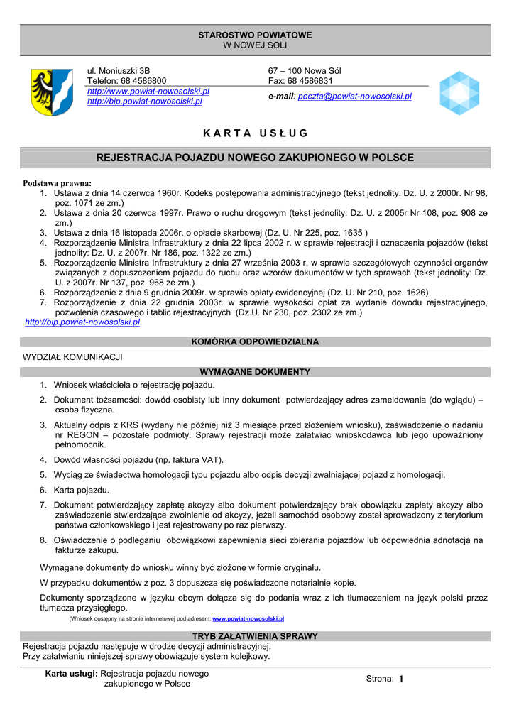 STAROSTWO POWIATOWE W NOWEJ SOLI ul. Moniuszki 3B Telefon: 68 4586800 http://www.powiat-nowosolski.pl http://bip.powiat-nowosolski.pl 67 – 100 Nowa Sól Fax: 68 4586831 e-mail: [email protected] KARTA USŁUG REJESTRACJA POJAZDU NOWEGO ZAKUPIONEGO W POLSCE Podstawa prawna: 1. Ustawa z dnia 14 czerwca 1960r. Kodeks postępowania administracyjnego (tekst jednolity: Dz. U. z 2000r. Nr 98, poz. 1071 ze zm.) 2. Ustawa z dnia 20 czerwca 1997r. Prawo o ruchu drogowym (tekst jednolity: Dz. U. z 2005r Nr 108, poz. 908 ze zm.) 3. Ustawa z dnia 16 listopada 2006r. o opłacie skarbowej (Dz. U. Nr 225, poz. 1635 ) 4. Rozporządzenie Ministra Infrastruktury z dnia 22 lipca 2002 r. w sprawie rejestracji i oznaczenia pojazdów (tekst jednolity: Dz. U. z 2007r. Nr 186, poz. 1322 ze zm.) 5. Rozporządzenie Ministra Infrastruktury z dnia 27 września 2003 r. w sprawie szczegółowych czynności organów związanych z dopuszczeniem pojazdu do ruchu oraz wzorów dokumentów w tych sprawach (tekst jednolity: Dz. U. z 2007r. Nr 137, poz. 968 ze zm.) 6. Rozporządzenie z dnia 9 grudnia 2009r. w sprawie opłaty ewidencyjnej (Dz. U. Nr 210, poz. 1626) 7. Rozporządzenie z dnia 22 grudnia 2003r. w sprawie wysokości opłat za wydanie dowodu rejestracyjnego, pozwolenia czasowego i tablic rejestracyjnych (Dz.U. Nr 230, poz. 2302 ze zm.) http://bip.powiat-nowosolski.pl KOMÓRKA ODPOWIEDZIALNA WYDZIAŁ KOMUNIKACJI WYMAGANE DOKUMENTY 1. Wniosek właściciela o rejestrację pojazdu. 2. Dokument tożsamości: dowód osobisty lub inny dokument potwierdzający adres zameldowania (do wglądu) – osoba fizyczna. 3. Aktualny odpis z KRS (wydany nie później niż 3 miesiące przed złożeniem wniosku), zaświadczenie o nadaniu nr REGON – pozostałe podmioty. Sprawy rejestracji może załatwiać wnioskodawca lub jego upoważniony pełnomocnik. 4. Dowód własności pojazdu (np. faktura VAT). 5. Wyciąg ze świadectwa homologacji typu pojazdu albo odpis decyzji zwalniającej pojazd z homologacji. 6. Karta pojazdu. 7. Dokument potwierdzający zapłatę akcyzy albo dokument potwierdzający brak obowiązku zapłaty akcyzy albo zaświadczenie stwierdzające zwolnienie od akcyzy, jeżeli samochód osobowy został sprowadzony z terytorium państwa członkowskiego i jest rejestrowany po raz pierwszy. 8. Oświadczenie o podleganiu obowiązkowi zapewnienia sieci zbierania pojazdów lub odpowiednia adnotacja na fakturze zakupu. Wymagane dokumenty do wniosku winny być złożone w formie oryginału. W przypadku dokumentów z poz. 3 dopuszcza się poświadczone notarialnie kopie. Dokumenty sporządzone w języku obcym dołącza się do podania wraz z ich tłumaczeniem na język polski przez tłumacza przysięgłego. (Wniosek dostępny na stronie internetowej pod adresem: www.powiat-nowosolski.pl TRYB ZAŁATWIENIA SPRAWY Rejestracja pojazdu następuje w drodze decyzji administracyjnej. Przy załatwianiu niniejszej sprawy obowiązuje system kolejkowy. Karta usługi: Rejestracja pojazdu nowego zakupionego w Polsce Strona: 1 OPŁATY 1. 13,50 zł – pozwolenie czasowe. 2. 30,00 zł – tablice rejestracyjne motorowerowe. 3. 40,00 zł – tablice rejestracyjne motocyklowe. 4. 80,00 zł – tablice rejestracyjne samochodowe. 5. 1000,00 zł - tablice rejestracyjne indywidualne samochodowe. 6. 500,00 zł – tablice rejestracyjne indywidualne motocyklowe. 7. 40,00 zł – tablice rejestracyjne na przyczepę. 8. 12,50 zł – komplet nalepek legalizacyjnych. Opłaty: 9. 18,50 zł – nalepka kontrolna na szybę pojazdu. 10. 54,00 zł – dowód rejestracyjny. 11. Opłata ewidencyjna za wydanie: a. dowodu rejestracyjnego – 0,50 zł, b. pozwolenia czasowego – 0,50 zł, c. nalepki kontrolnej – 0,50 zł, d. zalegalizowanych tablic rejestracyjnych – 0,50 zł, Opłata skarbowa: nie podlega opłacie skarbowej: dokonanie czynności urzędowej, wydanie zaświadczenia oraz zezwolenia (pozwolenia, koncesji) jeżeli na podstawie odrębnych przepisów podlegają innym opłatą o charakterze publicznoprawnym lub są od tych opłat zwolnione SPOSÓB DOSTARCZENIA DOKUMENTÓW Niezbędne dokumenty należy złożyć osobiście lub przez pełnomocnika MIEJSCE ZŁOŻENIA DOKUMENTÓW Wydział Komunikacji Starostwa Powiatowego w Nowej Soli ul. Moniuszki 3 pok. nr 4 CZAS ZAŁATWIENIA SPRAWY 1. Niezwłocznie - sprawy nie wymagające zbierania dowodów, informacji lub wyjaśnień. 2. Do 1 miesiąca - sprawy wymagające postępowania wyjaśniającego. 3. Do 2 miesięcy - sprawy szczególnie skomplikowane TRYB ODWOŁAWCZY Do Samorządowego Kolegium Odwoławczego w terminie 14 dni od dnia doręczenia decyzji za pośrednictwem organu, który wydał decyzję. FORMULARZ DO POBRANIA Wniosek dostępny jest w : - Biurze Obsługi Interesanta - Wydziale Komunikacji Starostwa Powiatowego w Nowej Soli ul. Moniuszki 3 - BIP na stronie: http://bip.powiat-nowosolski Karta usługi: Rejestracja pojazdu nowego zakupionego w Polsce Strona: 2