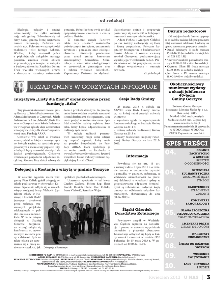 wstęp od redakcji Ekologia, odpady i śmieci zdominowały nie tylko ostatnią sesję rady gminy. Zdominowały też łamy naszej gazety, której najnowszy numer otrzymują Państwo do swoich rąk. Polecam w szczególności znakomity tekst Jerzego Rebesia. Wielikąt, który stanowił jeden z piękniejszych zakątków naszego powiatu, zmienia swoje oblicze w przerażającym tempie, w związku z budową zbiornika Racibórz Dolny. Trwa wycinka wiekowych drzew, a drastyczne rozmiary zniszczenia porażają. Rebeś kończy swój artykuł optymistycznym akcentem z czaszy polderu Buków. W numerze znajdą Państwo także cały „pakiet” materiałów poświęconych śmieciom, utrzymaniu czystości i porządku oraz ekologii: obszerne informacje przekazane przez urząd gminy, komentarz samorządowy Stanisława Sitka, relacje z warsztatów ekologicznych w czyżowickim gimnazjum oraz z zebrań wiejskich (sołeckich). Zapraszamy Państwa do dyskusji. Najciekawsze opinie i propozycje postaramy się zamieścić w kolejnych numerach naszego miesięcznika. Adam Fichna i Grzegorz Chlebik po raz kolejny zachwycają się f lorą i fauną pogranicza. Polecam kapitalny fotoreportaż z bezkrwawych łowów Adama i równie ciekawy artykuł Grzegorza, podsumowujący wyniki jego wieloletnich badań. Ptasia wiosna od lat przyspiesza, nasza - długo wyczekiwana - wreszcie zawitała. D. Jakubczyk URZĄD GMINY W GORZYCACH INFORMUJE Inicjatywa „Listy dla Ziemi” organizowana przez fundację „Arka” Trzy placówki oświatowe z terenu gminy Gorzyce tj. Szkoła Podstawowa nr 1 im. Adama Mickiewicza w Gorzycach, Szkoła Podstawowa nr 2 im. „Marcela” Józefa Kolorza w Gorzycach oraz Szkoła Podstawowa w Rogowie zgłosiły chęć uczestnictwa w inicjatywie „Listy dla Ziemi” organizowanej przez Fundację ARKA. Uczniowie ww. szkół w kwietniu wezmą udział w lekcjach tematycznych po których napiszą na specjalnie przygotowanym z makulatury papierze listy, w których będą namawiać dorosłych do działań proekologicznych. Głównym tematem jest gospodarka odpadami i recykling. Gotowe listy dzieci zabiorą do domu i przekażą dorosłym. Po przeczytaniu listów rodzina wspólnie zastanowi się nad działaniami ekologicznymi, jakie może podjąć w swoim otoczeniu. Spośród członków rodziny wybierze Strażaka, który będzie odpowiedzialny za realizację tych zadań. W trakcie realizacji postanowień uczestnicy mogą robić zdjęcia czy napisać reportaż, który można przesłać bezpośrednio do Fundacji ARKA, która opublikuje je na swoim profilu na Facebooku – www.facebook.com/listydlaziemi. Spośród wszystkich listów wybrany zostanie najpiękniejszy List dla Ziemi. Delegacja z Kostanje z wizytą w gminie Gorzyce W ostatnim tygodniu marca wójt i polskich placówkach oświatowych. gminy Piotr Oślizło gościł delegację ze Uczestnicy spotkania – od lewej: szkoły podstawowej w chorwackiej Ko- Czesław Zychma, Helena Łyp, Ilona stanje. Spotkanie odbyło się w ramach Procek, Daniela Dadič, Piotr Oślizło, wizyty studyjnej Ivany Vlahovič (dy- Ivana Vlahovič, Stanisław Wujec. rektora szkoły w Kostanje) i Danieli Dadič fot. W. Langrzyk (zastępcy dyrektora) przed realizacją trójstronnych projektów edukacyjnych – polsko-czesko-chor wackich. W czasie pobytu delegacji w Śląskiej Ostrawie (organizator wizyty) odbyła się konferencja nt. nowoczesnych metod w pracy z dziećmi. Była to także okazja do zapoznania się z pracą zarówno w czeskich, jak Delegacja z Konstanje. Sesja Rady Gminy 25 marca 2013 r. odbyła się XXVIII sesja Rady Gminy Gorzyce, na której radni przyjęli uchwały w sprawie: – wyrażenia zgody na wyodrębnienie funduszu sołeckiego w budżecie Gminy Gorzyce na 2014 r.; – zmiany uchwały budżetowej Gminy Gorzyce na 2013 r.; – zmiany Wieloletniej Prognozy Finansowej Gminy Gorzyce na lata 20132019. Informacja Powołując się na art. 11 ust. 2 ustawy z dnia 1 lipca 2011 r. o zmianie ustawy o utrzymaniu czystości i porządku w gminach, informuję, iż właściciele nieruchomości do pierwszej deklaracji o wysokości opłaty za gospodarowanie odpadami komunalnymi są zobowiązani dołączyć kopię umowy na odbieranie odpadów komunalnych, obowiązującą do dnia 30.06.2013 r. Śląski Ośrodek Doradztwa Rolniczego Powiatowy zespół w Wodzisławiu Śląskim zaprasza na konsultacje i pomoc w zakresie wypełniania wniosków o płatności obszarowe. Konsultacje odbywać się będą w każdy wtorek i czwartek w remizie OSP Bełsznica do 15 maja 2013 r. W godzinach od 8.00 do 15.00. MIESIĘCZNIK "U NAS", nr 04/243/2013, e-mail: [email protected], tel. 32 453 00 59 | WYDAWCA: WDK Gorzyce ADRES REDAKCJI: 44-350 Gorzyce, ul. M. Kopernika 8 | REDAKTOR NACZELNY: Daniel Jakubczyk REDAKTOR TECHNICZNY: Wioletta Langrzyk | SEKRETARZ: Krystyna Okoń | REDAKTORZY: Władysława Bańczyk, Bibianna Dawid, Andrzej Nowak, Piotr Pawlica, Jan Psota, Stanisław Sitek | SKŁAD KOMPUTEROWY: Paweł Moszczyński | KOREKTA: Magorzata Musińska WSPÓŁPRACA: Piotr Będziński, Tadeusz Brachman, Czesław Czaika, Martyna Czerny, Marzena Hojka, Bogusław Jordan, ks. dr Henryk Olszar, Danuta Parma, Jerzy Rebeś, Irena Sauer. NAKŁAD: 1100 egz. | DRUK: "Infopakt", tel. 32 423 85 61 Dyżury redaktorów Od maja jesteśmy do Państwa dyspozycji w siedzibie redakcji lub pod podanymi niżej numerami telefonów. Czekamy na opinie, komentarze, propozycje tematów. ••Daniel Jakubczyk II środa miesiąca 15.40-16.30 (w siedzibie redakcji, lub tel. 728 822 139) ••Andrzej Nowak III poniedziałek miesiąca 17.00-18.00 w siedzibie redakcji ••Krystyna Okoń III środa miesiąca 17.00-18.00 w siedzibie redakcji ••Jan Psota - IV wtorek miesiąca 18.00-19.00 w siedzibie redakcji Okolicznościowy numizmat wydany z okazji jubileuszu 40-lecia Gminy Gorzyce Emitent: Gmina Gorzyce Producent: Mennica Śląska Sp. z o.o. Rok emisji: 2013 Nakład: 1000 sztuk, mosiądz Średnica: 30,88 mm, Ciężar: 12g w