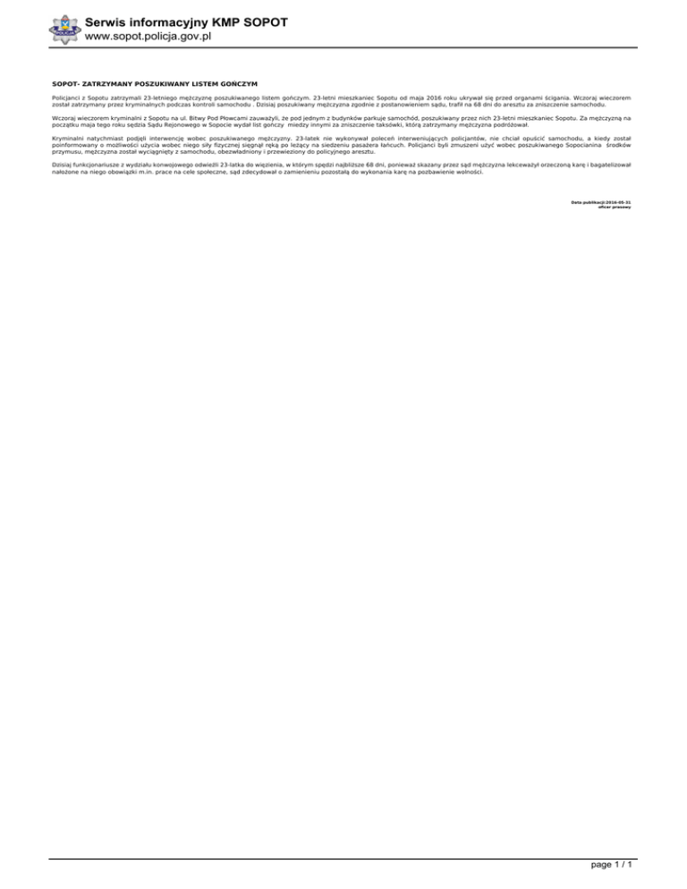 Serwis informacyjny KMP SOPOT www.sopot.policja.gov.pl SOPOT- ZATRZYMANY POSZUKIWANY LISTEM GOŃCZYM Policjanci z Sopotu zatrzymali 23-letniego mężczyznę poszukiwanego listem gończym. 23-letni mieszkaniec Sopotu od maja 2016 roku ukrywał się przed organami ścigania. Wczoraj wieczorem został zatrzymany przez kryminalnych podczas kontroli samochodu . Dzisiaj poszukiwany mężczyzna zgodnie z postanowieniem sądu, trafił na 68 dni do aresztu za zniszczenie samochodu. Wczoraj wieczorem kryminalni z Sopotu na ul. Bitwy Pod Płowcami zauważyli, że pod jednym z budynków parkuje samochód, poszukiwany przez nich 23-letni mieszkaniec Sopotu. Za mężczyzną na początku maja tego roku sędzia Sądu Rejonowego w Sopocie wydał list gończy miedzy innymi za zniszczenie taksówki, którą zatrzymany mężczyzna podróżował. Kryminalni natychmiast podjęli interwencję wobec poszukiwanego mężczyzny. 23-latek nie wykonywał poleceń interweniujących policjantów, nie chciał opuścić samochodu, a kiedy został poinformowany o możliwości użycia wobec niego siły fizycznej sięgnął ręką po leżący na siedzeniu pasażera łańcuch. Policjanci byli zmuszeni użyć wobec poszukiwanego Sopocianina środków przymusu, mężczyzna został wyciągnięty z samochodu, obezwładniony i przewieziony do policyjnego aresztu. Dzisiaj funkcjonariusze z wydziału konwojowego odwieźli 23-latka do więzienia, w którym spędzi najbliższe 68 dni, ponieważ skazany przez sąd mężczyzna lekceważył orzeczoną karę i bagatelizował nałożone na niego obowiązki m.in. prace na cele społeczne, sąd zdecydował o zamienieniu pozostałą do wykonania karę na pozbawienie wolności. Data publikacji:2016-05-31 oficer prasowy page 1 / 1 Powered by TCPDF (www.tcpdf.org)