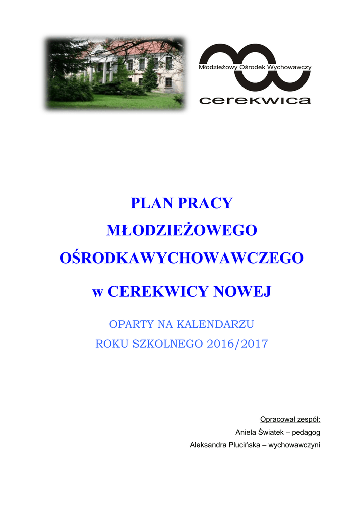 PLAN PRACY MŁODZIEŻOWEGO OŚRODKAWYCHOWAWCZEGO w CEREKWICY NOWEJ OPARTY NA KALENDARZU ROKU SZKOLNEGO 2016/2017 Opracował zespół: Aniela Światek – pedagog Aleksandra Plucińska – wychowawczyni Główne cele resocjalizacyjno – wychowawcze na rok szkolny 2016/2017: 1. Tworzenia przyjaznego klimatu społecznego w Ośrodku na rzecz wzmacniania poczucia bezpieczeństwa i i wychowawczych poprzez skuteczności oddziaływań resocjalizacyjnych respektowanie norm społecznych i wychowanie do wartości. 2. Upowszechnianie czytelnictwa, rozwijanie kompetencji czytelniczych wśród młodzieży. 3. Współpraca Ośrodka i środowiska lokalnego na rzecz wzajemnego rozwoju. Zadania przewidziane do realizacji w pracy resocjalizacyjnej i dydaktyczno – wychowawczej: 1. Udzielanie pomocy psychologiczno – pedagogicznej z uwzględnieniem specyficznych potrzeb edukacyjnych i terapeutycznych wychowanek. 2. Kształtowanie nawyku respektowania norm prawnych i społecznych. 3. Rozwiązywanie konfliktów z wykorzystaniem metody mediacji. 4. Rozwijanie kompetencji społecznych poprzez uczenie zachowań społecznie akceptowanych na rzecz przeciwdziałania agresji i przemocy wśród wychowanek. 5. Propagowanie czytelnictwa. 6. Stwarzanie warunków do rozwijania zainteresowań, uzdolnień i talentów. 7. Kształtowanie postaw prozdrowotnych poprzez propagowanie aktywności ruchowej wśród wychowanek. 8. Przygotowanie dziewcząt do samodzielności życiowej oraz właściwego pełnienia ról społecznych. 9. Współpraca ze środowiskiem lokalnym. 2 Plan Pracy Ośrodka został opracowany w oparciu o priorytety Ministerstwa Edukacji Narodowej zawarte w podstawowych kierunkach realizacji polityki oświatowej państwa w roku szkolnym 2016/2017, Rządowych Programach :„Narodowy Program Rozwoju Czytelnictwa” na lata 2016 – 2020, Bezpieczna i Przyjazna Szkoła, Bezpieczna +, zadania wynikające z programu wychowawczego i programu profilaktyki oraz wnioski z nadzoru pedagogicznego i zalecenia dyrektora Młodzieżowego Ośrodka Wychowawczego w Cerekwicy Nowej. Realizacja pracy resocjalizacyjno – wychowawczej Ośrodka odbywać się będzie przez wyznaczanie zadań na poszczególne miesiące w planach pracy grup wychowawczych, ściśle powiązanych z treścią głównych celów i zadań resocjalizacyjnych. 3 WRZESIEŃ 2016r. Lp. Tytuły zajęć i imprez Termin Odpowiedzialni 1. Rozpoczęcie roku szkolnego 1 września Dyrektor Wicedyrektorzy 2. Narodowe czytanie 2016. Wspólne czytanie „Quo Vadis” Henryka Sienkiewicza 3 września 3. Maraton ortograficzny wrzesień – kwiecień R. Majka E. Maślińska A. Plucińska H. Krzynowek K. Skubida 4. Integracyjny Zlot Harcerski w Jarocinie 24 września 5. Sprzątanie Świata – Polska 2016r. pod hasłem „Podaj dalej : drugie życie odpadów!” wrzesień 6. Światowy Dzień Tabliczki Mnożenia – konkurs międzygrupowy wrzesień 7. Ognisko integracyjne dla społeczności Ośrodka 28 września Wychowawcy gr. IV i V 8. Diagnoza potrzeb edukacyjnych i terapeutycznych wrzesień 9. Projekt edukacyjny „BohaterON – włącz historię” – projekcja filmu „Miasto 44”, redagowanie kartek do żyjących powstańców 11 września Pedagodzy Psychologowie Wychowawcy Nauczyciele A.Plucińska R. Majka 10. Projekt edukacyjny „Starsi czytają młodszym” w ramach Ogólnopolskiego Dnia Głośnego Czytania- wyjazd do SP w Wojciechowie 29 września A. Plucińska R. Majka M. Grobelna 11. Jesienny bieg patrolowy w SOSW w Borzęciczkach 26 września koło pomocy wolontariackiej 12. „Tak to leciało” –quiz muzyczny wrzesień P. Mroczek P.Langner J. Werbiński G. Werbińska. E. Maślińska K. Biliński R. Majka J. Werbiński J. Wypijewska W. Szymankiewicz T. Grześczak Z. Gościniak K. Biliński 4 PAŹDZIERNIK 2016r. Tytuły zajęć i imprez Lp. Termin 1. Europejskie Dni Ptaków październik 2. Wycieczka profilaktyczno – edukacyjna październik 3. Dzień Edukacji Narodowej - Część artystyczna 14 października - Przygotowanie sali Odpowiedzialni K. Biliński R. Majka Dyrektor A. Plucińska J. Mietlicka G. Klimkiewicz A. Skubida M. Stróżyk R. Majka K. Biliński A. Świątek U. Kuczerawa R. Plewińska E. Maślińska P. Mroczek W. Szymankiewicz M. Ratajczak Z. Gościniak K. Biliński U. Kuczerawa J. Mejzińska M. Ratajczak B. Świątek D. Czerniak J. Mietlicka J. Werbiński G. Werbińska E. Maślińska H. Krzynowek K. Skubida J. Krawczyk B. Świątek K. Skubida Wolontariat dla bezdomnych zwierząt – praca w schronisku w Radlinie Konkursu ze znajomości regulaminu Ośrodka „Znam swoje prawa i obowiązki” Mistrzyni grzebienia – konkurs fryzjerski październik październik 9. Warsztaty edukacyjnie dotyczące ryzykownych zachowań seksualnych „Ty nie masz ceny” Warsztaty czytelnicze „ Biblioteka skarbnicą wiedzy” – wyjazd do Biblioteki Gminnej w Jaraczewie Jesienny turniej w dwa ognie 11. Zlot Harcerski „ Róża Wiatrów” w Kotlinie październik 12. Uroki jesieni – konkurs literacki październik 13. XXXX Jubileuszowy Bieg Maćka w Koźminie Wlkp. Historia naszej placówki w czasie II wojny światowej – spotkanie edukacyjne z p. Marią Sobocką Biwak integracyjny z dziećmi niepełnosprawnymi Wybory do SU październik Obchody Dnia Mediacji – wizyta studyjna w Sądzie Rejonowym w Jarocinie Konkurs o Wielkopolsce – ODN Kalisz październik koło pomocy wolontariackiej U. Kuczerawa J. Mejzińska M. Ratajczak dyrektor październik K. Skubida 4. 5. 6. 7. 8. 14. 15. 16. 17. 18 październik październik październik październik październik/ listopad październik październik 5 LISTOPAD 2016r. Tytuły zajęć i imprez Lp. Termin 1. Obchody Wszystkich Świętych – zajęcia w grupach wychowawczych - porządkowanie zaniedbanych grobów 1 listopada 2. Obchody Święta Niepodległości - uroczysta warta harcerzy 11 listopada Gminny Bieg Niepodległości bieg przełajowy o puchar dyrektora Ośrodka XI Edycja Dyktanda dla Każdego pod hasłem „ Ch