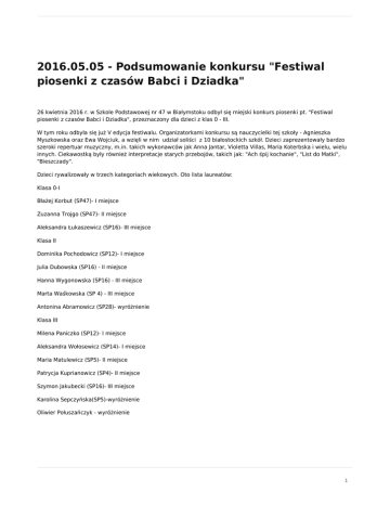 2016.05.05 - Podsumowanie konkursu "Festiwal piosenki z czasów Babci i Dziadka" 26 kwietnia 2016 r. w Szkole Podstawowej nr 47 w Białymstoku odbył się miejski konkurs piosenki pt. "Festiwal piosenki z czasów Babci i Dziadka", przeznaczony dla dzieci z klas 0 - III. W tym roku odbyła się już V edycja festiwalu. Organizatorkami konkursu są nauczycielki tej szkoły - Agnieszka Myszkowska oraz Ewa Wojciuk, a wzięli w nim udział soliści z 10 białostockich szkół. Dzieci zaprezentowały bardzo szeroki repertuar muzyczny, m.in. takich wykonawców jak Anna Jantar, Violetta Villas, Maria Koterbska i wielu, wielu innych. Ciekawostką były również interpretacje starych przebojów, takich jak: "Ach śpij kochanie", "List do Matki", "Bieszczady". Dzieci rywalizowały w trzech kategoriach wiekowych. Oto lista laureatów: Klasa 0-I Błażej Korbut (SP47)- I miejsce Zuzanna Trojgo (SP47)- II miejsce Aleksandra Łukaszewicz (SP16)- III miejsce Klasa II Dominika Pochodowicz (SP12)- I miejsce Julia Dubowska (SP16) - II miejsce Hanna Wygonowska (SP16) - III miejsce Marta Waśkowska (SP 4) - III miejsce Antonina Abramowicz (SP28)- wyróżnienie Klasa III Milena Paniczko (SP12)- I miejsce Aleksandra Wołosewicz (SP14)- I miejsce Maria Matulewicz (SP5)- II miejsce Patrycja Kuprianowicz (SP4)- II miejsce Szymon Jakubecki (SP16)- III miejsce Karolina Sepczyńska(SP5)-wyróżnienie Oliwier Połuszańczyk - wyróżnienie 1