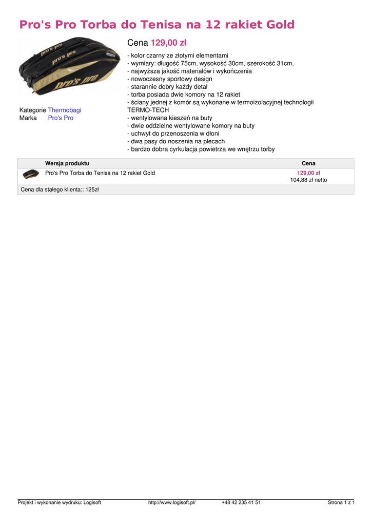 Pro's Pro Torba do Tenisa na 12 rakiet Gold Cena 129,00 zł Kategorie Thermobagi Marka Pro's Pro - kolor czarny ze złotymi elementami - wymiary: długość 75cm, wysokość 30cm, szerokość 31cm, - najwyższa jakość materiałów i wykończenia - nowoczesny sportowy design - starannie dobry każdy detal - torba posiada dwie komory na 12 rakiet - ściany jednej z komór są wykonane w termoizolacyjnej technologii TERMO-TECH - wentylowana kieszeń na buty - dwie oddzielne wentylowane komory na buty - uchwyt do przenoszenia w dłoni - dwa pasy do noszenia na plecach - bardzo dobra cyrkulacja powietrza we wnętrzu torby Wersja produktu Cena Pro's Pro Torba do Tenisa na 12 rakiet Gold 129,00 zł 104,88 zł netto Cena dla stałego klienta:: 125zł Projekt i wykonanie wydruku: Logisoft Powered by TCPDF (www.tcpdf.org) http://www.logisoft.pl/ +48 42 235 41 51 Strona 1 z 1