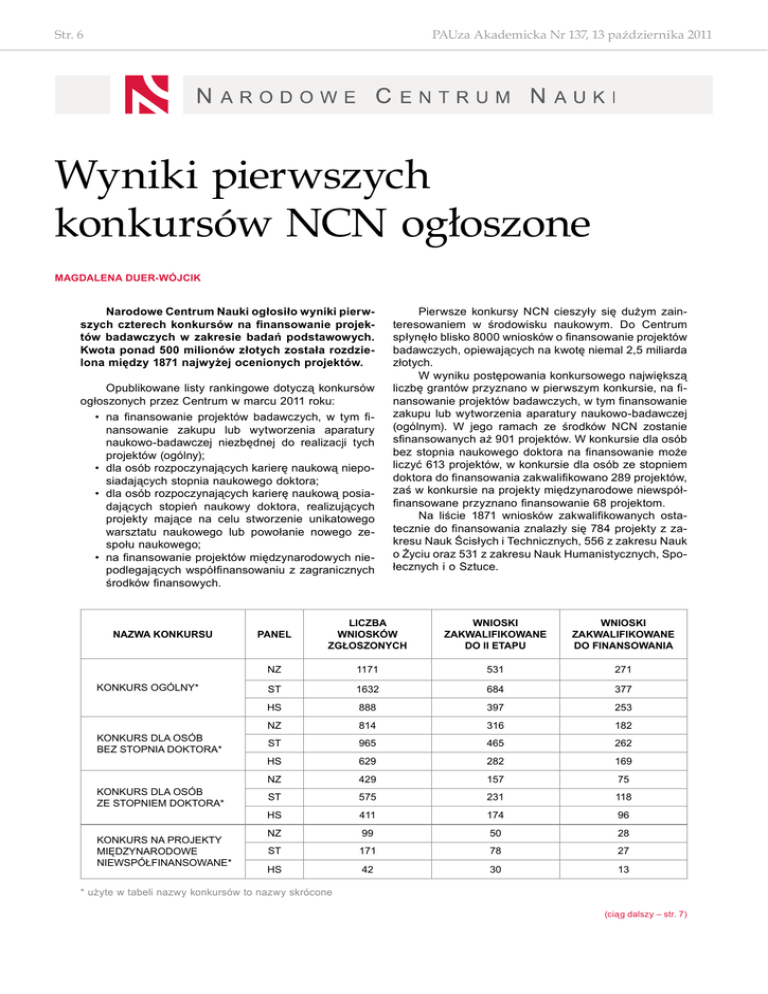 Str. 6 PAUza Akademicka Nr 137, 13 października 2011 Wyniki pierwszych konkursów NCN ogłoszone Magdalena Duer-Wójcik Narodowe Centrum Nauki ogłosiło wyniki pierwszych czterech konkursów na finansowanie projektów badawczych w zakresie badań podstawowych. Kwota ponad 500 milionów złotych została rozdzielona między 1871 najwyżej ocenionych projektów. Opublikowane listy rankingowe dotyczą konkursów ogłoszonych przez Centrum w marcu 2011 roku: • na finansowanie projektów badawczych, w tym finansowanie zakupu lub wytworzenia aparatury naukowo-badawczej niezbędnej do realizacji tych projektów (ogólny); • dla osób rozpoczynających karierę naukową nieposiadających stopnia naukowego doktora; • dla osób rozpoczynających karierę naukową posiadających stopień naukowy doktora, realizujących projekty mające na celu stworzenie unikatowego warsztatu naukowego lub powołanie nowego zespołu naukowego; • na finansowanie projektów międzynarodowych niepodlegających współfinansowaniu z zagranicznych środków finansowych. NAZWA KONKURSU KONKURS OGÓLNY* KONKURS DLA OSÓB BEZ STOPNIA DOKTORA* KONKURS DLA OSÓB ZE STOPNIEM DOKTORA* KONKURS NA PROJEKTY MIĘDZYNARODOWE NIEWSPÓŁFINANSOWANE* Pierwsze konkursy NCN cieszyły się dużym zainteresowaniem w środowisku naukowym. Do Centrum spłynęło blisko 8000 wniosków o finansowanie projektów badawczych, opiewających na kwotę niemal 2,5 miliarda złotych. W wyniku postępowania konkursowego największą liczbę grantów przyznano w pierwszym konkursie, na finansowanie projektów badawczych, w tym finansowanie zakupu lub wytworzenia aparatury naukowo-badawczej (ogólnym). W jego ramach ze środków NCN zostanie sfinansowanych aż 901 projektów. W konkursie dla osób bez stopnia naukowego doktora na finansowanie może liczyć 613 projektów, w konkursie dla osób ze stopniem doktora do finansowania zakwalifikowano 289 projektów, zaś w konkursie na projekty międzynarodowe niewspółfinansowane przyznano finansowanie 68 projektom. Na liście 1871 wniosków zakwalifikowanych ostatecznie do finansowania znalazły się 784 projekty z zakresu Nauk Ścisłych i Technicznych, 556 z zakresu Nauk o Życiu oraz 531 z zakresu Nauk Humanistycznych, Społecznych i o Sztuce. PANEL LICZBA WNIOSKÓW ZGŁOSZONYCH WNIOSKI ZAKWALIFIKOWANE DO II ETAPU WNIOSKI ZAKWALIFIKOWANE DO FINANSOWANIA NZ 1171 531 271 ST 1632 684 377 HS 888 397 253 NZ 814 316 182 ST 965 465 262 HS 629 282 169 NZ 429 157 75 ST 575 231 118 HS 411 174 96 NZ 99 50 28 ST 171 78 27 HS 42 30 13 * użyte w tabeli nazwy konkursów to nazwy skrócone (ciąg dalszy – str. 7) PAUza Akademicka Nr 137, 13 października 2011 Str. 7 Wyniki... (ciąg dalszy ze str. 6) Tyle statystyk. A w jaki sposób wybrano najlepszych? Reforma nauki wprowadziła istotne zmiany w procesie naboru oraz oceny wniosków o finansowanie projektów badawczych, w stosunku do modelu funkcjonującego wcześniej w Ministerstwie Nauki i Szkolnictwa Wyższego. Jej założeniem wyjściowym było przekazanie decyzji o finansowaniu konkretnych projektów badawczych w ręce naukowców. To oni czuwają od początku do końca nad przebiegiem konkursów Narodowego Centrum Nauki, aby wspierać jak najlepsze pomysły i tym samym podnieść konkurencyjność polskiej nauki na arenie międzynarodowej. Prześledźmy zatem drogę przykładowego wniosku złożonego do NCN w ramach konkursów, których wyniki właśnie ogłoszono. Pierwszą osobą, z którą wniosek zetknął się w Centrum był Koordynator Dyscyplin. To pracownik NCN, który posiada co najmniej stopień naukowy doktora. Obecnie jest ich w NCN ośmioro. Koordynator czuwa nad przebiegiem konkursu w całej jego rozciągłości, współpracuje z Radą NCN, która m.in. określa warunki przeprowadzania konkursów oraz z ekspertami oceniającymi wnioski. Od wniosku do decyzji Na początku nasz przykładowy wniosek został poddany ocenie formalnej. W ramach oceny formalnej Koordynator Dyscyplin sprawdził, czy wniosek był kompletny, czy dotarł do NCN w wymaganym terminie, czy wnioskodawca oraz projekt spełniają kryteria szczegółowe konkursu (np. jeśli wniosek złożono w konkursie dla osób ze stopniem doktora, czy kierownik projektu uzyskał stopień naukowy doktora w ciągu ostatnich 5 lat) oraz najważniejsze: czy projekt dotyczy badań podstawowych. Przypuśćmy, że nasz przykładowy wniosek wzbudził wątpliwości co do tego ostatniego kryterium. Co się z nim stało? Został skierowany do konsultacji z Przewodniczącym Zespołu Ekspertów dla panelu, w ramach którego został złożony. Ewentualne dalsze wątpliwości każdorazowo rozstrzygał Zespół Ekspertów. Teraz załóżmy, że decyzja Przewodniczącego była pozytywna. Ponieważ nasz wniosek przeszedł ocenę formalną, przechodzimy do kolejnego kroku. Wniosek został przekazany przez Koordynatora Dyscyplin do Przewodniczącego Zespołu Ekspertów (ZE) w celu rozpoczęcia oceny merytorycznej. Zespoły Ekspertów to również nowe rozwiązanie w procesie oceny wniosków, wprowadzone w ramach reformy nauki. ZE składają się z wybitnych naukowców, specjalistów w swoich dziedzinach, którzy są wybierani przez Radę NCN i powoływani przez Dyrektora. Ocena merytoryczna naszego przykładowego wnios ku odbyła się w dwóch etapach. W pierwszym z nich, jego recenzji dokonali dwaj członkowie Zespołu Ekspertów oceniającego wnioski w ramach panelu, który wybrał nasz wnioskodawca. Wniosek nie został przydzielony do ekspertów losowo. Koordynator Dyscyplin oraz Przewodniczący ZE sprawdzili najpierw, czy nie istnieje ryzyko wystąpienia konfliktu interesów podczas oceny wniosku. Nie mógłby on być recenzowany np. przez eksperta zatrudnionego w tej samej jednostce co wnioskodawca. Po zakończeniu oceny merytorycznej przez wyznaczonych ekspertów, wniosek został skierowany na pierwsze posiedzenie panelowe Zespołu Ekspertów. Tam na podstawie recenzji i dodatkowej dyskusji uzgodnio