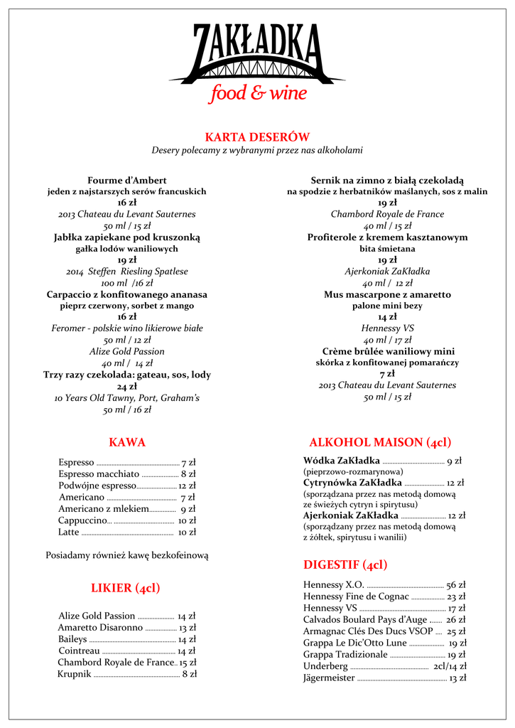 KARTA DESERÓW Desery polecamy z wybranymi przez nas alkoholami Fourme d’Ambert Sernik na zimno z białą czekoladą jeden z najstarszych serów francuskich na spodzie z herbatników maślanych, sos z malin 16 zł 2013 Chateau du Levant Sauternes 50 ml / 15 zł Jabłka zapiekane pod kruszonką 19 zł Chambord Royale de France 40 ml / 15 zł Profiterole z kremem kasztanowym gałka lodów waniliowych bita śmietana 19 zł 2014 Steffen Riesling Spatlese 100 ml /16 zł Carpaccio z konfitowanego ananasa 19 zł Ajerkoniak ZaKładka 40 ml / 12 zł Mus mascarpone z amaretto pieprz czerwony, sorbet z mango palone mini bezy 16 zł Feromer - polskie wino likierowe białe 50 ml / 12 zł Alize Gold Passion 40 ml / 14 zł Trzy razy czekolada: gateau, sos, lody 24 zł 10 Years Old Tawny, Port, Graham’s 50 ml / 16 zł 14 zł Hennessy VS 40 ml / 17 zł Crème brûlée waniliowy mini skórka z konfitowanej pomarańczy 7 zł 2013 Chateau du Levant Sauternes 50 ml / 15 zł KAWA ALKOHOL MAISON (4cl) Espresso ……………….…………………………. 7 zł Espresso macchiato .…………..….… 8 zł Podwójne espresso…..………....…… 12 zł Americano …………………….……..……… 7 zł Americano z mlekiem……...……. 9 zł Cappuccino… ………………..……...….… 10 zł Latte ………………..……………………….....… 10 zł Wódka ZaKładka ………………….…..…....… 9 zł Posiadamy również kawę bezkofeinową LIKIER (4cl) Alize Gold Passion …………………. 14 zł Amaretto Disaronno ……….……… 13 zł Baileys ……………………………..…………..… 14 zł Cointreau …………………………………..… 14 zł Chambord Royale de France.. 15 zł Krupnik ………………………………………….… 8 zł (pieprzowo-rozmarynowa) Cytrynówka ZaKładka .………….………. 12 zł (sporządzana przez nas metodą domową ze świeżych cytryn i spirytusu) Ajerkoniak ZaKładka …………….….….… 12 zł (sporządzany przez nas metodą domową z żółtek, spirytusu i wanilii) DIGESTIF (4cl) Hennessy X.O. …………………….…………......… 56 zł Hennessy Fine de Cognac ……………..… 23 zł Hennessy VS ………………………………….……...… 17 zł Calvados Boulard Pays d’Auge .…... 26 zł Armagnac Clés Des Ducs VSOP …. 25 zł Grappa Le Dic’Otto Lune …….…….….… 19 zł Grappa Tradizionale ……..……..………..…… 19 zł Underberg ……………………....………………. 2cl/14 zł Jägermeister ……………………….…………………….. 13 zł DESSERTS MENU We recommend our desserts with alcohols selected by us Fourme d’Ambert Cheesecake with white chocolate one of the oldest French cheeses on the crumbly butter bisquits bottom, raspberry sauce 16 zł 2013 Chateau du Levant Sauternes 50 ml / 15 zł Apple crumble 19 zł Chambord Royale de France 40 ml / 15 zł Profiterols with chestnut cream, vanilla ice cream whipped cream 19 zł 2014 Steffen Riesling Spatlese 100 ml /16 zł Pineapple carpaccio 19 zł Ajerkoniak ZaKładka 40 ml / 12 zł Mascarpone mousse with amaretto red pepper, mango sorbet burned mini meringues 16 zł Feromer - polish white liqueur wine 50 ml / 12 zł Alize Gold Passion 40 ml / 14 zł Triple: gateau, sauce, ice-cream 24 zł 10 Years Old Tawny, Port, Graham’s 50 ml / 16 zł 14 zł Hennessy VS 40 ml / 17 zł Vanilla Crème brûlée mini COFFEE Espresso ……………….…………………………. 7 zł Espresso macchiato .…………..….… 8 zł DBL espresso…..………………..…....…… 12 zł Americano ……….…………….……..……… 7 zł Americano with milk…..…...……. 9 zł Cappuccino… ………………..……...….… 10 zł Latte ………………..……………………….....… 10 zł Decaf coffee avaliable. LIKIER (4cl) Alize Gold Passion …………………. 14 zł Amaretto Disaronno ……….……… 13 zł Baileys ……………………………..…………..… 14 zł Cointreau …………………………………..… 14 zł Chambord Royale de France.. 15 zł Krupnik ………………………………………….… 8 zł orange peel confit in sugar 7 zł 2013 Chateau du Levant Sauternes 50 ml / 15 zł ALKOHOL MAISON (4cl) Wódka ZaKładka ………………..….…..…....… 9 zł (pepper&rosemary homemade vodka) Cytrynówka ZaKładka .…………..………. 12 zł (lemon homemade vodka) Ajerkoniak ZaKładka …………..…..….… 12 zł (prepared by us from egg yolk, vanilla and alcohol) DIGESTIF (4cl) Hennessy X.O. …………………….…………......… 56 zł Hennessy Fine de Cognac ……………..… 23 zł Hennessy VS ………………………………….……...… 17 zł Calvados Boulard Pays d’Auge .…... 26 zł Armagnac Clés Des Ducs VSOP …. 25 zł Grappa Le Dic’Otto Lune …….…….….… 19 zł Grappa Tradizionale ……..……..………..…… 19 zł Underberg ……………………....………………. 2cl/14 zł Jägermeister ……………………….…………………….. 13 zł
