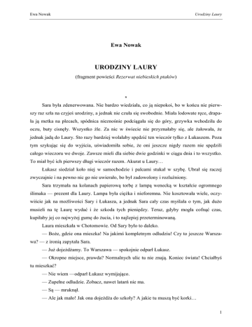 Ewa Nowak Urodziny Laury Ewa Nowak URODZINY LAURY (fragment powieści Rezerwat niebieskich ptaków) * Sara była zdenerwowana. Nie bardzo wiedziała, co ją niepokoi, bo w końcu nie pierwszy raz szła na czyjeś urodziny, a jednak nie czuła się swobodnie. Miała lodowate ręce, drapała ją metka na plecach, spódnica nieznośnie podciągała się do góry, grzywka wchodziła do oczu, buty cisnęły. Wszystko źle. Za nic w świecie nie przyznałaby się, ale żałowała, że jednak jadą do Laury. Sto razy bardziej wolałaby spędzić ten wieczór tylko z Łukaszem. Poza tym szykując się do wyjścia, uświadomiła sobie, że oni jeszcze nigdy razem nie spędzili całego wieczoru we dwoje. Zawsze mieli dla siebie dwie godzinki w ciągu dnia i to wszystko. To miał być ich pierwszy długi wieczór razem. Akurat u Laury… Łukasz siedział koło niej w samochodzie i palcami stukał w szybę. Ubrał się raczej zwyczajnie i na pewno nic go nie uwierało, bo był zadowolony i rozluźniony. Sara trzymała na kolanach papierową torbę z lampą wenecką w kształcie ogromnego ślimaka — prezent dla Laury. Lampa była ciężka i nieforemna. Nie kosztowała wiele, oczywiście jak na możliwości Sary i Łukasza, a jednak Sara cały czas myślała o tym, jak dużo musieli na tę Laurę wydać i że szkoda tych pieniędzy. Teraz, gdyby mogła cofnąć czas, kupiłaby jej co najwyżej gumę do żucia, i to najlepiej przeterminowaną. Laura mieszkała w Chotomowie. Od Sary było to daleko. — Boże, gdzie ona mieszka! Na jakimś kompletnym odludziu! Czy to jeszcze Warszawa? — z ironią zapytała Sara. — Już dojeżdżamy. To Warszawa — spokojnie odparł Łukasz. — Okropne miejsce, prawda? Normalnych ulic tu nie znają. Koniec świata! Chciałbyś tu mieszkać? — Nie wiem —odparł Łukasz wymijająco. — Zupełne odludzie. Zobacz, nawet latarń nie ma. — Są — mruknął. — Ale jak mało! Jak ona dojeżdża do szkoły? A jakie tu muszą być korki… 1 Ewa Nowak Urodziny Laury — Nie większe niż u ciebie czy u mnie… — Dlaczego jesteś niemiły? — Czemu niemiły? Ja na przykład chciałbym się wybudować nie tak jak my czy wy, na kupionej od kogoś działce, tylko… Wiesz, rodzina Laury ma tu ziemię od pokoleń. To nie jacyś nuworysze… Moi rodzice wszystko kupili. Wciąż powtarzają, że doszli do wszystkiego własną pracą. A ja bym właśnie chciał, żeby u mnie w przedpokoju wisiały obrazy sprzed dwustu lat i żeby byli na nich moi przodkowie. Wiesz, że Laura pochodzi z hrabiowskiej rodziny? — zakończył patetycznie. Rodzice Sary byli na pewno bardzo bogaci, może nawet bogatsi niż Laury, ale jej dziadek pracował w fabryce, a rodzice wszystko kupili, a raczej przez czysty przypadek weszli w posiadanie majątku po kimś obcym. Jeśli dla Łukasza takie rzeczy mają znaczenie, to Sara przy Laurze wypada blado. I najgorsze, że nic nie można zrobić. Tego Sara nie naprawi. Nie uda się nagle być hrabianką. „Hrabianka! Na pewno mu nagadała bzdur i tyle. A ten jej we wszystko uwierzył. Jaka z niej hrabianka? Jak ona się zachowuje? Nie mam zamiaru się z nią porównywać. Taka dobrze urodzona, ale to moi rodzice najbardziej sponsorują szkołę. Ciekawe, że o tym Łukasz nie pomyśli”. Kilka chwil jechali w milczeniu. — Rodzice kupili tu działkę. Bardzo blisko. Chcą, żeby za kilka pokoleń o nas też tak można było powiedzieć. Osiem tysięcy metrów, strumyk, dwa pagórki. Budujemy się. — Tu?! Lasy, pustkowia, droga ledwo wyrąbana między drzewami. W jej odczuciu to był prawdziwy koniec świata. — Zobaczysz, jak ona mieszka. To się czuje, że dom stoi ponad dwieście lat. Mają spory sad i piękny widok na lasy, które należą do nich. A portrety… Zresztą sama zobaczysz. Sara zacisnęła usta. „Wracaj sobie do niej, jak ci tak zależy na portretach i spuściźnie rodowej” — pomyślała i przesunęła się do okna. — O co ci chodzi? — O nic! „Muszę przestać się tak wszystkim denerwować. To nie ma sensu”. Po chwili znów się przesunęła i przytuliła się do Łukasza. — Przepraszam. Nie wiedziałam, że kupiliście tu działkę. 2 Ewa Nowak Urodziny Laury — Nie ma sprawy. — Łukasz cmoknął Sarę w policzek. — Wiem, że nie wiedziałaś. Ja chyba chciałbym w przyszłości właśnie gdzieś na obrzeżach mieć dom. Dlatego namawiałem ojca, żeby już teraz kupili ziemię. Rodzice Laury pomogli wybrać… To takie moje marzenie. Skoro jednak tobie się nie podoba… — Nic podobnego — powiedziała Sara o wiele głośniej, niż było trzeba. — Zawsze chciałam mieszkać w takiej okolicy. Kocham odludzia. Bardzo mi się tu podoba. * Posesja była bardzo duża, o czym można się było od razu przekonać, bo gdy podjechali pod bramę, dom ledwie majaczył daleko za drzewami. Wartownik wpuścił ich, wytłumaczył kierowcy, gdzie ma zaparkować i dokąd potem może się udać, by poczekać, aż zabawa się skończy. Laura otworzyła im osobiście. „A ta co? Hrabianka jedna! — Sara obrzuciła jubilatkę krytycznym spojrzeniem. — Nawet się nie przebrała do kolacji? Co za skandal! Oburzające! Niech uważa, bo ją wydziedziczą”. Sara poczuła się głupio, że tak się wystroiła, ale zaraz zobaczyła Mateusza, który był w białej koszuli z muszką, i Koronkę w wieczorowej sukni w szlachetnym kolorze czerwonego wina. Koło nich stała Iza w dżinsach i T-shirtcie z dużym nieregularnym dekoltem. „Aha, czyli wszystko dozwolone. Każdy ubrał się, jak lubi. Bardzo dobrze”. Oboje złożyli Laurze najserdeczniejsze życzenia, a potem Sara rozejrzała się po domu. Od razu spostrzegła, że na jednym z obrazów sportretowano kobietę niewiarygodnie podobną do Laury. Kropka w kropkę. „Matko, ona nie kłamie z tym hrabiostwem. Czyli stąd ta jej końska twarz…”. — To co? Z ubraniami sobie poradzicie, bo słyszę, że znów ktoś przyjechał. Łukasz, czujcie się jak zawsze
