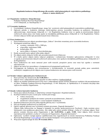 Regulamin konkursu fotograficznego dla uczniów szkół gimnazjalnych województwa podlaskiego „Sukces w moim obiektywie” § 1 Organizator konkursu fotograficznego Podlaska Fundacja Rozwoju Regionalnego 15-073 Białystok, ul. Starobojarska 15 § 2 Uczestnicy konkursu 1. Uczestnikami konkursu fotograficznego mogą być uczniowie szkół gimnazjalnych województwa podlaskiego. 2. Zgłoszeń udziału w konkursie dokonuje rodzic/opiekun prawny uczestnika konkursu na podstawie formularza zgłoszeniowego, stanowiącego Załącznik nr 1 do Regulaminu konkursu wraz ze zgodą na przetwarzanie danych osobowych autora pracy oraz kopią zgody na nieodpłatną publikację pracy (Załącznik nr 2 do Regulaminu). Należy również załączyć krótki opis prezentowanych treści (Sukcesu). § 3 Prace konkursowe 1. Pracą konkursową jest zdjęcie przedstawiające „Sukces” dowolnie rozumiany przez uczestnika konkursu. 2. Wymagania techniczne zdjęcia: wymiary: minimum 1920 x 1080 pix, waga pliku: maksimum 5MB, format pliku: JPG, nazwa pliku w formacie: NazwiskoImię.jpg., 3. Każdy uczestnik może zgłosić tylko jedno zdjęcie. 4. Do zdjęcia należy dołączyć krótki opis prezentowanych treści (Sukcesu). 5. W e-mailu oprócz zdjęcia należy załączyć podpisany i zeskanowany formularz zgłoszeniowy (Załącznik 1) wraz ze zgodą na przetwarzanie danych osobowych autora pracy oraz zgodą na nieodpłatną publikację pracy (Załącznik nr 2 do Regulaminu). 6. Praca konkursowa nie może naruszać praw osób trzecich, przepisów prawa oraz musi być zgodna z normami obyczajowymi. 7. Zdjęcie nie może być przerobione w komputerowych programach graficznych. 8. Przystąpienie do konkursu jest równoznaczne z oświadczeniem, że uczestnik posiada pełnię praw autorskich, osobistych i majątkowych do zdjęcia oraz że praca konkursowa nie narusza praw osób trzecich. § 4 Termin i miejsce zgłaszania prac konkursowych 1. Prace powinny być dostarczone do 31.08.2016 r. 2. Zdjęcie wraz z załącznikami należy przesłać na adres mailowy: [email protected]. 3. Zdjęcie na nośniku elektronicznym (CD) wraz z załącznikami można również dostarczyć osobiście lub pocztą/kurierem na adres: Podlaska Fundacja Rozwoju Regionalnego, 15-441 Białystok, ul. Spółdzielcza 8. O terminie decyduje data wpływu do siedziby Organizatora. § 5 Zasady wyboru laureatów konkursu 1. Oceny prac dokona Komisja, w skład której wchodzi Organizator i Kapituła konkursu. 2. Komisja konkursowa przy ocenie prac weźmie pod uwagę: walory artystyczne, oryginalność podejścia do tematu i pomysłu na przedstawienie „Sukcesu”, możliwość wykorzystania w czasie kampanii medialnych. 3. Kapituła konkursowa przyzna jedną nagrodę główną oraz 3 wyróżnienia. 4. Decyzje Kapituły konkursowej są ostateczne. 5. Oprócz nagrody głównej oraz wyróżnień zostanie przyznana „Nagroda Internautów”. Zdjęcia będą umieszczane na fanpage’u kampanii na portalu społecznościowym Facebook i będą oceniane przez Internautów oraz poddawane głosowaniu. Aby oddać głos należy polubić (kliknąć „Lubię to”) wybrane zdjęcie. Ilość głosów zostanie zliczona przez Organizatora w dn. 16.09.2016r. o godz. 12:00. Autor zdjęcia, które otrzyma największą ilość polubień („Lubię to”) otrzyma od Organizatora „Nagrodę Internautów”. 6. Ogłoszenie wyników nastąpi poprzez opublikowanie listy nagrodzonych na stronie internetowej Podlaskiej Fundacji Rozwoju Regionalnego (www.pfrr.pl) oraz na stronie Kampanii: www.postawmynamlodych.pl. 7. Wręczenie nagród nastąpi do dnia 30 września 2016 r. 1 § 6 Nagrody 1. I nagroda - kamera Sony Action Cam HDR-AS200VR (lub równoważna). 2. 3 wyróżnienia - słuchawki bezprzewodowe SONY (lub równoważne). 3. Nagroda Internautów – kamera Sony Action Cam HDR-AS200VR (lub równoważna). 4. Każda placówka/szkoła laureatów konkursu otrzyma od Organizatorów dyplom – podziękowanie za udział w konkursie i za promocję popularyzacji wiedzy ekonomicznej oraz realizację idei wychowania przez sztukę. 5. Nagrody rzeczowe nie podlegają wymianie na inne lub na równowartość w gotówce. 6. W momencie otrzymania nagrody opiekun prawny uczestnika konkursu jest zobowiązany podpisać protokół jej odebrania. § 7 Podatki 1. Jeżeli przepisy prawa przewidują powstanie obowiązku podatkowego zależnie od wartości Nagrody, do Nagrody zostanie dodana nagroda pieniężna w kwocie stanowiącej 11,11% wartości danej Nagrody. W takim przypadku, część nagrody, stanowiąca dodaną kwotę pieniężną, nie zostanie wypłacona zwycięzcy, lecz pobrana przez Organizatora, przed wydaniem zwycięzcy Nagrody, jako 10% zryczałtowany podatek dochodowy, od łącznej wartości Nagrody, o którym mowa w art. 30 ust. 1 pkt 2 ustawy z dnia 26 lipca 1991 r. o podatku dochodowym od osób fizycznych (tekst jedn. Dz. U. z 2012 r., poz. 361 z późn. zm.). 2. Za pobranie i odprowadzenie należnego podatku odpowiedzialny jest wyłącznie Organizator. § 8 Postanowienia końcowe 1. Nadesłane na konkurs prace stają się własnością Organizatora. 2. Nie przewiduje się zwrotów prac. 3. Organizatorzy zastrzegają sobie prawo do różnych form publikacji nadesłanych prac. 4. Uczestnik konkursu udziela Organizatorowi bezterminowej nieodpłatnej zgody na korzystanie z prac konkursowych, z podaniem imienia i nazwiska autora, jego wieku oraz klasy szkolnej oraz miejscowości zamieszkania, w celach promocyjno – marketingowych, stosownie do potrzeb Organizatora. 5. Organizator zastrzega sobie prawo do wykluczenia z konkursu prac sprzecznych z przepisami prawa, zasadami etyki lub z innych względów sprawiających, że nie nadają się one do publicznej prezentacji. 6. Osoby, które nie spełniają któregoś z wymogów określonych w niniejszym Regulaminie lub podadzą nieprawdziwe informacje, zostaną automatycznie zdyskwalifikowane. 7. Dane osobowe uczestników konkursu będą ch