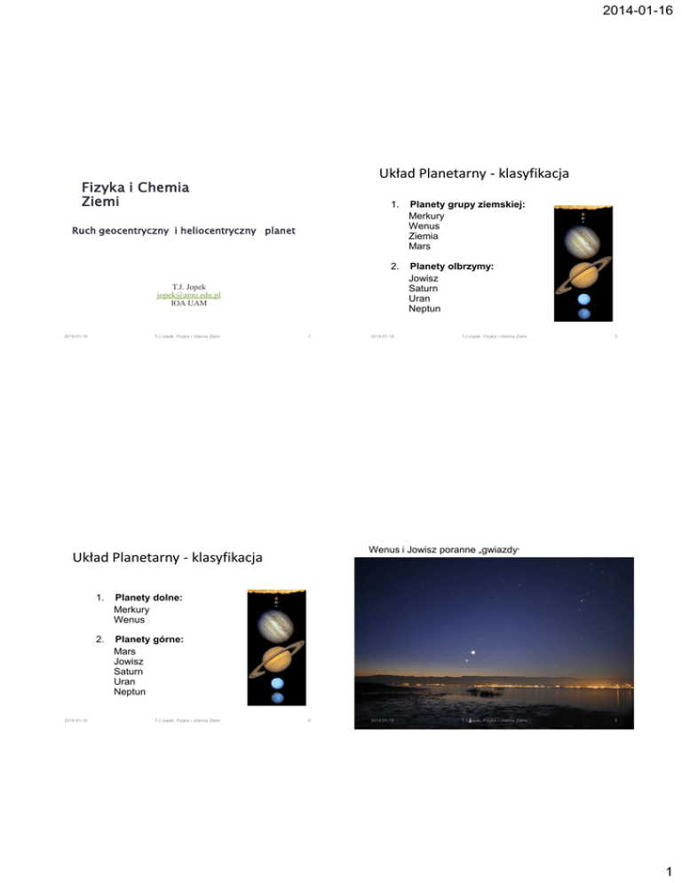 2014-01-16 Układ Planetarny - klasyfikacja Fizyka i Chemia Ziemi 1. Planety grupy ziemskiej: Merkury Wenus Ziemia Mars 2. Planety olbrzymy: Jowisz Saturn Uran Neptun Ruch geocentryczny i heliocentryczny planet T.J. Jopek [email protected] IOA UAM 2014-01-16 T.J.Jopek, Fizyka i chemia Ziemi 1 2014-01-16 Planety dolne: Merkury Wenus 2. Planety górne: Mars Jowisz Saturn Uran Neptun T.J.Jopek, Fizyka i chemia Ziemi T.J.Jopek, Fizyka i chemia Ziemi 3 Wenus i Jowisz poranne „gwiazdy” Układ Planetarny - klasyfikacja 1. 2014-01-16 4 2014-01-16 T.J.Jopek, Fizyka i chemia Ziemi 5 1 2014-01-16 Astronomia w starożytnej Grecji Ruch Marsa obserwowany z powierzchni Ziemi W VI w. PC w starożytnej Grecji konstruowano modele kosmologiczne w oparciu o osiągnięcia fizyki i astronomii. Powstały spekulatywne teorie próbujące wyjaśnić fizyczną naturę świata i ciał niebieskich. Ich autorzy koncentrowali się na wskazaniu arche, materialnej przyczyny leżącej u podstaw obserwowanej rzeczywistości. Byli to m.in.: Tales z Miletu (ok. 625–ok. 547 PC.), Anaksymander (ok. 610–ok. 545 PC), Pitagoras (ok. 572–ok. 497 PC), Platon (ok. 427–374 PC). Arystoteles (384–322 PC) Pitagorasowi, przypuszczalnie, zawdzięczamy termin “kosmos”, oznaczający racjonalny porządek we wszechświecie. Platonowi przypisuje się sformułowanie programu, który utrwalił sferyczny model kosmosu. Miał on bowiem zażądać, by obserwowane zachowanie planet było opisywane tylko za pomocą ruchów kołowych i jednostajnych. 2014-01-16 T.J.Jopek, Fizyka i chemia Ziemi 6 7 Astronomia w starożytnej Grecji Pierwsze spójne rozwiązanie problemu ruchu ciał niebieskich podał Eudoksos. Ziemia znajdowała się w środku współśrodkowych sfer. Każda planeta była unoszona przez jedną lub kilka sfer, wirujących ze stałą prędkością wokół Ziemi. Sfery obracały się wokół osi mających różne bieguny i były ze sobą połączone, tak że ruch sfery zewnętrznej przenosił się na sferę wewnętrzną . Arystoteles Model Eudoksosa przyjął Arystoteles rozbudowując go z 26 do 55 sfer. Swoje pomysły uzasadniał fizyką pięciu pierwiastków. W świecie podksiężycowym wszystko było zbudowane z ziemi, wody, powietrza i ognia, podlegając nieustannym procesom powstawania i ginięcia. Natomiast obszar położony poza sferą Księżyca i ciągnący się przez sfery pozostałych planet aż po sferę gwiazd tworzył piąty element, eter, którego własnością był wieczny ruch kołowy i jednostajny. (384–322 PC) Sferyczny kosmos z fizyką Arystotelesa stał się kosmologicznym paradygmetem, który został zastąpiony dopiero przez model Układu Planetarnego Kopernika. Według Arystotelesa sferyczny kosmos zamknięty wirującą powłoką gwiazd był całym wszechświatem istniejącym wiecznie. Eudoksos z Knidos (400-347 PC) Opisu ruchu Księżyca wymagał 3 sfer . 8 Zwolennicy Platona przyjmowali, że kosmos został stworzony. Stoicy uznawali obecność przestrzeni, w której kosmos pozostawał zawieszony. 9 2 2014-01-16 Kosmos sferyczny Arystotelesa 5 pierwiastków: Model Eudoksosa przyjął Arystoteles rozbudowując go z 26 do 55 sfer. Swoje pomysły uzasadniał fizyką pięciu pierwiastków. W świecie podksiężycowym wszystko było zbudowane z ziemi, wody, powietrza i ognia, podlegając nieustannym procesom powstawania i ginięcia. Natomiast obszar położony poza sferą Księżyca i ciągnący się przez sfery pozostałych planet aż po sferę gwiazd tworzył piąty element, eter, którego własnością był wieczny ruch kołowy i jednostajny. -Ziemia Arystoteles -Woda Sferyczny kosmos z fizyką Arystotelesa stał się kosmologicznym paradygmetem, który został zastąpiony dopiero przez model Układu Planetarnego Kopernika. (384–322 PC) -Powietrze -Ogień Według Arystotelesa sferyczny kosmos zamknięty wirującą powłoką gwiazd był całym wszechświatem istniejącym wiecznie. -Eter Zwolennicy Platona przyjmowali, że kosmos został stworzony. Stoicy uznawali obecność przestrzeni, w której kosmos pozostawał zawieszony. 10 11 Greckie modele Wszechświata Ruch roczny Słońca i planet – zmienna szybkość kątowa Apollonios wprowadził dwa geometryczne modele planetarnych orbit z nieruchomą Ziemią. Wiosna 92.75 dni Lato 93.65 dni Jesień 89.85 dni Zima 88.99 dni Apollonios z Perge W pierwszym, planeta znajduje się na końcu promienia, obracającego się ze stała szybkością. Ale całe koło: środek C, promień i planeta obiegają w ciągu roku nieruchomą Ziemią, nie leżącą w centrum ruchu. ( ~262– ~190 PC) W drugim modelu Ziemia leży w środku dużego koła (deferentu), po deferencie porusza się jednostajnie, małe koło (epicykl), po którym jednostajnie porusza się planeta. <V>=29.78 km/s 12 13 3 2014-01-16 Greckie modele Wszechświata Greckie modele Wszechświata Do rozwiązań Apolloniosa Ptolemeusz wprowadził ulepszenie: - Klaudiusz Ptolemeusz - (~100 - ~168 AD) W swoim dziele „Almagest” podał pełny model geometryczny i związane z nim tabele, pozwalające przewidywać położenia Słońca, Księżyca i planet na dowolny moment czasu. środek epicyklu poruszał się po deferencie ze zmienną prędkością, ale, prędkość ta pozostawała niezmienna względem punktu Q - ekwantu. Dzieło Ptolemeusza stanowi szczyt dokonań astronomii starożytnej. Almagest z IX w. przechowywany w Bibliotece Watykańskiej 14 15 Ruch planet i Słońca wg Ptolemeusza Epicykle i deferenty dla Słońca S i dwóch planet P, P’. Okres obiegu 1 rok Okres obiegu 1 rok 16 Układ Planetarny wg. Ptolemeusza (Wersja uproszczona) 17 4 2014-01-16 Odrodzenie astronomii europejskiej Astronomowie arabscy Odrodzenie nauki o wszechświecie w średniowiecznej Europie Zachodniej wiązało się z przyswajaniem od XII w. arabskich przekładów autorów greckich (również Ptolemeusza) i oryginalnych dzieł uczonych islamu. W ten sposób w Europie upowszechniły się również wątpliwości co do zwi