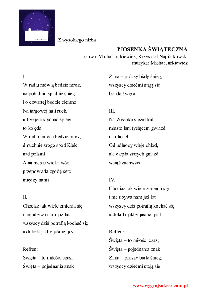 Z wysokiego nieba PIOSENKA ŚWIĄTECZNA słowa: Michał Jurkiewicz, Krzysztof Napiórkowski muzyka: Michał Jurkiewicz I. Zima – prószy biały śnieg, W radiu mówią będzie mróz, wszyscy dziećmi stają się na południu spadnie śnieg bo idą święta. i o czwartej będzie ciemno Na targowej hali ruch, III. u fryzjera słychać śpiew Na Wisłoku stężał lód, to kolęda miasto lśni tysiącem gwiazd W radiu mówią będzie mróz, na ulicach dmuchnie srogo spod Kielc Od północy wieje chłód, nad polami ale ciepło starych gniazd A na niebie wielki wóz, wciąż zachwyca przepowiada zgodę serc między nami IV. Chociaż tak wiele zmienia się II. i nie ubywa nam już lat Chociaż tak wiele zmienia się wszyscy dziś potrafią kochać się i nie ubywa nam już lat a dokoła jakby jaśniej jest wszyscy dziś potrafią kochać się a dokoła jakby jaśniej jest Refren: Święta – to miłości czas, Refren: Święta – pojednania znak Święta – to miłości czas, Zima – prószy biały śnieg, Święta – pojednania znak wszyscy dziećmi stają się www.wygrajsukces.com.pl bo idą święta. Święta – najpiękniejszy czas, Święta – radość jest wśród nas ziemia niebem staje się, Wszechmogący tutaj zszedł umiłować nas V. Tak jak co roku jadę znów tam gdzie mój rodzinny dom czwórką ślimaczę się, jak żółw ale cieszę się, bo idą Refren: Święta – to miłości czas .... www.wygrajsukces.com.pl