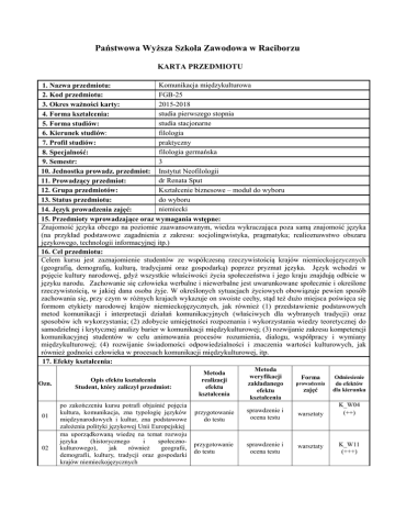 Państwowa Wyższa Szkoła Zawodowa w Raciborzu KARTA PRZEDMIOTU Komunikacja międzykulturowa 1. Nazwa przedmiotu: FGB-25 2. Kod przedmiotu: 2015-2018 3. Okres ważności karty: studia pierwszego stopnia 4. Forma kształcenia: studia stacjonarne 5. Forma studiów: 6. Kierunek studiów: filologia praktyczny 7. Profil studiów: filologia germańska 8. Specjalność: 3 9. Semestr: 10. Jednostka prowadz. przedmiot: Instytut Neofilologii dr Renata Sput 11. Prowadzący przedmiot: 12. Grupa przedmiotów: Kształcenie biznesowe – moduł do wyboru 13. Status przedmiotu: do wyboru niemiecki 14. Język prowadzenia zajęć: 15. Przedmioty wprowadzające oraz wymagania wstępne: Znajomość języka obcego na poziomie zaawansowanym, wiedza wykraczająca poza samą znajomość języka (na przykład podstawowe zagadnienia z zakresu: socjolingwistyka, pragmatyka; realioznawstwo obszaru językowego, technologii informacyjnej itp.) 16. Cel przedmiotu: Celem kursu jest zaznajomienie studentów ze współczesną rzeczywistością krajów niemieckojęzycznych (geografią, demografią, kulturą, tradycjami oraz gospodarką) poprzez pryzmat języka. Język wchodzi w pojęcie kultury narodowej, gdyż wszystkie właściwości życia społeczeństwa i jego kraju znajdują odbicie w języku narodu. Zachowanie się człowieka werbalne i niewerbalne jest uwarunkowane społecznie i określone rzeczywistością, w jakiej dana osoba żyje. W określonych sytuacjach życiowych obowiązuje pewien sposób zachowania się, przy czym w różnych krajach wykazuje on swoiste cechy, stąd też dużo miejsca poświęca się formom etykiety narodowej krajów niemieckojęzycznych, jak również (1) przedstawienie podstawowych metod komunikacji i interpretacji działań komunikacyjnych (właściwych dla wybranych tradycji) oraz sposobów ich wykorzystania; (2) zdobycie umiejętności rozpoznania i wykorzystania wiedzy teoretycznej do samodzielnej i krytycznej analizy barier w komunikacji międzykulturowej; (3) rozwijanie zakresu kompetencji komunikacyjnej studentów w celu animowania procesów rozumienia, dialogu, współpracy i wymiany międzykulturowej; (4) rozwijanie świadomości odpowiedzialności i znaczenia wartości kulturowych, jak również godności człowieka w procesach komunikacji międzykulturowej, itp. 17. Efekty kształcenia: Ozn. 01 02 Opis efektu kształcenia Student, który zaliczył przedmiot: po zakończeniu kursu potrafi objaśnić pojęcia kultura, komunikacja, zna typologię języków międzynarodowych i kultur, zna podstawowe założenia polityki językowej Unii Europejskiej ma uporządkowaną wiedzę na temat rozwoju języka (historycznego i społecznokulturowego), jak również geografii, demografii, kultury, tradycji oraz gospodarki krajów niemieckojęzycznych Metoda realizacji efektu kształcenia Metoda weryfikacji zakładanego efektu kształcenia przygotowanie do testu przygotowanie do testu Forma zajęć Odniesienie do efektów dla kierunku sprawdzenie i ocena testu warsztaty K_W04 (++) sprawdzenie i ocena testu warsztaty prowadzenia K_W11 (+++) 03 04 05 06 07 08 zna stereotypy językowe; potrafi wymienić przyczyny niepowodzeń komunikacyjnych, zna pojęcie technologii komunikacyjnej, potrafi dokonać analizy aktu komunikacyjnego bazując na wiedzy językowej i realioznawczej; wyjaśnić różnice w charakterze narodowym poszczególnych narodów, ocenić charakter stosunków polsko-niemieckich na przestrzeni wieków po zakończeniu kursu umie wskazać przyczyny niepowodzeń komunikacyjnych, potrafi zapobiegać konfliktom komunikacyjnym, świadomie panuje nad własną komunikacją z innymi ludźmi i dobiera środki językowe adekwatne do zamierzeń komunikacyjnych, dostrzega wpływ wyobrażeń stereotypowych na treść, formę i skutki komunikacji, potrafi ten wpływ pomniejszać. ma rozwinięte umiejętności w zakresie komunikacji interpersonalnej, potrafi porozumiewać się w sposób precyzyjny i spójny przy użyciu różnych kanałów i technik komunikacyjnych w języku ojczystym i obcym kurs powinien wytworzyć u studenta postawę aktywnego, świadomego i krytycznego stosunku do obserwowanych relacji komunikacyjnych, wytworzyć poczucie wagi tych relacji zarówno w wymiarze jednostkowym (personalnym), jak i międzyetnicznym; powinien być uwrażliwiony na stałą obecność stereotypów społeczno-etnicznych w relacjach komunikacyjnych i na potrzebę nieustannego ich przezwyciężania w celu uniknięcia konfliktów na tle interkulturowym udział w dyskusji ocena udziału w dyskusji udział w dyskusji podsumowanie dyskusji, ocena udziału w dyskusji warsztaty K_W14 (+) przygotowanie zadania domowego (referat bądź prezentacja multimedialna) sprawdzenie, korekta i ocena zadania domowego warsztaty K_U01 (+++) warsztaty K_U07 (+++) przygotowanie do zadania domowego udział w dyskusji sprawdzenie zadań, korekta, ocena udziału w dyskusji K_W13 (+) udział w dyskusji ocena udziału w dyskusji warsztaty K_K01 (++) udział w panelach dyskusyjnych ocena udziału w dyskusji warsztaty K_K05 (+++) 18. Formy i wymiar zajęć: W (45h) 19. Treści kształcenia: Komunikacja kulturowa i jej rodzaje. Tożsamość a komunikowanie. Typologia kultur wg E. Halla. Mobilność – interakcyjność – transgresyjność (synergetyczny vs. konfliktowy charakter przestrzeni międzykulturowych). Rozwojowe dylematy procesów globalizacji i zmian kulturowych. Wielokulturowość – transkulturowość – międzykulturowość (od mnogości do bogactwa: różnice w epoce interakcji kultur). Modele interakcji kulturowych. Komunikacja międzykulturowa w cywilizacji medialnej. Międzykulturowość w różnych obszarach życia społecznego: edukacja, zarządzanie, itp. Język narodowy a stereotypy etniczne. Stereotypy a bariery komunikacyjne między narodami. Język narodowy a stereotypowe wyobrażenia świata. Asymetria językowych obrazów świata a bariery komunikacyjne. Dyskusje wokół pojęcia „charakter narodowy” 