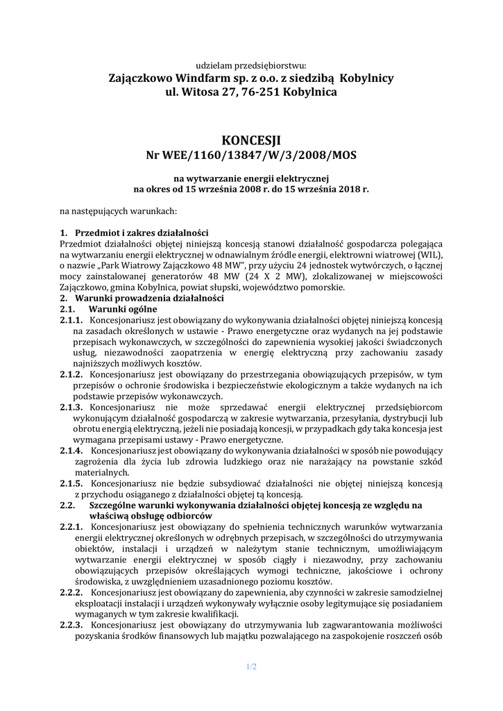 udzielam przedsiębiorstwu: Zajączkowo Windfarm sp. z o.o. z siedzibą Kobylnicy ul. Witosa 27, 76-251 Kobylnica KONCESJI Nr WEE/1160/13847/W/3/2008/MOS na wytwarzanie energii elektrycznej na okres od 15 września 2008 r. do 15 września 2018 r. na następujących warunkach: 1. Przedmiot i zakres działalności Przedmiot działalności objętej niniejszą koncesją stanowi działalność gospodarcza polegająca na wytwarzaniu energii elektrycznej w odnawialnym źródle energii, elektrowni wiatrowej (WIL), o nazwie „Park Wiatrowy Zajączkowo 48 MW”, przy użyciu 24 jednostek wytwórczych, o łącznej mocy zainstalowanej generatorów 48 MW (24 X 2 MW), zlokalizowanej w miejscowości Zajączkowo, gmina Kobylnica, powiat słupski, województwo pomorskie. 2. Warunki prowadzenia działalności 2.1. Warunki ogólne 2.1.1. Koncesjonariusz jest obowiązany do wykonywania działalności objętej niniejszą koncesją na zasadach określonych w ustawie - Prawo energetyczne oraz wydanych na jej podstawie przepisach wykonawczych, w szczególności do zapewnienia wysokiej jakości świadczonych usług, niezawodności zaopatrzenia w energię elektryczną przy zachowaniu zasady najniższych możliwych kosztów. 2.1.2. Koncesjonariusz jest obowiązany do przestrzegania obowiązujących przepisów, w tym przepisów o ochronie środowiska i bezpieczeństwie ekologicznym a także wydanych na ich podstawie przepisów wykonawczych. 2.1.3. Koncesjonariusz nie może sprzedawać energii elektrycznej przedsiębiorcom wykonującym działalność gospodarczą w zakresie wytwarzania, przesyłania, dystrybucji lub obrotu energią elektryczną, jeżeli nie posiadają koncesji, w przypadkach gdy taka koncesja jest wymagana przepisami ustawy - Prawo energetyczne. 2.1.4. Koncesjonariusz jest obowiązany do wykonywania działalności w sposób nie powodujący zagrożenia dla życia lub zdrowia ludzkiego oraz nie narażający na powstanie szkód materialnych. 2.1.5. Koncesjonariusz nie będzie subsydiować działalności nie objętej niniejszą koncesją z przychodu osiąganego z działalności objętej tą koncesją. 2.2. Szczególne warunki wykonywania działalności objętej koncesją ze względu na właściwą obsługę odbiorców 2.2.1. Koncesjonariusz jest obowiązany do spełnienia technicznych warunków wytwarzania energii elektrycznej określonych w odrębnych przepisach, w szczególności do utrzymywania obiektów, instalacji i urządzeń w należytym stanie technicznym, umożliwiającym wytwarzanie energii elektrycznej w sposób ciągły i niezawodny, przy zachowaniu obowiązujących przepisów określających wymogi techniczne, jakościowe i ochrony środowiska, z uwzględnieniem uzasadnionego poziomu kosztów. 2.2.2. Koncesjonariusz jest obowiązany do zapewnienia, aby czynności w zakresie samodzielnej eksploatacji instalacji i urządzeń wykonywały wyłącznie osoby legitymujące się posiadaniem wymaganych w tym zakresie kwalifikacji. 2.2.3. Koncesjonariusz jest obowiązany do utrzymywania lub zagwarantowania możliwości pozyskania środków finansowych lub majątku pozwalającego na zaspokojenie roszczeń osób 1/2 trzecich mogących powstać wskutek niewłaściwego wykonywania działalności objętej koncesją, w tym szkód w środowisku. 2.3. Warunki zaprzestania działalności po wygaśnięciu koncesji lub jej cofnięciu 2.3.1. Koncesjonariusz nie później niż na 18 miesięcy przed upływem ważności koncesji i zaprzestaniem działalności, spowoduje opracowanie na własny koszt i przedstawi Prezesowi URE analizy: 1) techniczną 2) finansową (wraz z opinią i raportem biegłego rewidenta z przeprowadzonego badania sprawozdania finansowego koncesjonariusza za ostatni rok działalności – jeśli obowiązek badania tego sprawozdania wynika z przepisów ustawy z dnia 29 września 1994 r. o rachunkowości /Dz. U. z 2002 r. Nr 76, poz. 694 z późn. zm./), 3) wpływu na środowisko, w zakresie wykonywanej działalności koncesjonowanej, które określą w szczególności stan wywiązania się Koncesjonariusza ze zobowiązań względem osób trzecich na dzień przewidywanego zakończenia tej działalności. 2.3.2. Koncesjonariusz jest obowiązany do realizacji wniosków i zaleceń wynikających z powyższych analiz, w najkrótszym możliwym terminie. 2.3.3. Koncesjonariusz jest obowiązany po zaprzestaniu działalności koncesjonowanej, do likwidacji skutków swojej działalności, w szczególności w zakresie rekultywacji gruntów, przywrócenia rzeźby terenu do właściwego stanu, utylizacji odpadów niebezpiecznych. 2.3.4. Koncesjonariusz, w terminie 18 miesięcy przed planowaną datą zaprzestania działalności koncesjonowanej, opracuje i przedstawi Prezesowi URE plan działań, o których mowa w punkcie 2.3.3., z podaniem źródeł ich finansowania. W przypadku wystąpienia istotnych zmian warunków, na podstawie których powyższy plan został sporządzony, Koncesjonariusz jest obowiązany do jego niezwłocznej aktualizacji. 2.4. Sprawozdawczość i udzielanie informacji 2.4.1. Koncesjonariusz jest obowiązany zawiadomić Prezesa URE o zmianach dotyczących wykonywanej działalności objętej niniejszą koncesją (w tym w szczególności firmy, siedziby, numeru w ewidencji działalności gospodarczej, numeru identyfikacji podatkowej, rozszerzenia bądź ograniczenia tej działalności) nie później niż 14 dni od dnia ich powstania. 2.4.2. Koncesjonariusz jest obowiązany do pisemnego poinformowania Prezesa URE o zamiarze zaprzestania działalności koncesjonowanej nie później niż na 18 miesięcy przed przewidywaną datą zaprzestania działalności. 2.4.3. Koncesjonariusz jest obowiązany zawiadomić Prezesa URE o niepodjęciu działalności objętej koncesją, jeżeli nie podejmie jej w ciągu 6 miesięcy od dnia doręczenia koncesji, podając przyczyny niepodjęcia działalności; za datę podjęcia działalności uważa się datę faktycznego rozpoczęcia zarobkowego wytwarzania ene