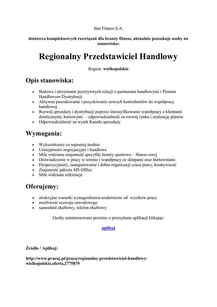 Star Fitness S.A. dostawca kompleksowych rozwiązań dla branży fitness, aktualnie poszukuje osoby na stanowisko: Regionalny Przedstawiciel Handlowy Region: wielkopolskie Opis stanowiska: Budowa i utrzymanie pozytywnych relacji z partnerami handlowymi i Pionem Handlowym Dystrybucji Aktywne poszukiwanie i pozyskiwanie nowych kontrahentów do współpracy handlowej Rozwój sprzedaży i dystrybucji poprzez intensyfikowanie współpracy z klientami detalicznymi, hurtowymi – odpowiedzialność za rozwój rynku i realizację planów Odpowiedzialność za wynik Kanału sprzedaży Wymagania: Wykształcenie co najmniej średnie Umiejętności negocjacyjne i handlowe Mile widziana znajomość specyfiki branży sportowo – fitness-owej Doświadczenie w pracy w terenie i współpracy ze sklepami oraz hurtowniami Dyspozycyjność, zaangażowanie i dobra organizacji czasu pracy, kreatywność Znajomość pakietu MS Office Mile widziane referencje Oferujemy: atrakcyjne warunki wynagrodzenia uzależnione od wyników pracy możliwość rozwoju zawodowego samochód służbowy, telefon służbowy Osoby zainteresowane prosimy o przesyłanie aplikacji klikając: aplikuj Źródło / Aplikuj: http://www.pracuj.pl/praca/regionalny-przedstawiciel-handlowywielkopolskie,oferta,2775879