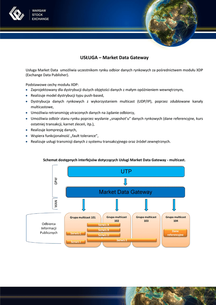 USŁUGA – Market Data Gateway Usługa Market Data umożliwia uczestnikom rynku odbior danych rynkowych za pośrednictwem modułu XDP (Exchange Data Publisher). Podstawowe cechy modułu XDP: Zaprojektowany dla dystrybucji dużych objętości danych z małym opóźnieniem wewnętrznym, Realizuje model dystrybucji typu push-based, Dystrybucja danych rynkowych z wykorzystaniem multicast (UDP/IP), poprzez zdublowane kanały multicastowe, Umożliwia retransmisję utraconych danych na żądanie odbiorcy, Umożliwia odbiór stanu rynku poprzez wysłanie „snapshot’u” danych rynkowych (dane referencyjne, kurs ostatniej transakcji, karnet zleceń, itp.), Realizuje kompresję danych, Wspiera funkcjonalność „fault tolerance”, Realizuje usługi transmisji danych z systemu transakcyjnego oraz źródeł zewnętrznych. Schemat dostępnych interfejsów dotyczących Usługi Market Data Gateway - multicast. Schemat dostępnych interfejsów dotyczących Usługi Market Data Gateway - unicast. Ogólny opis rozwiązania: Dostęp do Usługi Market Data Gateway możliwy jest jedynie dla Członków Giełdy lub Dystrybutorów Informacji; Członek Giełdy lub Dystrybutor Informacji odpowiedzialny jest za wykonanie projektu infrastruktury dostępowej, jego wykonanie, a następnie za utrzymanie zbudowanego rozwiązania; Infrastruktura dostępowa musi być zgodna z wymogami GPW opisanymi w dokumentacji technicznej; Dostęp realizowany jest za pomocą rozwiązań WAN opartych na technologii MPLS i z wykorzystaniem operatorów telekomunikacyjnych wskazanych w dokumentacji technicznej; Dołączenie realizowane jest dwiema liniami, po jednej do każdego z ośrodków obliczeniowych GPW (podstawowego i zapasowego); Dostęp do usługi może być realizowany wyłącznie przy użyciu oprogramowania certyfikowanego przez GPW w zakresie współpracy z Systemami Giełdowymi; Wybór zakresu danych pozyskiwanych z dołączenia do Usługi Market Data Gateway należy do Klienta GPW; Dostęp do tej Usługi GPW, realizowany jest przy wykorzystaniu binarnego protokołu XDP; Usługa XDP „Real Time”– udostępnia interfejs dla odbioru danych rynkowych w czasie rzeczywistym: Pełny zakres funkcjonalny w podziale na zakres informacyjny: (101): Wszystkie komunikaty dotyczące rynków organizowanych przez GPW (bez komunikatu „bestlimits”); (102): Tylko komunikaty „bestlimits” dotyczące rynków organizowanych przez GPW (serwis dodatkowy dostępny jedynie z serwisem nr 101); (103): Wszystkie komunikaty dotyczące rynków organizowanych przez BondSpot; (104): Dane referencyjne (serwis techniczny dostępny na potrzeby funkcjonalności Refresh Service)dotyczące rynków organizowanych przez GPW i BondSpot; Interfejs fizyczny – odbiór multicast (UDP), informacje nadawane są poprzez kilka kanałów technicznych; usługa XDP „Retransmission”– udostępnia interfejs dla odbioru danych utraconych podczas transmisji: Odbiór utraconych komunikatów (krótkotrwałe zaburzenia, komunikaty w zakresie strumienia „Real Time”); Interfejs fizyczny – dedykowane połączenie TCP/IP, tylko do obsługi zapytań/odpowiedzi dotyczących retransmisji; Usługa XDP „Refresh”– udostępnia interfejs dla odbioru „stanu rynku” po dłuższej przerwie w odbiorze bieżącym: Odbiór „stanu rynku” („snapshot” zawierający dane referencyjne, ostatnie kursy transakcji, najniższe/najwyższe kursy, arkusz zleceń; Interfejs fizyczny – dedykowane połączenie TCP/IP tylko do zapytań, multicast dla obsługi odpowiedzi dotyczących funkcji „refresh”. Dokumentacja: Informacje dotycząca samej usługi oraz informacje powiązane z usługą Market Data Gateway znajdują się w niżej wymienionych dokumentach: Dokumentacja Techniczna – Dokument nr 7 Specyficzne parametry dostępu do Market Data Gateway GPW - Konfiguracja XDP CDE v1.8 PL WSE - XDP CDE Message Specifications - v 4.8 PL Zamówienie usługi: W celu zamówienia usługi Market Data Gateway należy: Członek Giełdy i Dystrybutor Informacji wykorzystujący dane giełdowe w celu ich redystrybucji podpisać umowę o dystrybucję danych giełdowych oraz wypełnić zał. do umowy: Członek Giełdy wykorzystujący giełdowe tylko na własne potrzeby dane Podmiot wnioskujący o członkostwo na GPW wykorzystujący dane giełdowe tylko na własne potrzeby wypełnić załączniki do umowy: podpisać umowę o dostęp do systemów informatycznych giełdy oraz wypełnić zał. do umowy: Załącznik nr 3 do umowy o dostęp członka giełdy do systemów informatycznych giełdy Załącznik nr 3 do umowy o dostęp członka giełdy do systemów informatycznych giełdy Załącznik nr 4 do Umowy o dystrybucję danych giełdowych (Formularz danych technicznych) Załącznik nr 4 do Umowy o dostęp członka giełdy do systemów informatycznych giełdy (Formularz danych technicznych) instrukcja wypełniania załączników znajduje się na stronie GPW; instrukcja wypełniania załączników znajduje się na stronie GPW; podpisaną umowę wraz z prawidłowo wypełnionym załącznikiem należy przesłać do Działu Produktów Informacyjnych: prawidłowo wypełnione załączniki należy przesłać do Zespołu Członków Giełdy: +48 22 5377998 [email protected] +48 22 5377184 [email protected] +48 22 5377674 [email protected] +48 22 5377609 +48 22 5377453 +48 22 5377163 [email protected] +48 22 5377298 Załącznik nr 4 do Umowy o dostęp członka giełdy do systemów informatycznych giełdy (Formularz danych technicznych) instrukcja wypełniania załączników znajduje się na stronie GPW; podpisaną umowę wraz z prawidłowo wypełnionymi załącznikami należy przesłać do Zespołu Market Access: [email protected] Na podstawie przesłanych załączników przygotowywany jest dostęp techniczny do usługi Market Data Gateway. Kontakt w sprawach technicznych: Zespół Wsparcia Klientów GPW: [email protected] ; +48 22 537 7341 lub 7100 Po przygotowaniu dostępu do usługi klient może r