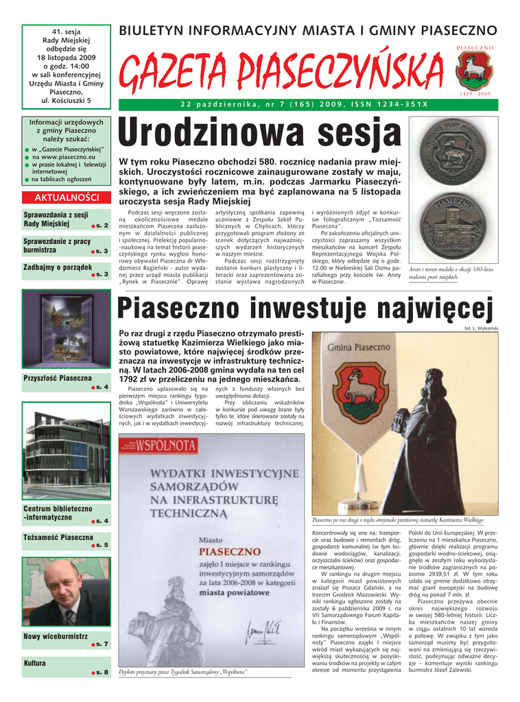 41. sesja Rady Miejskiej odbędzie się 18 listopada 2009 o godz. 14:00 w sali konferencyjnej Urzędu Miasta i Gminy Piaseczno, ul. Kościuszki 5 Informacji urzędowych z gminy Piaseczno należy szukać: ● w „Gazecie Piaseczyńskiej” ● na www.piaseczno.eu ● w prasie lokalnej i telewizji internetowej ● na tablicach ogłoszeń AKTUALNOŚCI Sprawozdania z sesji Rady Miejskiej ● s. 2 Sprawozdanie z pracy burmistrza ● s. 3 Zadbajmy o porządek ● s. 3 BIULETYN INFORMACYJNY MIASTA I GMINY PIASECZNO 22 października, nr 7 (165) 2009, ISSN 1234-351X Urodzinowa sesja W tym roku Piaseczno obchodzi 580. rocznicę nadania praw miejskich. Uroczystości rocznicowe zainaugurowane zostały w maju, kontynuowane były latem, m.in. podczas Jarmarku Piaseczyńskiego, a ich zwieńczeniem ma być zaplanowana na 5 listopada uroczysta sesja Rady Miejskiej Podczas sesji wręczone zostaną okolicznościowe medale mieszkańcom Piaseczna zasłużonym w działalności publicznej i społecznej. Prelekcję popularno-naukową na temat historii piaseczyńskiego rynku wygłosi honorowy obywatel Piaseczna dr Włodzimierz Bagieński - autor wydanej przez urząd miasta publikacji „Rynek w Piasecznie”. Oprawę artystyczną spotkania zapewnią uczniowie z Zespołu Szkół Publicznych w Chylicach, którzy przygotowali program złożony ze scenek dotyczących najważniejszych wydarzeń historycznych w naszym mieście. Podczas sesji rozstrzygnięty zostanie konkurs plastyczny i literacki oraz zaprezentowana zostanie wystawa nagrodzonych i wyróżnionych zdjęć w konkursie fotograficznym „Tożsamość Piaseczna”. Po zakończeniu oficjalnych uroczystości zapraszamy wszystkim mieszkańców na koncert Zespołu Reprezentacyjnego Wojska Polskiego, który odbędzie się o godz. 12.00 w Niebieskiej Sali Domu parafialnego przy kościele św. Anny w Piasecznie. Awers i rewers medalu z okazji 580-lecia nadania praw miejskich Piaseczno inwestuje najwięcej Przyszłość Piaseczna ● fot. Ł. Wyleziński Po raz drugi z rzędu Piaseczno otrzymało prestiżową statuetkę Kazimierza Wielkiego jako miasto powiatowe, które najwięcej środków przeznacza na inwestycje w infrastrukturę techniczną. W latach 2006-2008 gmina wydała na ten cel 1792 zł w przeliczeniu na jednego mieszkańca. s. 4 Piaseczno uplasowało się na pierwszym miejscu rankingu tygodnika „Wspólnota” i Uniwersytetu Warszawskiego zarówno w całościowych wydatkach inwestycyjnych, jak i w wydatkach inwestycyj- nych z funduszy własnych bez uwzględniania dotacji. Przy obliczaniu wskaźników w konkursie pod uwagę brane były tylko te, które skierowane zostały na rozwój infrastruktury technicznej. Centrum biblioteczno -informatyczne ● s. 4 Piaseczno po raz drugi z rzędu otrzymało prestiżową statuetkę Kazimierza Wielkiego Tożsamość Piaseczna ● s. 5 ● s. 7 ● s. 8 Nowy wiceburmistrz Kultura Dyplom przyznany przez Tygodnik Samorządowy „Wspólnota” Koncentrowały się one na: transporcie oraz budowie i remontach dróg, gospodarce komunalnej (w tym budowie wodociągów, kanalizacji, oczyszczalni ścieków) oraz gospodarce mieszkaniowej. W rankingu na drugim miejscu w kategorii miast powiatowych znalazł się Pruszcz Gdański, a na trzecim Grodzisk Mazowiecki. Wyniki rankingu ogłoszone zostały na zostały 6 października 2009 r. na VII Samorządowego Forum Kapitału i Finansów. Na początku września w innym rankingu samorządowym „Wspólnoty” Piaseczno zajęło I miejsce wśród miast wykazujących się największą skutecznością w pozyskiwaniu środków na projekty w całym okresie od momentu przystąpienia Polski do Unii Europejskiej. W przeliczeniu na 1 mieszkańca Piaseczno, głównie dzięki realizacji programu gospodarki wodno-ściekowej, osiągnęło w zeszłym roku wykorzystanie środków zagranicznych na poziomie 2939,51 zł. W tym roku udało się gminie dodatkowo otrzymać grant europejski na budowę dróg na ponad 7 mln. zł. Piaseczno przeżywa obecnie okres największego rozwoju w swojej 580-letniej historii. Liczba mieszkańców naszej gminy w ciągu ostatnich 10 lat wzrosła o połowę. W związku z tym jako samorząd musimy być przygotowani na zmieniającą się rzeczywistość, podejmując odważne decyzje - komentuje wyniki rankingu burmistrz Józef Zalewski. 2 AKTUALNOŚCI 22 października nr 7 (165) 2009 Sprawozdanie z 39. sesji Rady Miejskiej w Piasecznie Radni uznali za bezzasadne wezwania do usunięcia naruszenia interesu prawnego pani Anny Nestorowicz oraz pana Józefa Zalewskiego, burmistrza miasta i gminy Piaseczno, dokonanego uchwałą nr 1101/XIIN/2009 Rady Miejskiej w Piasecznie z dnia 19 sierpnia 2009 r. w sprawie cofnięcia skargi z dnia 8 maja 2007 r. na zarządzenie zastępcze wojewody mazowieckiego. Rada Miejska przyjęła sprawozdanie z wykonania budżetu gminy Piaseczno za pierwsze półrocze 2009 r. Zmniejszone zostały wydatki na opłaty i składki (o 50 tys. zł) oraz na utrzymanie budynków komunalnych (o 480 tys. zł). Zaoszczędzone środki przeznaczone zostaną na uregulowanie opłat za zużycie energii elektrycznej dla potrzeb oświetlenia ulicznego w gminie Piaseczno. W związku ze znacznie mniejszymi, niż pierwotnie planowano, dochodami gminy radni zmniejszyli dochody i wydatki na rok 2009. Jednocześnie zmniejszone zostały środki na realizację zadań, których koszt okazał się niższy, niż planowano. Rada zwiększyła wydatki o 45 tys. zł na realizację zajęć tenisa stołowego na terenie Piaseczna. Zwiększone zostały także wydatki na: - wykonanie nakładki asfaltowej ul. Staszica w Piasecznie - o prawie 76 tys. zł - wykonanie odwodnienia, podbudowy i nawierzchni z kostki w ul. Staropolskiej w Piasecznie o prawie 23 tys. zł. Rada przeznaczyła 14 tys. zł na zakup wzorcowego kiosku sprzedaży gazet, który będzie prezentowa- ny zainteresowanym dzierżawą gruntu pod usługi handlowe. Radni zmienili uchwałę Nr 1115/XXXVIII/2009 z 26.08.2009 r. w sprawi