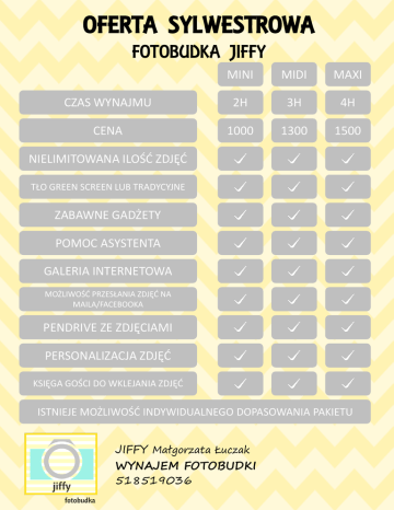 OFERTA SYLWESTROWA FOTOBUDKA JIFFY MINI MIDI MAXI CZAS WYNAJMU 2H 3H 4H CENA 1000 1300 1500 NIELIMITOWANA ILOŚĆ ZDJĘĆ TŁO GREEN SCREEN LUB TRADYCYJNE ZABAWNE GADŻETY POMOC ASYSTENTA GALERIA INTERNETOWA MOŻLIWOŚĆ PRZESŁANIA ZDJĘĆ NA MAILA/FACEBOOKA PENDRIVE ZE ZDJĘCIAMI PERSONALIZACJA ZDJĘĆ KSIĘGA GOŚCI DO WKLEJANIA ZDJĘĆ ISTNIEJE MOŻLIWOŚĆ INDYWIDUALNEGO DOPASOWANIA PAKIETU JIFFY Małgorzata Łuczak WYNAJEM FOTOBUDKI 518519036 INFORMACJE DODATKOWE Personalizacja boków fotobudki już od 100zł Tła i ramki zdjęć indywidualnie dopasowane do Państwa potrzeb – możemy stworzyć ich dowolną ilość według Państwa projektów Nasze gadżety do wyboru: -kapelusze (m.in. kowboj, policjant, szeryf, mafia, cekinowe, pirat) - peruki - maski (krzyk, anonymous, klaun, zwierzątka, głowa konia, maski balowe) - opaski ( z uszkami, koronami, różkami, opaska Indianki) - okulary - gadżety do rąk (berło, strzelby, różdżka, widełki diabełka) - gadżety na patyczkach (wąsy, usta, serca, muszki, brody, kapelusze, fajki, lizaki, korony, okulary itp.) - gadżety noworoczne (czapki, okulary, patyczki) ISTNIEJE MOŻLIWOŚĆ PRZYGOTOWANIA GADŻETÓW TEMATYCZNYCH – cena do uzgodnienia JIFFY Małgorzata Łuczak WYNAJEM FOTOBUDKI 518519036