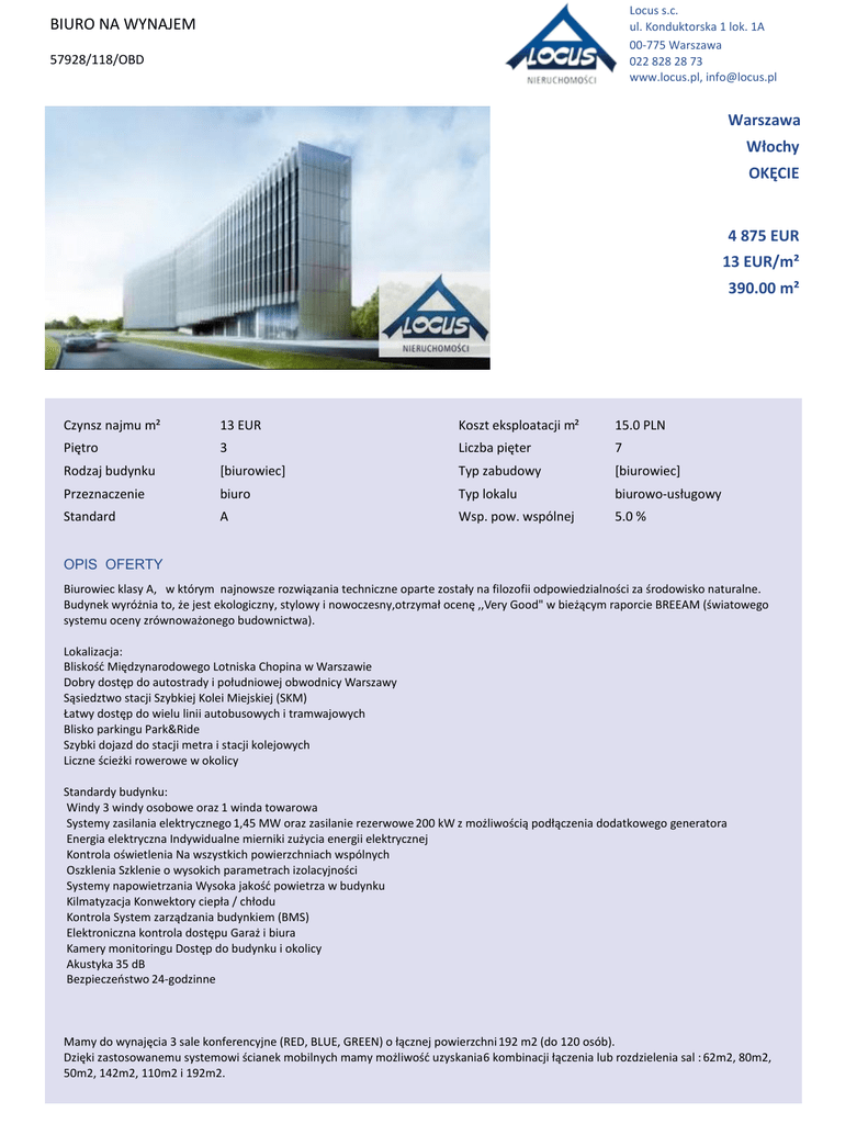 Locus s.c. ul. Konduktorska 1 lok. 1A 00-775 Warszawa 022 828 28 73 www.locus.pl, [email protected] BIURO NA WYNAJEM 57928/118/OBD Warszawa tųŽĐŚLJ K<%/ 4 875 EUR 13 EUR/m² 390.00 m² Czynsz najmu m² 13 EUR Koszt eksploatacji m² 15.0 PLN WŝħƚƌŽ 3 >ŝĐnjďĂƉŝħƚĞƌ 7 Rodzaj budynku [biurowiec] Typ zabudowy [biurowiec] Przeznaczenie biuro Typ lokalu ďŝƵƌŽǁŽͲƵƐųƵŐŽǁLJ Standard A Wsp. pow. wspólnej 5.0 % OPIS OFERTY ŝƵƌŽǁŝĞĐŬůĂƐLJ͕ǁŬƚſƌLJŵŶĂũŶŽǁƐnjĞƌŽnjǁŝČnjĂŶŝĂƚĞĐŚŶŝĐnjŶĞŽƉĂƌƚĞnjŽƐƚĂųLJŶĂĨŝůŽnjŽĨŝŝŽĚƉŽǁŝĞĚnjŝĂůŶŽƑĐŝnjĂƑƌŽĚŽǁŝƐŬŽŶĂƚƵƌĂůŶĞ͘ ƵĚLJŶĞŬǁLJƌſǏŶŝĂƚŽ͕ǏĞũĞƐƚĞŬŽůŽŐŝĐnjŶLJ͕ƐƚLJůŽǁLJŝŶŽǁŽĐnjĞƐŶLJ͕ŽƚƌnjLJŵĂųŽĐĞŶħ͕͕sĞƌLJ'ŽŽĚΗǁďŝĞǏČĐLJŵƌĂƉŽƌĐŝĞZD;ƑǁŝĂƚŽǁĞŐŽ ƐLJƐƚĞŵƵŽĐĞŶLJnjƌſǁŶŽǁĂǏŽŶĞŐŽďƵĚŽǁŶŝĐƚǁĂͿ͘ Lokalizacja: ůŝƐŬŽƑđDŝħĚnjLJŶĂƌŽĚŽǁĞŐŽ>ŽƚŶŝƐŬĂŚŽƉŝŶĂǁtĂƌƐnjĂǁŝĞ ŽďƌLJĚŽƐƚħƉĚŽĂƵƚŽƐƚƌĂĚLJŝƉŽųƵĚŶŝŽǁĞũŽďǁŽĚŶŝĐLJtĂƌƐnjĂǁLJ ^ČƐŝĞĚnjƚǁŽƐƚĂĐũŝ^njLJďŬŝĞũ<ŽůĞŝDŝĞũƐŬŝĞũ;^<DͿ BĂƚǁLJĚŽƐƚħƉĚŽǁŝĞůƵůŝŶŝŝĂƵƚŽďƵƐŽǁLJĐŚŝƚƌĂŵǁĂũŽǁLJĐŚ Blisko parkingu Park&Ride Szybki dojazd do stacji metra i stacji kolejowych >ŝĐnjŶĞƑĐŝĞǏŬŝƌŽǁĞƌŽǁĞǁŽŬŽůŝĐLJ Standardy budynku: Windy 3 windy osobowe oraz 1 winda towarowa Systemy zasilania elektrycznego 1,45 MW oraz zasilanie rezerwowe 200ŬtnjŵŽǏůŝǁŽƑĐŝČƉŽĚųČĐnjĞŶŝĂĚŽĚĂƚŬŽǁĞŐŽŐĞŶĞƌĂƚŽƌĂ ŶĞƌŐŝĂĞůĞŬƚƌLJĐnjŶĂ/ŶĚLJǁŝĚƵĂůŶĞŵŝĞƌŶŝŬŝnjƵǏLJĐŝĂĞŶĞƌŐŝŝĞůĞŬƚƌLJĐnjŶĞũ <ŽŶƚƌŽůĂŽƑǁŝĞƚůĞŶŝĂEĂǁƐnjLJƐƚŬŝĐŚƉŽǁŝĞƌnjĐŚŶŝĂĐŚǁƐƉſůŶLJĐŚ KƐnjŬůĞŶŝĂ^njŬůĞŶŝĞŽǁLJƐŽŬŝĐŚƉĂƌĂŵĞƚƌĂĐŚŝnjŽůĂĐLJũŶŽƑĐŝ ^LJƐƚĞŵLJŶĂƉŽǁŝĞƚƌnjĂŶŝĂtLJƐŽŬĂũĂŬŽƑđƉŽǁŝĞƚƌnjĂǁďƵĚLJŶŬƵ <ŝůŵĂƚLJnjĂĐũĂ<ŽŶǁĞŬƚŽƌLJĐŝĞƉųĂͬĐŚųŽĚƵ <ŽŶƚƌŽůĂ^LJƐƚĞŵnjĂƌnjČĚnjĂŶŝĂďƵĚLJŶŬŝĞŵ;D^Ϳ ůĞŬƚƌŽŶŝĐnjŶĂŬŽŶƚƌŽůĂĚŽƐƚħƉƵ'ĂƌĂǏŝďŝƵƌĂ <ĂŵĞƌLJŵŽŶŝƚŽƌŝŶŐƵŽƐƚħƉĚŽďƵĚLJŶŬƵŝŽŬŽůŝĐLJ Akustyka 35 dB ĞnjƉŝĞĐnjĞŷƐƚǁŽ24-godzinne DĂŵLJĚŽǁLJŶĂũħĐŝĂ3ƐĂůĞŬŽŶĨĞƌĞŶĐLJũŶĞ;Z͕>h͕'ZEͿŽųČĐnjŶĞũƉŽǁŝĞƌnjĐŚŶŝ192 m2 (do 120 osób). njŝħŬŝnjĂƐƚŽƐŽǁĂŶĞŵƵƐLJƐƚĞŵŽǁŝƑĐŝĂŶĞŬŵŽďŝůŶLJĐŚŵĂŵLJŵŽǏůŝǁŽƑđƵnjLJƐŬĂŶŝĂ6ŬŽŵďŝŶĂĐũŝųČĐnjĞŶŝĂůƵďƌŽnjĚnjŝĞůĞŶŝĂƐĂů͗62m2, 80m2, 50m2, 142m2, 110m2 i 192m2. BIURO NA WYNAJEM 57928/118/OBD Locus s.c. ul. Konduktorska 1 lok. 1A 00-775 Warszawa 022 828 28 73 www.locus.pl, [email protected] Czynsz- 12,5EUR/m Koszty eksploatacyjne 15pln/m tƐƉſųĐnjLJŶŶŝŬƉŽǁŝĞƌnjĐŚŶŝǁƐƉſůŶLJĐŚͲ5% tƐƉſųĐnjLJŶŶŝŬŵŝĞũƐĐƉĂƌŬŝŶŐŽǁLJĐŚ1/40 Miejsce parkingowe - 80 EUR Powierzchnia kondygnacji - 1600ŵ͕ŵŽǏŶĂƉŽĚnjŝĞůŝđŶĂ4 najemców. Minimalny czas najmu - 3 lata. EƵŵĞƌůŝĐĞŶĐũŝƉŽƑƌĞĚŶŝŬĂŽĚƉŽǁŝĞĚnjŝĂůŶĞŐŽnjĂǁŽĚŽǁŽnjĂǁLJŬŽŶĂŶŝĞƵŵŽǁLJƉŽƑƌĞĚŶŝĐƚǁĂ͗ϱϰϴϬ Kontakt ,ƵďĞƌƚ^ĂďĂųĂ 602 392 444 [email protected] KK&Zd%