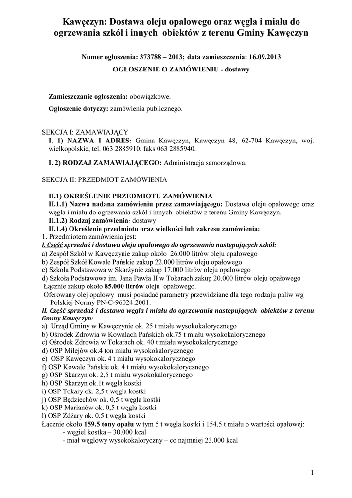Kawęczyn: Dostawa oleju opałowego oraz węgla i miału do ogrzewania szkół i innych obiektów z terenu Gminy Kawęczyn Numer ogłoszenia: 373788 – 2013; data zamieszczenia: 16.09.2013 OGŁOSZENIE O ZAMÓWIENIU - dostawy Zamieszczanie ogłoszenia: obowiązkowe. Ogłoszenie dotyczy: zamówienia publicznego. SEKCJA I: ZAMAWIAJĄCY I. 1) NAZWA I ADRES: Gmina Kawęczyn, Kawęczyn 48, 62-704 Kawęczyn, woj. wielkopolskie, tel. 063 2885910, faks 063 2885940. I. 2) RODZAJ ZAMAWIAJĄCEGO: Administracja samorządowa. SEKCJA II: PRZEDMIOT ZAMÓWIENIA II.1) OKREŚLENIE PRZEDMIOTU ZAMÓWIENIA II.1.1) Nazwa nadana zamówieniu przez zamawiającego: Dostawa oleju opałowego oraz węgla i miału do ogrzewania szkół i innych obiektów z terenu Gminy Kawęczyn. II.1.2) Rodzaj zamówienia: dostawy II.1.4) Określenie przedmiotu oraz wielkości lub zakresu zamówienia: 1. Przedmiotem zamówienia jest: I. Część sprzedaż i dostawa oleju opałowego do ogrzewania następujących szkół: a) Zespół Szkół w Kawęczynie zakup około 26.000 litrów oleju opałowego b) Zespół Szkół Kowale Pańskie zakup 22.000 litrów oleju opałowego c) Szkoła Podstawowa w Skarżynie zakup 17.000 litrów oleju opałowego d) Szkoła Podstawowa im. Jana Pawła II w Tokarach zakup 20.000 litrów oleju opałowego Łącznie zakup około 85.000 litrów oleju opałowego. Oferowany olej opałowy musi posiadać parametry przewidziane dla tego rodzaju paliw wg Polskiej Normy PN-C-96024:2001. II. Część sprzedaż i dostawa węgla i miału do ogrzewania następujących obiektów z terenu Gminy Kawęczyn: a) Urząd Gminy w Kawęczynie ok. 25 t miału wysokokalorycznego b) Ośrodek Zdrowia w Kowalach Pańskich ok.75 t miału wysokokalorycznego c) Ośrodek Zdrowia w Tokarach ok. 40 t miału wysokokalorycznego d) OSP Milejów ok.4 ton miału wysokokalorycznego e) OSP Kawęczyn ok. 4 t miału wysokokalorycznego f) OSP Kowale Pańskie ok. 4 t miału wysokokalorycznego g) OSP Skarżyn ok. 2,5 t miału wysokokalorycznego h) OSP Skarżyn ok.1t węgla kostki i) OSP Tokary ok. 2,5 t węgla kostki j) OSP Będziechów ok. 0,5 t węgla kostki k) OSP Marianów ok. 0,5 t węgla kostki l) OSP Żdżary ok. 0,5 t węgla kostki Łącznie około 159,5 tony opału w tym 5 t węgla kostki i 154,5 t miału o wartości opałowej: - węgiel kostka – 30.000 kcal - miał węglowy wysokokaloryczny – co najmniej 23.000 kcal 1 2. Dostawca zobowiązany jest dostarczyć opał własnym transportem i na własny koszt w ilościach każdorazowo wskazanych przez Zamawiającego do wysokości zamówienia. 3. Do każdej dostawy Wykonawca obowiązany jest dołączyć certyfikat jakości opału potwierdzający spełnianie warunków określonych w niniejszym przetargu. 4. Ilość w części II zamówionego miału węglowego wysokokalorycznego oraz węgla należy traktować szacunkowo. Ilość ta może się zwiększyć lub zmniejszyć o ok. -/+ 20% w zależności od rzeczywistego zużycia w okresie od dnia zawarcia umowy do dnia zakończenia umowy tj. 31.07.2014 r. Taka zmiana ilości dostaw w w/w granicach nie stanowi istotnej zmiany umowy. 5. Zakres zamówienia łącznie: Olej opałowy: 85 000 litrów Węgiel kamienny 5 ton Miał węglowy 154,5 tony II.1.6) Wspólny Słownik Zamówień (CPV): 09.13.51.00-5; 09.11.12.10-5. II.1.7) Czy dopuszcza się złożenie oferty częściowej: tak, liczba części: 2. II.1.8) Czy dopuszcza się złożenie oferty wariantowej: nie. II.2) CZAS TRWANIA ZAMÓWIENIA LUB TERMIN WYKONANIA: Zakończenie: 31.07.2014. SEKCJA III: INFORMACJE O CHARAKTERZE PRAWNYM, EKONOMICZNYM, FINANSOWYM I TECHNICZNYM III.1) WADIUM Informacja na temat wadium: Zamawiający nie wymaga wniesienia wadium w przedmiotowym postępowaniu. III.3) WARUNKI UDZIAŁU W POSTĘPOWANIU ORAZ OPIS SPOSOBU DOKONYWANIA OCENY SPEŁNIANIA TYCH WARUNKÓW III.3.1) Uprawnienia do wykonywania określonej działalności lub czynności, jeżeli przepisy prawa nakładają obowiązek ich posiadania Opis sposobu dokonywania oceny spełniania tego warunku o Zamawiający uzna warunek za spełniony, jeżeli Wykonawca ubiegający się o zamówienie w I Części przedłoży ważną koncesję na obrót paliwami ciekłymi ważną co najmniej przez okres realizacji niniejszej umowy. W celu potwierdzenia spełnienia niniejszego warunku Wykonawca zobowiązany jest przedłożyć stosowny dokument. III.3.2) Wiedza i doświadczenie Opis sposobu dokonywania oceny spełniania tego warunku o Zamawiający nie określa szczegółowych wymagań. W celu potwierdzenia spełniania niniejszego warunku Wykonawcy zobowiązani są przedłożyć oświadczenie o spełnieniu warunków udziału w postępowaniu. III.3.3) Potencjał techniczny Opis sposobu dokonywania oceny spełniania tego warunku o Zamawiający nie określa szczegółowych wymagań. W celu potwierdzenia spełniania niniejszego warunku Wykonawcy zobowiązani są przedłożyć oświadczenie o spełnieniu warunków udziału w postępowaniu. 2 III.3.4) Osoby zdolne do wykonania zamówienia Opis sposobu dokonywania oceny spełniania tego warunku o Zamawiający nie określa szczegółowych wymagań. W celu potwierdzenia spełniania niniejszego warunku Wykonawcy zobowiązani są przedłożyć oświadczenie o spełnieniu warunków udziału w postępowaniu. III.3.5) Sytuacja ekonomiczna i finansowa Opis sposobu dokonywania oceny spełniania tego warunku o Zamawiający nie określa szczegółowych wymagań. W celu potwierdzenia spełniania niniejszego warunku Wykonawcy zobowiązani są przedłożyć oświadczenie o spełnieniu warunków udziału w postępowaniu. III.4) INFORMACJA O OŚWIADCZENIACH LUB DOKUMENTACH, JAKIE MAJĄ DOSTARCZYĆ WYKONAWCY W CELU POTWIERDZENIA SPEŁNIANIA WARUNKÓW UDZIAŁU W POSTĘPOWANIU ORAZ NIEPODLEGANIA WYKLUCZENIU NA PODSTAWIE ART. 24 UST. 1 USTAWY III.4.1) W zakresie wykazania spełniania przez wykonawcę warunków, o których mowa w art. 22 ust. 1 ustawy, oprócz oświadczenia o spełnianiu warunków udziału w postępowa