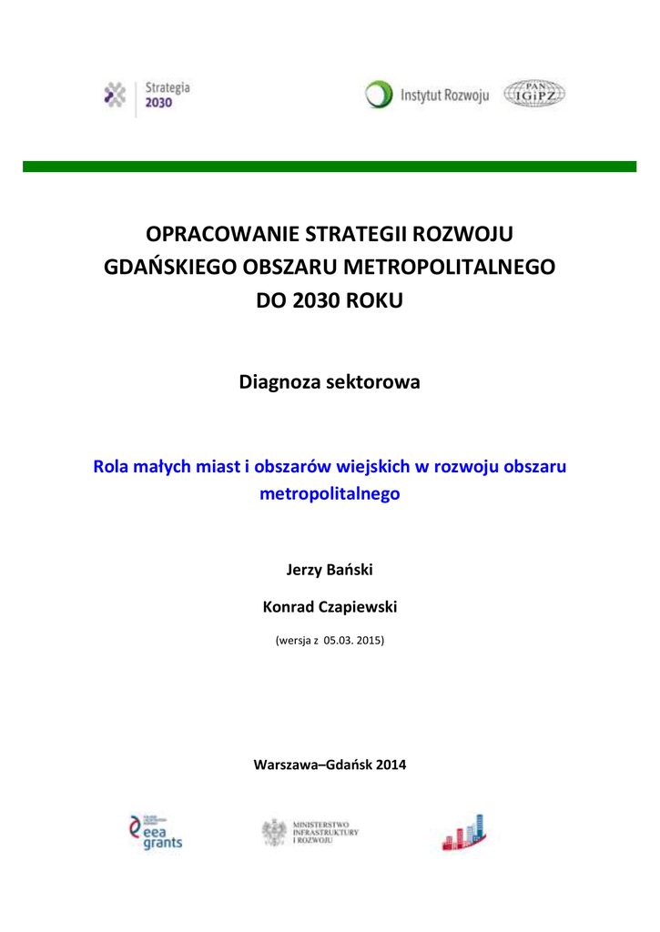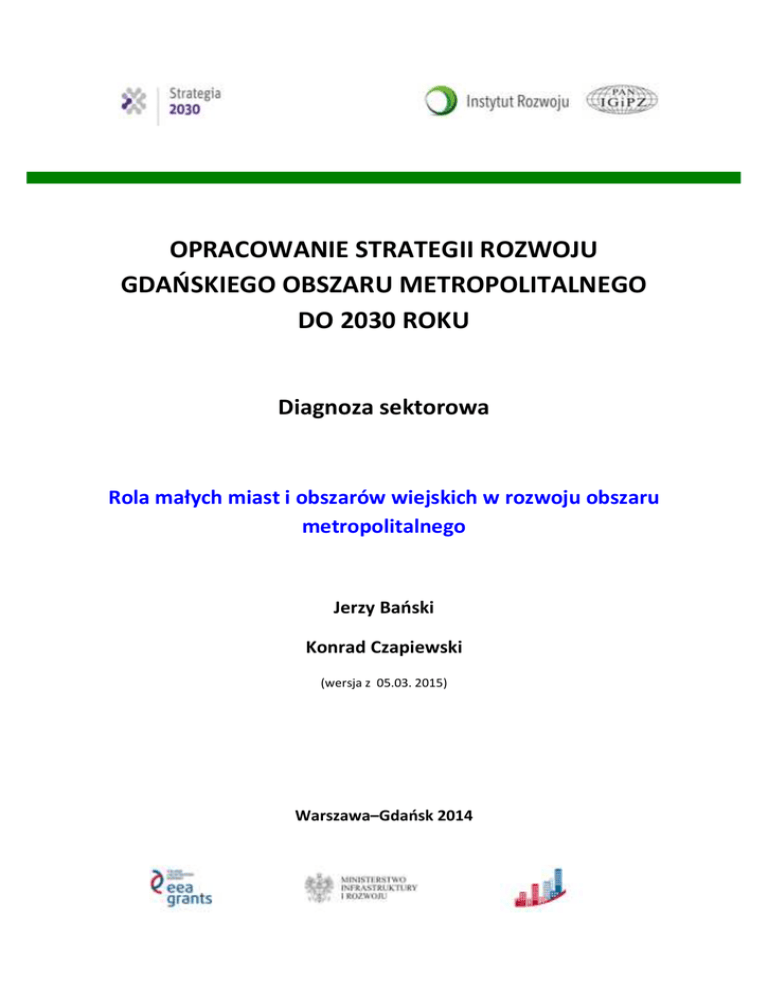 OPRACOWANIE STRATEGII ROZWOJU GDAŃSKIEGO OBSZARU METROPOLITALNEGO DO 2030 ROKU Diagnoza sektorowa Rola małych miast i obszarów wiejskich w rozwoju obszaru metropolitalnego Jerzy Bański Konrad Czapiewski (wersja z 05.03. 2015) Warszawa–Gdańsk 2014 Spis treści Executive summary .................................................................................................................................. 3 1. Wprowadzenie..................................................................................................................................... 8 2. Struktura przestrzenna obszarów wiejskich OM ................................................................................. 12 3. Podstawowe trendy w rozwoju małych miast i obszarów wiejskich OM ............................................. 14 4. Identyfikacja podstawowych problemów ........................................................................................... 18 5. Analiza zróżnicowania wewnętrznego w obrębie OM ......................................................................... 25 6. Analiza benchmarkingowa ................................................................................................................. 29 7. SWOT parametryczny......................................................................................................................... 31 8. Propozycja koordynacji działań w ramach OM.................................................................................... 34 9. Podsumowanie .................................................................................................................................. 35 Spis literatury ........................................................................................................................................ 37 Załącznik 1. - Rekomendacje dalszych prac analitycznych ....................................................................... 38 Executive summary Najważniejsze ustalenia 1. Obszar Metropolitalny, ma raczej niekorzystny system osadnictwa charakteryzujący się dysproporcjami w zakresie rozmieszczenia ośrodków miejskich. Ogólnie można w nim wyróżnić trzy strefy. Pierwszą jest zurbanizowana strefa nadmorska z miastami centralnymi (Gdańsk, Gdynia, Sopot) i ośrodkami uzupełniającymi (Wejherowo, Reda, Rumia, Pruszcz Gdański), które tworzą duży kompleks urbanistyczny. Drugą strefę stanowią miasta położone w sąsiedztwie tego kompleksu o zróżnicowanych funkcjach gospodarczych (Tczew, Malbork, Nowy Dwór Gdański, Nowy Staw, Żukowo, Kartuzy, Puck, Władysławowo) oraz gęsta sieć, na ogół dużych wsi. Do trzeciej strefy należą miasta zlokalizowane peryferyjnie - nieduże i z utrudnioną dostępnością komunikacyjną (Krynica Morska, Hel, Jastarnia, Łeba, Lębork, Pelplin, Gniew) oraz rzadziej rozmieszczone osady wiejskie, o zróżnicowanej wielkości. 2. Poza północnym i częściowo zachodnim fragmentem OM, małe miasta tworzą gęstą sieć, ułatwiającą podejmowanie współpracy oraz wzajemne uzupełnianie się w zakresie handlu i usług. Cechą charakterystyczną północnego pasa nadmorskiego jest natomiast brak małych i średniej wielkości miast; zlokalizowane są tam przede wszystkim liczne, ale nieduże wsie. 3. Położenie małych miast determinuje ich funkcje społeczno-gospodarcze. Ośrodki położone pod Trójmiastem pełnią przede wszystkim funkcje mieszkalne i w znacznie mniejszym stopniu rekreacyjno-usługowe. Dalej położone miasta stanowią ważne ogniwo lokalnej obsługi (usługi, handel, administracja). Są to głównie miasta rolniczo-usługowe, obsługujące swoich mieszkańców i ludność z okolicznych wsi. W strukturze zatrudnienia małych miast przeważają usługi nierynkowe z udziałem przemysłu i usług rynkowych. 4. W strukturze funkcjonalnej obszarów położonych poza miastami centralnymi występują przede wszystkim funkcje mieszkaniowe, rolnicze i turystyczne. W bezpośrednim sąsiedztwie Trójmiasta położone są obszary urbanizowane, które charakteryzuje przede wszystkim rozwój funkcji mieszkaniowych i usługowych. Strefa taka ciągnie się na północy od Wejherowa po Pruszcz Gdański na południu, a jej zasięg określa dostępność komunikacyjna. Największy obszar obejmuje wielofunkcyjna strefa przejściowa, którą charakteryzuje zróżnicowana struktura funkcjonalna – od mieszkaniowej, przez turystyczną, po funkcję rolniczą. Na peryferyjnych fragmentach OM są gminy o funkcjach rolniczych, turystycznych i mieszanych. 5. Obszar Metropolitalny cechuje wyraźna koncentracja ludności w obrębie aglomeracji trójmiejskiej; w bezpośredniej strefie nadmorskiej występuje największe nagromadzenie miast o zróżnicowanej wielkości. Wokół aglomeracji trójmiejskiej obserwuje się intensywne procesy urbanizacyjne, nasilone szczególnie w kierunkach dogodnych połączeń komunikacyjnych. Rozwój ludnościowy wsi podmiejskich jest bardzo dynamiczny i towarzyszy mu powstawanie nowych osiedli mieszkaniowych. W sąsiedztwie Trójmiasta skoncentrowane są największe osady wiejskie, liczące ponad 1000 mieszkańców. 6. Rozwój ludnościowy stref podmiejskich wynika przede wszystkim z napływu migracyjnego mieszkańców miast, natomiast wzrost liczby mieszkańców na tradycyjnych obszarach wiejskich (szczególnie Kaszuby) jest wynikiem przyrostu naturalnego. Odpływ mieszkańców miast na obszary podmiejskie dotyczy przede wszystkim osób w wieku produkcyjnym i przedprodukcyjnym. Dlatego społeczeństwo stref urbanizowanych odmładza się zaś miasta charakteryzuje proces starzenia się mieszkańców. Budownictwo mieszkaniowe niesie ze sobą pewne zagrożenia związane z „przeinwestowaniem” i „przeludnieniem”, chaosem przestrzennym, zwiększoną presją na środowisko naturalne oraz degradacją lub fragmentacją siedlisk naturalnych. Problemem jest także niedostosowany system komunikacyjny, który utrudnia mieszkańcom 