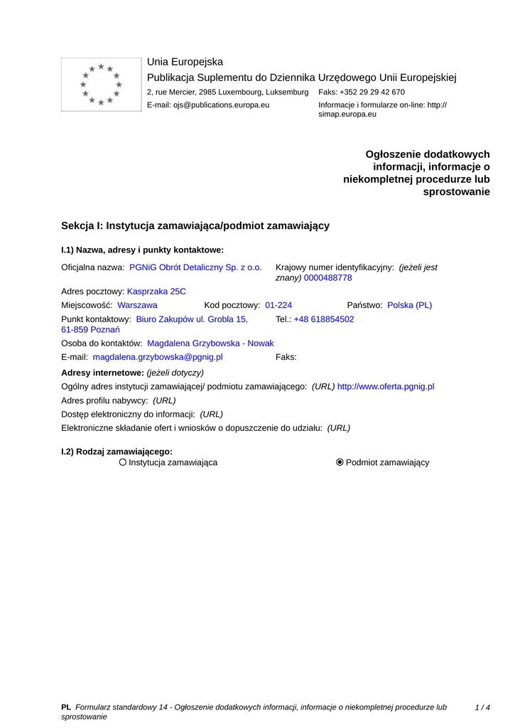 Unia Europejska Publikacja Suplementu do Dziennika Urzędowego Unii Europejskiej 2, rue Mercier, 2985 Luxembourg, Luksemburg Faks: +352 29 29 42 670 E-mail: [email protected] Informacje i formularze on-line: http:// simap.europa.eu Ogłoszenie dodatkowych informacji, informacje o niekompletnej procedurze lub sprostowanie Sekcja I: Instytucja zamawiająca/podmiot zamawiający I.1) Nazwa, adresy i punkty kontaktowe: Oficjalna nazwa: PGNiG Obrót Detaliczny Sp. z o.o. Krajowy numer identyfikacyjny: (jeżeli jest znany) 0000488778 Adres pocztowy: Kasprzaka 25C Miejscowość: Warszawa Kod pocztowy: 01-224 Punkt kontaktowy: Biuro Zakupów ul. Grobla 15, 61-859 Poznań Państwo: Polska (PL) Tel.: +48 618854502 Osoba do kontaktów: Magdalena Grzybowska - Nowak E-mail: [email protected] Faks: _____ Adresy internetowe: (jeżeli dotyczy) Ogólny adres instytucji zamawiającej/ podmiotu zamawiającego: (URL) http://www.oferta.pgnig.pl Adres profilu nabywcy: (URL) _____ Dostęp elektroniczny do informacji: (URL) _____ Elektroniczne składanie ofert i wniosków o dopuszczenie do udziału: (URL) _____ I.2) Rodzaj zamawiającego: Instytucja zamawiająca Podmiot zamawiający PL Formularz standardowy 14 - Ogłoszenie dodatkowych informacji, informacje o niekompletnej procedurze lub sprostowanie 1/4 Sekcja II: Przedmiot zamówienia II.1.1) Nazwa nadana zamówieniu: Zakup usług medycznych dla PGNiG Obrót Detaliczny Sp. z o.o. II.1.2) Krótki opis zamówienia lub zakupu: (podano w pierwotnym ogłoszeniu) Przedmiotem zamówienia jest świadczenie Usług na rzecz Pacjentów, w tym: 1. Świadczenie na rzecz Pacjentów Usług Medycznych, 2. Świadczenie na rzecz Zamawiającego Usług Medycyny Pracy wobec Pracowników lub Kandydatów wskazanych przez Zamawiającego w wystawionych przez niego skierowaniach, 3. Świadczenie na rzecz Pacjentów Usług Stomatologicznych, 4. Wykonywanie innych czynności przewidzianych Umową. Definicje pisane wielką literą znajdują się we wzorze umowy stanowiącym załącznik nr 1 do SIWZ. II.1.3) Wspólny Słownik Zamówień (CPV) Główny przedmiot Dodatkowe przedmioty Słownik główny 85121000 85121200 Słownik uzupełniający (jeżeli dotyczy) PL Formularz standardowy 14 - Ogłoszenie dodatkowych informacji, informacje o niekompletnej procedurze lub sprostowanie 2/4 Sekcja IV: Procedura IV.1)Rodzaj procedury (podano w pierwotnym ogłoszeniu) Otwarta Ograniczona Ograniczona przyspieszona Negocjacyjna Negocjacyjna przyspieszona Dialog konkurencyjny Negocjacyjna z uprzednim ogłoszeniem Negocjacyjna bez uprzedniego ogłoszenia Negocjacyjna z publikacją ogłoszenia o zamówieniu Negocjacyjna bez publikacji ogłoszenia o zamówieniu Udzielenie zamówienia bez uprzedniej publikacji ogłoszenia o zamówieniu w Dzienniku Urzędowym Unii Europejskiej IV.2)Informacje administracyjne IV.2.1)Numer referencyjny: (podano w pierwotnym ogłoszeniu) _____ IV.2.2)Dane referencyjne ogłoszenia w przypadku ogłoszeń przesłanych drogą elektroniczną: Pierwotne ogłoszenie przesłane przez eNotices TED eSender Login: ENOTICES_ECAS_nciszaag Dane referencyjne ogłoszenia: 2015-131028 rok i numer dokumentu IV.2.3)Ogłoszenie, którego dotyczy niniejsza publikacja: Numer ogłoszenia w Dz.U.: 2015/S 193-350676 z dnia: 06/10/2015 (dd/mm/rrrr) IV.2.4)Data wysłania pierwotnego ogłoszenia: 01/10/2015 (dd/mm/rrrr) PL Formularz standardowy 14 - Ogłoszenie dodatkowych informacji, informacje o niekompletnej procedurze lub sprostowanie 3/4 Sekcja VI: Informacje uzupełniające VI.1) Ogłoszenie dotyczy: Procedury niepełnej Sprostowania Informacji dodatkowych VI.2) Informacje na temat niepełnej procedury udzielenia zamówienia: Postępowanie o udzielenie zamówienia zostało przerwane Postępowanie o udzielenie zamówienia uznano za nieskuteczne Zamówienia nie udzielono Zamówienie może być przedmiotem ponownej publikacji VI.3) Informacje do poprawienia lub dodania : VI.3.1) Zmiana oryginalnej informacji podanej przez instytucję zamawiającą Publikacja w witrynie TED niezgodna z oryginalną informacją, przekazaną przez instytucję zamawiającą Oba przypadki VI.3.2) W ogłoszeniu pierwotnym W odpowiedniej dokumentacji przetargowej (więcej informacji w odpowiedniej dokumentacji przetargowej) W obu przypadkach (więcej informacji w odpowiedniej dokumentacji przetargowej) VI.3.3) Tekst, który należy poprawić w pierwotnym ogłoszeniu Miejsce, w którym znajduje się Zamiast: zmieniany tekst: 30.10.2015r. godz. 10.00 IV.3.4) Termin składania ofert lub wniosków o dopuszczenie do udziału w postępowaniu VI.3.4) Daty, które należy poprawić w pierwotnym ogłoszeniu Miejsce, w którym znajdują się Zamiast: zmieniane daty: 30/10/2015 Godzina: 10:00 IV.3.4.) Termin składania ofert lub (dd/mm/rrrr) wniosków o dopuszczenie do udziału w postępowaniu Powinno być: 03.11.2015r. godz. 10.00 Powinno być: 03/11/2015 Godzina: 10:00 (dd/mm/rrrr) VI.3.5) Adresy i punkty kontaktowe, które należy poprawić VI.3.6) Tekst, który należy dodać do pierwotnego ogłoszenia Miejsce, w którym należy dodać tekst: Tekst do dodania: VI.4) Inne dodatkowe informacje: _____ VI.5) Data wysłania niniejszego ogłoszenia: 22/10/2015 (dd/mm/rrrr) - ID:2015-141553 PL Formularz standardowy 14 - Ogłoszenie dodatkowych informacji, informacje o niekompletnej procedurze lub sprostowanie 4/4