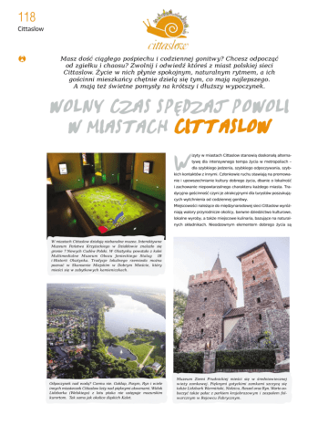 118 Cittaslow Masz doœæ ci¹g³ego poœpiechu i codziennej gonitw y? Chcesz odpocz¹æ od zgie³ku i chaosu? Zwolnij i odw iedŸ któreœ z miast polskiej sieci Cittaslow. ¯ycie w nich p³ynie spokojnym, naturalnym rytmem, a ich goœcinni mieszkañcy chêtnie dziel¹ siê tym, co maj¹ najlepszego. A maj¹ te¿ œw ietne pomys³y na krótszy i d³u¿szy w ypoczynek. ZAJ POWOLI WOLNY CZAS SPÊDZ W MIASTACH CITTASLOW W izyty w miastach Cittaslow stanowi¹ doskona³¹ alternatywê dla intensywnego tempa ¿ycia w metropoliach – dla szybkiego jedzenia, szybkiego odpoczywania, szyb- kich kontaktów z innymi. Cz³onkowie ruchu stawiaj¹ na promowanie i upowszechnianie kultury dobrego ¿ycia, dbanie o lokalnoœæ i zachowanie niepowtarzalnego charakteru ka¿dego miasta. Tradycyjna goœcinnoœæ czyni je atrakcyjnymi dla turystów poszukuj¹cych wytchnienia od codziennej gonitwy. Miejscowoœci nale¿¹ce do miêdzynarodowej sieci Cittaslow wyró¿niaj¹ walory przyrodnicze okolicy, barwne dziedzictwo kulturowe, lokalne wyroby, a tak¿e miejscowe kulinaria, bazuj¹ce na naturalnych sk³adnikach. Nieodzownym elementem dobrego ¿ycia s¹ W miastach Cittaslow dzia³aj¹ niebanalne muzea. Interaktywne Muzeum Pañstwa Krzy¿ackiego w Dzia³dowie znalaz³o siê gronie 7 Nowych Cudów Polski. W Olsztynku powsta³o z kolei Multimedialne Muzeum Obozu Jenieckiego Stalag IB i Historii Olsztynka. Tradycje lokalnego rzemios³a mo¿na poznaæ w Skansenie Miejskim w Dobrym Mieœcie, który mieœci siê w zabytkow ych kamieniczkach. Odpoczynek nad wod¹? Czemu nie. Go³dap, Pasym, Ryn i wiele innych miasteczek Cittaslow le¿y nad piêknymi akwenami. Widok Lidzbarka (Welskiego) z lotu ptaka nie ustêpuje mazurskim kurortom. Tak samo jak okolice œl¹skich Kalet. Muzeum Ziemi Prudnickiej mieœci siê w œredniow iecznej w ie¿y zamkowej. Piêknymi gotyckimi zamkami szczyc¹ siê tak¿e Lidzbark Warmiñski, Nidzica, Reszel oraz Ryn. Warto zobaczyæ tak¿e pa³ac z parkiem krajobrazow ym i zespo³em folwarcznym w Rejowcu Fabrycznym. 119 Cittaslow Szlak kajakow y £yny, czy Pisy Warmiñskiej w okolicach Barczewa przypadn¹ do gustu fanom aktywnego w ypoczynku, tak samo jak oferta Nowego Dworu Gdañskiego. Kilka z miasteczka Cittaslow le¿y na szlaku rowerow ym Green Velo. Warto odw iedziæ przygraniczne Górowo I³aweckie, Bartoszyce oraz Sêpopol. ró¿ne formy rekreacji, której s³u¿¹: parki, œcie¿ki i szlaki rowerowe, przystanie kajakowe i ¿eglarskie, a nawet stoki narciarskie. To wszystko mo¿na znaleŸæ w miastach spod znaku œlimaka. Wiêk- ZIŒ DAWNE PIÊKNO DZ ZREWITALIZOWANE szoœæ z nich le¿y na Warmii i Mazurach, ale idea „miasteczek dba- Cz³onkowie Cittaslow dbaj¹ o przywracanie dawnej œwietnoœci za- j¹cych o lepsz¹ jakoœæ ¿ycia” zakorzeni³a siê tak¿e w Wielkopol- bytkowych budowli i tkanki miejskiej. Zrewitalizowana starówka sce, na Pomorzu, Górnym Œl¹sku, OpolszczyŸnie i LubelszczyŸnie. warmiñskiej Ornety odzyska³a swój oryginalny klimat, podobnie jak stare centrum Barczewa. Znakomicie prezentuj¹ siê zabytkowe kamienice i miejskie place w Biskupcu, Reszlu i Nowym Mieœcie Lubawskim. Per³¹ pogranicza polsko-czeskiego jest Prudnik i jego odnowione zabytki: œredniowieczne wie¿e oraz pa³ac Hermanna Fränkla. Blask odzyskuje równie¿ starówka w Murowanej Goœlinie. W Bisztynku trwaj¹ prace nad rewaloryzacj¹ zabytkowej Bramy Lidzbarskiej. W odnowionych budynkach kipi ¿ycie kulturalne i dzia³aj¹ oryginalne placówki muzealne. W Lidzbarku Warmiñskim w przywróconym do œwietnoœci letnim pa³acu biskupim nazywanym Oran¿eri¹ Krasickiego dzia³a oœrodek kultury. Nowoczesna ekspozycja przyci¹ga do otwartego w Dzia³dowie Interaktywnego Muzeum Pañstwa Krzy¿ackiego, uznanego za jeden z 7 Nowych Cudów Polski. W Olsztynku trudny okres II wojny œwiatowej ukazuje Multimedialne Muzeum Obozu Jenieckiego Stalag IB i Historii Olsztynka. Tradycje lokalnego rzemios³a przybli¿a Skansen Miejski w Dobrym Mieœcie. Muzea i inne instytucje kultury od lat dzia³aj¹ równie¿ w murach gotyckich zamków: w Reszlu, Lidzbarku Warmiñskim i Nidzicy. Zwiedzaæ mo¿na tak¿e zamek w Rynie. AKTYWNY RELAKS I WYPOCZYNEK WE W³ASNYM TEMPIE Po zakosztowaniu strawy kulturalnej i historycznej warto skorzystaæ równie¿ z propozycji aktywnej rekreacji. W uzdrowiskowej Odnow ione ryneczki z ratuszami i zadbana dawna zabudowa to w yró¿nik miasteczek Cittaslow. Ornecka starówka przyci¹ga sw ym klimatem. Piêknie prezentuj¹ siê tak¿e budynki i place w Biskupcu, Murowanej Goœlinie w Wielkopolsce oraz Now ym Mieœcie Lubawskim. Go³dapi powsta³y Mazurskie Tê¿nie Solankowe (o d³ugoœci 120 Cittaslow Kalendarz wydarzeñ na Warmii i Mazurach 220 i wysokoœci 8 m) oraz Pijalnia Wód Mi- 3-5.06 – Miêdzynarodowe Dni Regionu Bartoszyce 2016 2-4.06 – Miêdzynarodowy Festiwal Muzyki Chóralnej im. Feliksa Nowowiejskiego w Barczewie neralnych i Leczniczych. Lidzbark Warmiñski wzbogaci³ siê o kompleks wodny Termy Warmiñskie. ¯eglowaæ i na inne sposoby korzystaæ z bliskoœci zbiorników 23-26.06 – Festiwal Fantastyki, Nidzica wodnych mo¿na nie tylko w Rynie, który 25.06 – Letnie Koncerty Artystyczne, wystêp Jaros³awa Chojnackiego, Bisztynek le¿y na Szlaku Wielkich Jezior Mazurskich, ale tak¿e w mazurskim Pasymiu, 25-26.06 – Noc Œwiêtojañska w Sêpopolu a nawet w œl¹skich Kaletach. 25-26.06 – Dni Nowego Miasta Lubawskiego Bogato prezentuje siê oferta sp³ywów kaja- 26.06 – Turniej Miast Kopernikañskich i Partnerskich, Lidzbark Warmiñski kowych. £yn¹ mo¿na przep³yn¹æ przez Do- 2.07 – Eko³omyja – Festiwal Kultury Ukraiñskiej, Górowo I³aweckie i Sêpopol, gdzie do tej rzeki wpada Guber, 2-3.07 – Triathlon Energy, Lidzbark (Welski) równie¿ bêd¹cy atrakcyjnym szlakiem kaja- 9.07 – Reszelski Dzieñ Czarownicy kowym. Malowniczymi dop³ywami górnego 21-22.07 – Wschód Piêkna World Orchestra Festiwal II, Olsztynek 7.08 – Festiwal Pogr