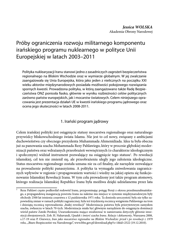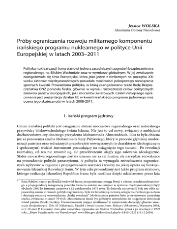 Jessica WOLSKA Akademia Obrony Narodowej Próby ograniczenia rozwoju militarnego komponentu irańskiego programu nuklearnego w polityce Unii Europejskiej w latach 2003–2011 Polityka nuklearyzacji Iranu stanowi jedno z zasadniczych zagrożeń bezpieczeństwa regionalnego na Bliskim Wschodzie oraz w wymiarze globalnym. W jej zwalczanie zaangażowała się Unia Europejska, która jako jeden z nielicznych na początku XXI wieku aktorów międzynarodowych posiadała możliwości pokojowego rozwiązania spornych kwestii. Prowadzona polityka, w którą zaangażowano także Radę Bezpieczeństwa ONZ poniosła fiasko, głównie w wyniku rozbieżności celów politycznych zarówno państw europejskich, jak i mocarstw światowych. Celem niniejszego opracowania jest prezentacja działań UE w kwestii irańskiego programu jądrowego oraz ocena jego skuteczności w latach 2008-2011. 1. Irański program jądrowy Celem irańskiej polityki jest osiągnięcie statusy mocarstwa regionalnego oraz naturalnego przywódcy bliskowschodniego świata Islamu. Nie jest to cel nowy, związany z ambicjami duchowieństwa czy obecnego prezydenta Muhammada Ahmenidżada. Idea ta była obecna już za panowania szacha Mohammada Rezy Pahlawiego, który w procesie głębokiej modernizacji państwa oraz wdrażanych przeobrażeń wewnętrznych (o charakterze ideologicznym i społecznym) widział instrument pozwalający na osiągnięcie tego statusu1. Po rewolucji islamskiej, cel ten nie zmienił się, ale przeobrażeniu uległy jego założenia ideologiczne. Status mocarstwa regionalnego została uznana nie za cel finalny, ale narzędzie zezwalające na prowadzenie polityki panaszyizmu. A polityka ta wymagała zniwelowania zagranicznych wpływów w regionie i propagowaniem wartości i wiedzy na jakiej opiera się funkcjonowanie Islamskiej Rewolucji Iranu. W tym celu prowadzony jest także program atomowy, którego realizacja Islamskiej Republice Iranu była możliwa dzięki udzielanemu przez lata 1 Reza Pahlawi często podkreślał rodowód Iranu, przypominając potęgę Persji z okresu przedmuzułmańskiego, a propagandową inauguracją powrotu Iranu na należne mu miejsce w systemie międzynarodowym były obchody 2500 lat istnienia cesarstwa z 12 października 1971 roku. Ta doniosła uroczystość była nie tylko zapowiedzią zmian w ramach polityki zagranicznej, była też trzydziestą rocznicą wstąpienia Pahlawiego na tron i dziesiątą rocznicą wprowadzenia „białej rewolucji” Modernizacja państwa była priorytetowym zamysłem szacha, zwłaszcza w latach 70-tych. Modernizacja miała być głównym narzędziem do osiągnięcia dominacji wśród państw Zatoki Perskiej. Uwarunkowania mające zrealizować te zamierzania dotyczyły głównie inwestycji zbrojeniowych. Zob. H. Nahavandi, Upadek i śmierć szacha Iranu. Relacje i dokumenty, Warszawa 2008, s.17-19 oraz P. Osiewicz, Iran jako mocarstwo regionalne na Bliskim Wschodzie: przed i po rewolucji z 1979 roku, „Biuro Bezpieczeńst-wa Narodowego”, www.bbn.gov.pl/download.php?s=1&id=2522 (19.12.2010). DEBIUTY NAUKOWE 243 Pahlawiemu wsparciu politycznemu i technologicznemu Stanów Zjednoczonych. Prowadzony od 1955 roku do upadku szacha program Atom dla Pokoju pozwolił na zbudowanie potencjału intelektualnego oraz technologicznego, zezwalającego na prowadzenie badań, a następnie programu jądrowego2. Szansę tę dostrzegł, początkowo sceptyczny wobec programu jądrowgo Pahlawiego duchowy przywódca Iranu i jego faktyczny przywódca po rewolucji 1979 roku Ajatollah Ruhollah Chomeini. W połowie lat 80 XX wieku prezydent Ali Akbar Haszemiego Rafsandżani, z pewnością za zgodą Chomeiniego, podjął próbę odbudowy współpracy w sektorze nuklearnym z USA. Po odrzuceniu tej oferty przez administrację Ronalda Reagana władzom irańskim udało się zbudować konsorcjum argentyńskich, hiszpańskich i niemieckich firm, które zobowiązało się do przekazania sprzętu służącego do wzbogacania uranu. Na wskutek amerykańskich nacisków konsorcjum wycofało się z transakcji, jednak Teheran uzyskał pomoc od władz Chin, Rosji i Pakistanu3. Wiodącą rolę w rozwoju irańskiego programu jądrowego w latach 80 XX wieku odgrywały Chiny, które przekazały reaktory badawcze do powstałego w 1984 roku Centrum Technologii Jądrowej (ENTC) w Isfahanie4. Natomiast rosyjskie zaangażowanie we wsparcie irańskiego programu jądrowego, pomimo iż stosowne porozumienie zawarto w 1987 roku, nastąpiło dopiero po roku 1993.Opóźnienie to wynikało z problemów wewnętrznych wynikających z rozpadu ZSRR, a nie niechęci do jej realizacji. Natychmiast po ostatecznym ukształtowaniu się sytuacji wewnętrznej w Rosji podpisano umowę na budowę reaktora jądrowego w Buszirze o wartości 800 milionów dolarów5. W konsekwencji wdrażanego od 1984 roku programu jądrowego Iran posiada kilka ośrodków wykorzystywania technologii jądrowej, z których najnowocześniejsze są zbudowane w 2000 roku w Lashakar Ab’add instalacje do laserowego wzbogacania uranu, reaktor badawczy w Arak6 oraz odkryta w 2002 roku tajna instalacja jądrową w Natanz7. 2 3 4 5 6 7 Oficjalnie został on wdrażany w 1957 roku, a uwieńczeniem amerykańsko-irańskiej współpracy było wybudowanie Centrum Badań Jądrowych w Teheranie (TNRC). Oficjalnie zostało ono otwarte w 1967 roku jako reaktor badawczy, posiadający również zakład produkcji radioizotopów, laboratorium chemiczne i zakład utylizacji odpadów. Zob. Y. Melman, M. Javedanfar, Nuklearny Sfinks. Iran Mahmuda Ahmadineżada, Warszawa 2008 r., s. 93. Zakres współpracy z Pakistanem określała umowa zawarta w 1987 roku, która przewidywała wyszkolenie inżynierów irańskich w Instytucie Nauki i Technologii Jądrowej w Islamabadzie oraz studentów z zakresu technologii wirówek. Po tej decyzji obydwa państwa podpisały porozumienie o szkoleniu personelu i zapewnieniu technologii oraz sprzętu nuklearnego. Na tej podstawie w latac