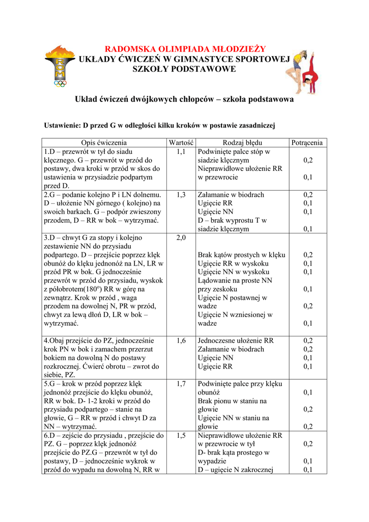 RADOMSKA OLIMPIADA MŁODZIEŻY UKŁADY ĆWICZEŃ W GIMNASTYCE SPORTOWEJ SZKOŁY PODSTAWOWE Układ ćwiczeń dwójkowych chłopców – szkoła podstawowa Ustawienie: D przed G w odległości kilku kroków w postawie zasadniczej Opis ćwiczenia 1.D – przewrót w tył do siadu klęcznego. G – przewrót w przód do postawy, dwa kroki w przód w skos do ustawienia w przysiadzie podpartym przed D. 2.G – podanie kolejno P i LN dolnemu. D – ułożenie NN górnego ( kolejno) na swoich barkach. G – podpór zwieszony przodem, D – RR w bok – wytrzymać. Wartość Rodzaj błędu 1,1 Podwinięte palce stóp w siadzie klęcznym Nieprawidłowe ułożenie RR w przewrocie 1,3 0,2 0,1 Załamanie w biodrach Ugięcie RR Ugięcie NN D – brak wyprostu T w siadzie klęcznym 0,2 0,1 0,1 Brak kątów prostych w klęku Ugięcie RR w wyskoku Ugięcie NN w wyskoku Lądowanie na proste NN przy zeskoku Ugięcie N postawnej w wadze Ugięcie N wzniesionej w wadze 0,2 0,1 0,1 0,2 0,2 0,1 0,1 3.D – chwyt G za stopy i kolejno zestawienie NN do przysiadu podpartego. D – przejście poprzez klęk obunóż do klęku jednonóż na LN, LR w przód PR w bok. G jednocześnie przewrót w przód do przysiadu, wyskok z półobrotem(180o) RR w górę na zewnątrz. Krok w przód , waga przodem na dowolnej N, PR w przód, chwyt za lewą dłoń D, LR w bok – wytrzymać. 2,0 4.Obaj przejście do PZ, jednocześnie krok PN w bok i zamachem przerzut bokiem na dowolną N do postawy rozkrocznej. Ćwierć obrotu – zwrot do siebie, PZ. 5.G – krok w przód poprzez klęk jednonóż przejście do klęku obunóż, RR w bok. D- 1-2 kroki w przód do przysiadu podpartego – stanie na głowie, G – RR w przód i chwyt D za NN – wytrzymać. 6.D – zejście do przysiadu , przejście do PZ. G – poprzez klęk jednonóż przejście do PZ.G – przewrót w tył do postawy, D – jednocześnie wykrok w przód do wypadu na dowolną N, RR w 1,6 Jednoczesne ułożenie RR Załamanie w biodrach Ugięcie NN Ugięcie RR 1,7 Podwinięte palce przy klęku obunóż Brak pionu w staniu na głowie Ugięcie NN w staniu na głowie Nieprawidłowe ułożenie RR w przewrocie w tył D- brak kąta prostego w wypadzie D – ugięcie N zakrocznej 1,5 Potrącenia 0,1 0,1 0,2 0,1 0,1 0,2 0,2 0,2 0,1 0,1 przód. G – po dojściu do D – stanie na RR, dolny chwyt G za NN- wytrzymać. 7.D i G zejście do PZ. G – załamanie w biodrach w staniu na RR G – ugięcie NN G – ugięcie RR 0,1 0,1 0,1 0,3 9,5 Wykaz skrótów: G – górna D - dolna PZ – postawa zasadnicza T – tułów L,P – lewa, prawa NN – nogi RR – ręce Uwagi: Ćwiczenia powinny być wykonywane ściśle wg opisu, płynnie, obszernie i estetycznie. Pozycje statyczne ( np. waga, mostek itp.) powinny być wytrzymane 3 sekundy. Za mistrzowskie wykonanie ćwiczeń można uzyskać dodatkową premię + 0,5 pkt. W całym układzie za błędy postawy: NN, RR, stóp, tułowia i głowy – potrącenia po 0,1 pkt. Za brak wytrzymania – potrącenie – 0,3 pkt. Za brak zaznaczenia oraz brak cechy – potrącenia po 0,1 pkt. Za brak wytrzymania piramidy – potrącenie – 0,3 pkt. Za niejednoczesne wykonywanie tych samych elementów – potrącenie – 0,1 pkt. Dopuszcza się możliwość powtórzenia 1 ćwiczenia w układzie – potrącenie – 0,3 pkt. Układ ćwiczeń dwójkowych dziewcząt – szkoła podstawowa Ustawienie: w postawie zasadniczej, przodem do siebie w odległości kilku kroków Opis ćwiczenia Wartość Rodzaj błędu Potrącenia 1.G i D jednocześnie zamachem przerzut 1,5 Jednoczesne ułożenie RR 0,2 bokiem na dowolną N do postawy Załamanie w biodrach 0,2 rozkrocznej, RR w bok. Ćwierć obrotu – Ugięcie NN 0,1 twarzami do siebie, PZ. 2.D- wypad na dowolną N, RR w przód. 1,5 Brak kąta prostego między G – stanie na RR. Dolna chwyt górnej za udem a podudziem w biodra lub NN – wytrzymać 3 sek. wypadzie 0,1 Ugięcie N w wypadzie 0,1 Zbyt duże wygięcie T w staniu na RR 0,1-0,3 o 3.G – zejście do wypadu na dowolną N, 0,5 Brak kąta 90 między udem obie RR w górę- zaznaczyć. a podudziem w wypadzie 0,1 Ugięcie N w wypadzie 0,1 4.Obie przez przeniesienie ciężaru ciała 0,6 Brak zaznaczenia postawy na N wykroczną i jej wyprost przejście zakrocznej 0,1 do postawy zakrocznej, RR w bok. Przejście do PZ. 5.D – przewrót w tył do przysiadu podpartego, G – jednocześnie przewrót w przód do przysiadu podpartego. Obie przejście do leżenia tyłem. 6.G i D ugięcie NN i RR, postawienie ich na podłożu, przejście do podporu łukiem leżąc tyłem(mostek) o NN złączonych – wytrzymać 3 sek. 7.Obie powrót do leżenia tyłem. G – RR w górę, poprzez uwypuklenie klatki piersiowej przejście do siadu skulonego, następnie do siadu rozkrocznego, jedno ramię w przód, drugie ramię w bok. D – przez kolejne ugięcie i postawienie NN przejście do postawy. Jedno ramię w bok, drugie w przód, chwyt za dłoń G- waga przodem na dowolnej N – wytrzymać . 8.Obie RR w przód chwyt oburącz. DPZ , G- przejście do siadu ugiętego i przy pomocy D przejście do PZ z chwytem za dłonie. 9.D – pół obrotu (180o) w prawo z krokiem PN w przód, dostawienie LN do PZ , RR w górę. G – to samo w drugą stronę. Obie jednoczesny skłon T w tyłwytrzymać 3 sek. 10.Obie powrót do PZ i pół obrotu (90o) w kierunku sędziów. 1,0 1,0 1,5 Złe ułożenie dłoni Oderwanie RR w przysiadzie Brak przeniesienia ciężaru ciała na RR Ugięcie NN Ugięcie RR Brak uwypuklenia klatki piersiowej Brak wyprostu T Błędy w wadze: Brak pionu N postawnej Ugięcie N postawnej Ugięcie N wzniesionej 0,1 0,1 0,1` 0,1 0,1 0,1 0,1 0,1 0,2 0,1 0,5 Brak płynności 0,2 1,0 Załamanie w biodrach 0,2 0,4 Załamanie w biodrach przy przejściu do PZ 0,1 9,5 Wykaz skrótów: G – górna D - dolna PZ – postawa zasadnicza T – tułów L,P – lewa, prawa NN – nogi RR – ręce Uwagi: Ćwiczenia powinny być wykonywane ściśle wg opisu, płynnie, obszernie i estetycznie. P
