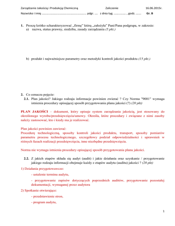 Zarządzanie Jakością i Produkcją Chemiczną Zaliczenie Nazwisko i imię …………………………………………………… pdgr. …. z dnia tyg. ……………. , godz. ……. 16.06.2015r. Gr. B 1. Proszę krótko scharakteryzować „firmę” którą „założyła” Pani/Pana podgrupa, w zakresie: a) nazwa, status prawny, siedziba, zasady zarządzania (5 pkt.) b) produkt i najważniejsze parametry oraz metodyki kontroli jakości produktu (15 pkt.) 2. Co oznacza pojęcie: 2.1. Plan jakości? Jakiego rodzaju informacje powinien zwierać ? Czy Norma "9001" wymaga istnienia procedury opisującej sposób przygotowania planu jakości (?) (20 pkt) PLAN JAKOŚCI – dokument, który opisuje system zarządzania jakością, jest stosowany do określonego wyrobu/przedsięwzięcia/umowy. Określa, które procedury i związane z nimi zasoby należy zastosować, kto i kiedy ma je realizować. Plan jakości powinien zawierać: Procedurę technologiczną, sposoby kontroli jakości produktu, transport, sposoby pomiarów parametru procesu technologicznego, szczegółowy podział odpowiedzialności i uprawnień w różnych fazach realizacji przedsięwzięcia, inne niezbędne przedsięwzięcia. Norma nie wymaga istnienia procedury opisującej sposób przygotowania planu jakości. 2.2. Z jakich etapów składa się audyt (audit) i jakie działania oraz uzyskanie / przygotowanie jakiego rodzaju informacji obejmuje każdy z etapów audytu (auditu) jakości ? (20 pkt) 1) Działania przygotowawcze: - ustalenie terminu audytu, - przygotowanie zapisów dotyczących poprzednich auditów, przygotowanie pozostałej dokumentacji, wymaganej przez audytora 2) Spotkanie otwierające: - przedstawienie stron, - program audytu, 1 Zarządzanie Jakością i Produkcją Chemiczną Zaliczenie Nazwisko i imię …………………………………………………… pdgr. …. z dnia tyg. ……………. , godz. ……. 16.06.2015r. Gr. B - omówienie wyników poprzedniego audytu (w tym sprawdzenie dokonania realizacji działań korygujących i zapobiegawczych 3) Badanie auditowe: zebranie obiektywnych i niepodważalnych dowodów o ewentualnych niezgodnościach/spostrzeżeniach (w tym rozmowy z pracownikami, dokumentacja, obserwacje) 4) Spotkanie zamykające: - omówienie wyników audytu, - ustalenie terminu dostarczenia raportu, 5) Raport z audytu (przygotowuje audytor wiodący) musi zawierać: odwołanie do normy, niezgodność/spostrzeżenie, dowód 6) Działania postauditowe: -działania korygujące (jakie działania, kto jest odpowiedzialny, kiedy zostaną wykonane, sprawdzenie) - działania zapobiegawcze 3. Proszę wymienić wymagania jakie powinna spełniać, grupy informacji, jakie powinna zawierać Polityka Jakości Systemu Zarządzania Jakością w/g Normy PN-EN-ISO 9001 : 2009 (10 pkt) PJ powinna zawierać: Cele firmy, środki oraz sposoby realizacji założonych celów, Numery norm wg których ma miejsce ta polityka jakości. Zobowiązania do spełnienia wszystkich wymagań klienta oraz wymagań normy jakości i zapewnienia ciągłego doskonalenia PJ musi być podpisana przez przedstawiciela najwyższego kierownictwa Musi być zakomunikowana, i zrozumiała dla wszystkich pracowników i systematycznie przeglądana, Dla normy 14001 – odwołanie do norm prawnych 4. Proszę uzupełnić pytanie (jeśli dotyczy .................. ), zaznaczyć poprawną odpowiedź / poprawne odpowiedzi w poniższych pytaniach "wielokrotnego wyboru", dotyczących Systemów Zarządzania Jakością (po do 5 pkt. za poprawne odpowiedzi) 4.1. Wymaganie "nadzór nad dokumentacją jakości", tzn., nad polityką jakości, księgą jakości, procedurami i instrukcjami oznacza m.in. : a. potrzebę archiwizacji nieaktualnych już dokumentów jakości, a także wszystkich zapisów, tzn., dokumentów, które dostarczają obiektywnych dowodów z wykonywanych czynności/zadań i przechowywania tego wszystkiego przez określony okres czasu 2 Zarządzanie Jakością i Produkcją Chemiczną Zaliczenie Nazwisko i imię …………………………………………………… pdgr. …. z dnia tyg. ……………. , godz. ……. 16.06.2015r. Gr. B b. potrzebę uaktualniania co określony, przyjęty okres czasu, wszystkich dokumentów Systemu Jakości c. potrzebę istnienia bezpośredniego dostępu / dostępu przez sieć komputerową w każdym miejscu pracy do zawsze aktualnych, wszystkich procedur i instrukcji Systemu Jakości d. potrzebę istnienia bezpośredniego dostępu / dostępu przez sieć komputerową w określonym miejscu pracy do zawsze aktualnych dokumentów jakości tam wykorzystywanych 4.2. Proces "kwalifikowania dostawcy" polega na : a. uzyskaniu informacji o zdolności "dostawcy" do spełniania naszych wymagań oraz o poziomie solidności "dostawcy" b. zbadaniu we własnym zakresie parametrów jakości wyrobu / produktu, który dostarczył "dostawca" i dokonaniu zapisu o spełnieniu przez dostawcę naszych wymagań c. systematycznym badaniu zgodności parametrów dostarczonych przez "dostawcę" wyrobów / produktów z naszymi wymaganiami, opisanymi umową oraz systematyczne prowadzenie zapisów zawierających ocenę danego dostawcy d. jak wyżej, ale bez systematycznego prowadzenia zapisów zawierających ocenę dostawcy 4.3. Poziom zadowolenia klienta można mierzyć za pomocą: a. Analizy reklamacji, a także pozytywnych opinii klientów b. Ankiet „konsumenckich” c. Wykorzystania metod statystyki w opracowaniu wyników tzw. „badań rynku” d. Każda z powyższych metod może być wykorzystywana, a jeśli celowe, to także, wykorzystanie innych "narzędzi" 4.4. Wymagania dotyczące "zarządzania zasobami", które to pojęcie oznacza koordynowanie, planowanie, wydawanie decyzji oraz określenie i zapewnienie niezbędnych do utrzymywania systemu zarządzania środków, do których zaliczane są zasoby ludzkie, infrastruktura oraz środowisko pracy w Normie PN-EN ISO 9001:2009, zostały ujęte w punktach i 