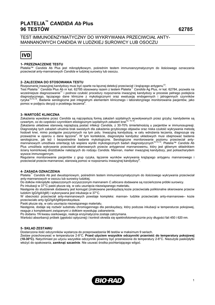 PLATELIA™ CANDIDA Ab Plus 96 TESTÓW 62785 TEST IMMUNOENZYMATYCZNY DO WYKRYWANIA PRZECIWCIAŁ ANTYMANNANOWYCH CANDIDA W LUDZKIEJ SUROWICY LUB OSOCZU 1- PRZEZNACZENIE TESTU Platelia™ Candida Ab Plus jest mikropłytkowym, pośrednim testem immunoenzymatycznym do ilościowego oznaczania przeciwciał anty-mannanowych Candida w ludzkiej surowicy lub osoczu. 2- ZALECENIA DO STOSOWANIA TESTU Rozpoznanie inwazyjnej kandydozy musi być oparte na łącznej detekcji przeciwciał i krążącego antygenu13. Test Platelia™ Candida Plus Ab nr kat. 62785 stosowany razem z testem Platelia™ Candida Ag Plus, nr kat. 62784, pozwala na wcześniejsze diagnozowanie11 i podnosi czułość procedury rozpoznania inwazyjnej kandydozy w procesie pełnego podejścia diagnostycznego, łączącego dane kliniczne z mykologicznymi oraz ewaluację endogennych i jatrogennych czynników ryzyka10,13,14. Badanie serologiczne jest integralnym elementem klinicznego i laboratoryjnego monitorowania pacjentów, jako pomoc w podjęciu decyzji o przebiegu leczenia8. 3- WARTOŚĆ KLINICZNA Zakażenia wywołane przez Candida są najczęstszą formą zakażeń szpitalnych wywoływanych przez grzyby; kandydemie są czwartym, co do częstości czynnikiem etiologicznym szpitalnych zakażeń krwi12, 15,16. Zakażenia układowe stanowią najcięższą postać infekcji Candida, z 30-70% śmiertelnością u pacjentów w immunosupresji. Diagnostykę tych zakażeń utrudnia brak swoistych dla zakażenia grzybiczego objawów oraz niska czułość wykrywania metodą hodowli krwi, mimo postępów poczynionych na tym polu. Inwazyjną kandydozę, w celu wdrożenia leczenia, diagnozuje się przeważnie w oparciu o dane łączone2. W tym kontekście, diagnostyka kandydoz układowych musi obejmować badania serologiczne, jak też i bezpośrednie badanie mykologiczne. Serologiczne monitorowanie poziomu przeciwciał antymannanowych umożliwia orientację lub wspiera wyniki mykologicznych badań diagnostycznych10,13,14. Platelia™ Candida Ab Plus umożliwia wykrywanie przeciwciał skierowanych przeciw antygenowi mannanowemu, który jest głównym składnikiem ściany komórkowej drożdżaków należących do rodzaju Candida. Mannan, marker inwazyjnej kandydozy, jest polisacharydem wysoce immunogennym. Regularne monitorowanie pacjentów z grup ryzyka, łączenie wyników wykrywania krążącego antygenu mannanowego i przeciwciał przeciw-mannanowi, stanowią pomoc w rozpoznaniu inwazyjnej kandydozy9. 4- ZASADA OZNACZENIA Platelia™ Candida Ab jest dwustopniowym, pośrednim testem immunoenzymatycznym do ilościowego wykrywania przeciwciał anty-mannanowych w osoczu lub surowicy ludzkiej. Do dołków mikropłytki opłaszczonych oczyszczonym mannanem C.albicans dodawane są rozcieńczone próbki surowicy. Po inkubacji w 37°C paski płucze się, w celu usunięcia niezwiązanego materiału. Następnie do studzienek dodawany jest koniugat (znakowane peroksydazą kozie przeciwciała poliklonalne skierowane przeciw ludzkim IgG/IgA/IgM) i wykonywana jest inkubacja w 37°C. W obecności przeciwciał anty-mannanowych powstaje kompleks: mannan- ludzkie przeciwciało anty-mannanowe– kozie przeciwciało anty-IgG/IgA/IgM/peroksydaza. Paski płucze się, w celu usunięcia niezwiązanego materiału. Następnie, dodaje się roztwór substratu chromogennego dla peroksydazy, który podczas inkubacji w temperaturze pokojowej, reaguje z kompleksami związanymi z dołkiem wywołując zabarwienie. Po dodaniu 1N kwasu siarkowego, reakcja enzymatyczna zostaje zatrzymana. Wartości absorbancji próbek (gęstości optycznej) i kontroli określa się spektrofotometrycznie przy długości fali 450 i 620 nm. 5- SKŁAD ZESTAWU Dostarczona ilość odczynników wystarcza do przeprowadzenia 96 testów w maksimum 9 seriach. Zestaw przechowywać w temperaturze 2-8°C. Przed użyciem wszystkie odczynniki przenieść do temperatury pokojowej (18-30°C). Natychmiast po użyciu wszystkie odczynniki powinny być przeniesione do temperatury 2-8°C. Niezużyte paski/płytki włożyć do opakowania, zamknąć szczelnie. Nie usuwać środka pochłaniającego wilgoć. 1 Składnik R1 Microplate R2 Concentrated Washing Solution (20x) R3 Calibrator 0 R4a Calibrator 5 R4b Calibrator 10 R4c Calibrator 20 R4d Calibrator 80 R6 Conjugate R7a Sample Diluent 1 R7b Sample Diluent 2 R9 Chromogen TMB R10 Stopping Solution Zawartość Mikropłytka 96 dołków (12 pasków z 8 dołkami każdy) opłaszczonych oczyszczonym antygenem mannanowym C.albicans Stężony bufor do płukania (20x) - bufor Tris NaCl (pH 7.4) - 2% Tween® 20 - konserwant: < 1.5% ProClin™ 300 Kalibrator 0 AU/ml (gotowy do użycia): - Bufor Tris_NaCl - konserwant: metyloizotiazolon (MI) 0.02%, bromonitrodioksan 0.02%, < 1.5% ProClin™ 300 Kalibrator 5 AU/ml (gotowy do użycia): - Bufor Tris_NaCl - Surowica ludzka zawierająca przeciwciała anty-mannanowe - konserwant: metyloizotiazolon (MI) 0.02%, bromonitrodioksan 0.02%, < 1.5% ProClin™ 300 Kalibrator 10 AU/ml (gotowy do użycia): - Bufor Tris_NaCl - Surowica ludzka zawierająca przeciwciała anty-mannanowe - konserwant: metyloizotiazolon (MI) 0.02%, bromonitrodioksan 0.02%, < 1.5% ProClin™ 300 Kalibrator 20 AU/ml (gotowy do użycia): - Bufor Tris_NaCl - Surowica ludzka zawierająca przeciwciała anty-mannanowe - konserwant: metyloizotiazolon (MI) 0.02%, bromonitrodioksan 0.02%, < 1.5% ProClin™ 300 Kalibrator 80 AU/ml (gotowy do użycia): - Bufor Tris_NaCl - Surowica ludzka zawierająca przeciwciała anty-mannanowe - konserwant: metyloizotiazolon (MI) 0.02%, bromonitrodioksan 0.02%, < 1.5% ProClin™ 300 Koniugat (gotowy do użycia) - antyludzkie, poliklonalne przeciwciała kozie anty-total Ig znakowane peroksydazą. - Zieleń malachitowa - konserwant: < 1.5% ProClin™ 300 Roztwór do rozcieńczania próbek 2 (gotowy do użycia) - Bufor Tris_NaCl - 0.1% Tween®20 - Czerwień fenolowa - Konserwant: < 1.5% ProClin™ 300 Roztwór do rozcieńczania próbek 2 (gotowy do użycia)