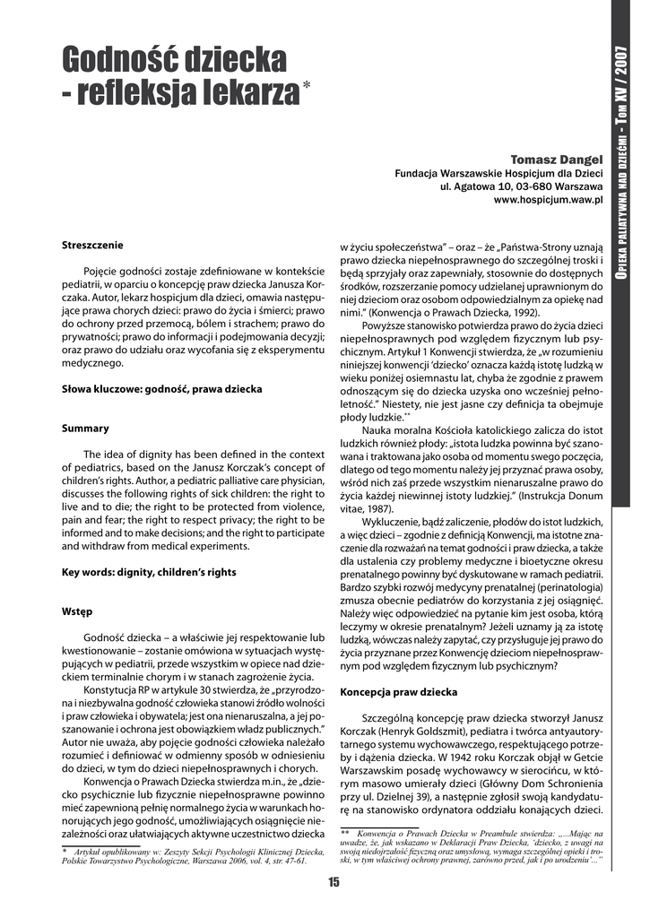 Tomasz Dangel Fundacja Warszawskie Hospicjum dla Dzieci ul. Agatowa 10, 03-680 Warszawa www.hospicjum.waw.pl Streszczenie w życiu społeczeństwa” – oraz – że „Państwa-Strony uznają prawo dziecka niepełnosprawnego do szczególnej troski i będą sprzyjały oraz zapewniały, stosownie do dostępnych środków, rozszerzanie pomocy udzielanej uprawnionym do niej dzieciom oraz osobom odpowiedzialnym za opiekę nad nimi.” (Konwencja o Prawach Dziecka, 1992). Powyższe stanowisko potwierdza prawo do życia dzieci niepełnosprawnych pod względem fizycznym lub psychicznym. Artykuł 1 Konwencji stwierdza, że „w rozumieniu niniejszej konwencji ‘dziecko’ oznacza każdą istotę ludzką w wieku poniżej osiemnastu lat, chyba że zgodnie z prawem odnoszącym się do dziecka uzyska ono wcześniej pełnoletność.” Niestety, nie jest jasne czy definicja ta obejmuje płody ludzkie.** Nauka moralna Kościoła katolickiego zalicza do istot ludzkich również płody: „istota ludzka powinna być szanowana i traktowana jako osoba od momentu swego poczęcia, dlatego od tego momentu należy jej przyznać prawa osoby, wśród nich zaś przede wszystkim nienaruszalne prawo do życia każdej niewinnej istoty ludzkiej.” (Instrukcja Donum vitae, 1987). Wykluczenie, bądź zaliczenie, płodów do istot ludzkich, a więc dzieci – zgodnie z definicją Konwencji, ma istotne znaczenie dla rozważań na temat godności i praw dziecka, a także dla ustalenia czy problemy medyczne i bioetyczne okresu prenatalnego powinny być dyskutowane w ramach pediatrii. Bardzo szybki rozwój medycyny prenatalnej (perinatologia) zmusza obecnie pediatrów do korzystania z jej osiągnięć. Należy więc odpowiedzieć na pytanie kim jest osoba, którą leczymy w okresie prenatalnym? Jeżeli uznamy ją za istotę ludzką, wówczas należy zapytać, czy przysługuje jej prawo do życia przyznane przez Konwencję dzieciom niepełnosprawnym pod względem fizycznym lub psychicznym? Pojęcie godności zostaje zdefiniowane w kontekście pediatrii, w oparciu o koncepcję praw dziecka Janusza Korczaka. Autor, lekarz hospicjum dla dzieci, omawia następujące prawa chorych dzieci: prawo do życia i śmierci; prawo do ochrony przed przemocą, bólem i strachem; prawo do prywatności; prawo do informacji i podejmowania decyzji; oraz prawo do udziału oraz wycofania się z eksperymentu medycznego. Słowa kluczowe: godność, prawa dziecka Summary The idea of dignity has been defined in the context of pediatrics, based on the Janusz Korczak’s concept of children’s rights. Author, a pediatric palliative care physician, discusses the following rights of sick children: the right to live and to die; the right to be protected from violence, pain and fear; the right to respect privacy; the right to be informed and to make decisions; and the right to participate and withdraw from medical experiments. Key words: dignity, children’s rights Wstęp Godność dziecka – a właściwie jej respektowanie lub kwestionowanie – zostanie omówiona w sytuacjach występujących w pediatrii, przede wszystkim w opiece nad dzieckiem terminalnie chorym i w stanach zagrożenie życia. Konstytucja RP w artykule 30 stwierdza, że „przyrodzona i niezbywalna godność człowieka stanowi źródło wolności i praw człowieka i obywatela; jest ona nienaruszalna, a jej poszanowanie i ochrona jest obowiązkiem władz publicznych.” Autor nie uważa, aby pojęcie godności człowieka należało rozumieć i definiować w odmienny sposób w odniesieniu do dzieci, w tym do dzieci niepełnosprawnych i chorych. Konwencja o Prawach Dziecka stwierdza m.in., że „dziecko psychicznie lub fizycznie niepełnosprawne powinno mieć zapewnioną pełnię normalnego życia w warunkach honorujących jego godność, umożliwiających osiągnięcie niezależności oraz ułatwiających aktywne uczestnictwo dziecka Koncepcja praw dziecka Szczególną koncepcję praw dziecka stworzył Janusz Korczak (Henryk Goldszmit), pediatra i twórca antyautorytarnego systemu wychowawczego, respektującego potrzeby i dążenia dziecka. W 1942 roku Korczak objął w Getcie Warszawskim posadę wychowawcy w sierocińcu, w którym masowo umierały dzieci (Główny Dom Schronienia przy ul. Dzielnej 39), a następnie zgłosił swoją kandydaturę na stanowisko ordynatora oddziału konających dzieci. ** Konwencja o Prawach Dziecka w Preambule stwierdza: „...Mając na uwadze, że, jak wskazano w Deklaracji Praw Dziecka, ‘dziecko, z uwagi na swoją niedojrzałość fizyczną oraz umysłową, wymaga szczególnej opieki i troski, w tym właściwej ochrony prawnej, zarówno przed, jak i po urodzeniu’...” Artykuł opublikowany w: Zeszyty Sekcji Psychologii Klinicznej Dziecka, Polskie Towarzystwo Psychologiczne, Warszawa 2006, vol. 4, str. 47-61. 15 Opieka paliatywna nad dziećmi - Tom XV / 2007 Godność dziecka - refleksja lekarza Opieka paliatywna nad dziećmi - Tom XV / 2007 8 Każde dziecko będzie miało zapewniony dostęp do nauki. Dołoży się starań by zachęcić dziecko do udziału w innych zajęciach. 9 Każda rodzina będzie przypisana do konkretnego opiekuna, który umożliwi jej stworzenie odpowiedniego systemu wsparcia. 10 Każda rodzina uzyska dostęp do elastycznej i fachowej pomocy umożliwiającej okresowe wytchnienie w codziennych obowiązkach wobec chorego dziecka, zarówno we własnym domu jak i w warunkach „domu poza domem” (tzn. w specjalnym domu dającym możliwość wytchnienia od codziennych obowiązków, gdzie rodzina może okresowo zamieszkać z dzieckiem lub pozostawić je pod fachową opieką; instytucje takie działają w Wielkiej Brytanii – przypis TD). 11 Każda rodzina uzyska dostęp do opieki domowej sprawowanej przez pielęgniarkę wykwalifikowaną w pediatrii. 12 Każda rodzina będzie mogła korzystać z kompetentnych i delikatnych porad, praktycznej pomocy oraz wsparcia finansowego. 13 Każda rodzina będzie mogła korzystać z pomocy