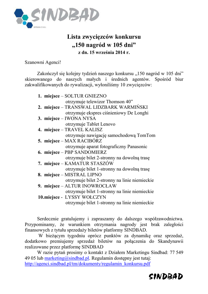 Lista zwycięzców konkursu „150 nagród w 105 dni” z dn. 15 września 2014 r. Szanowni Agenci! Zakończył się kolejny tydzień naszego konkursu „150 nagród w 105 dni” skierowanego do naszych małych i średnich agentów. Spośród biur zakwalifikowanych do rywalizacji, wyłoniliśmy 10 zwycięzców: 1. miejsce – SOLTUR GNIEZNO otrzymuje telewizor Thomson 40” 2. miejsce – TRANSWAL LIDZBARK WARMIŃSKI otrzymuje ekspres ciśnieniowy De Longhi 3. miejsce – IWONA NYSA otrzymuje Tablet Lenovo 4. miejsce – TRAVEL KALISZ otrzymuje nawigację samochodową TomTom 5. miejsce – MAX RACIBÓRZ otrzymuje aparat fotograficzny Panasonic 6. miejsce – PBP SANDOMIERZ otrzymuje bilet 2-stronny na dowolną trasę 7. miejsce – KAMATUR STASZÓW otrzymuje bilet 1-stronny na dowolną trasę 8. miejsce – MISTRAL LIPNO otrzymuje bilet 2-stronny na linie niemieckie 9. miejsce – ALTUR INOWROCŁAW otrzymuje bilet 1-stronny na linie niemieckie 10.miejsce - LYSSY WOŁCZYN otrzymuje bilet 1-stronny na linie niemieckie Serdecznie gratulujemy i zapraszamy do dalszego współzawodnictwa. Przypominamy, że warunkiem otrzymania nagrody jest brak zaległości finansowych z tytułu sprzedaży biletów platformy SINDBAD. W bieżącym tygodniu oprócz punktów za dynamikę oraz sprzedaż, dodatkowo premiujemy sprzedaż biletów na połączenia do Skandynawii realizowane przez platformę SINDBAD W razie pytań prosimy o kontakt z Działem Marketingu Sindbad: 77 549 49 05 lub [email protected]. Regulamin dostępny jest tutaj: http://agenci.sindbad.pl/tm/dokumenty/regulamin_konkursu.pdf SINDBAD