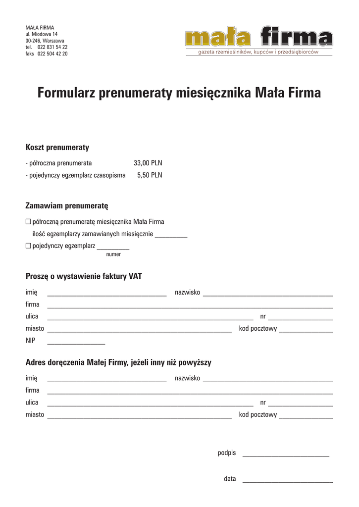 MAŁA FIRMA ul. Miodowa 14 00-246, Warszawa tel. 022 831 54 22 faks 022 504 42 20 Formularz prenumeraty miesięcznika Mała Firma Koszt prenumeraty - półroczna prenumerata 33,00 PLN - pojedynczy egzemplarz czasopisma 5,50 PLN Zamawiam prenumeratę półroczną prenumeratę miesięcznika Mała Firma ilość egzemplarzy zamawianych miesięcznie _________ pojedynczy egzemplarz _________ numer Proszę o wystawienie faktury VAT imię _________________________________ nazwisko ____________________________________ firma ________________________________________________________________________________ ulica _________________________________________________________ nr __________________ miasto ___________________________________________________ NIP kod pocztowy _______________ ________________ Adres doręczenia Małej Firmy, jeżeli inny niż powyższy imię _________________________________ nazwisko ____________________________________ firma ________________________________________________________________________________ ulica _________________________________________________________ nr __________________ miasto ___________________________________________________ kod pocztowy _______________ podpis ________________________ data _________________________
